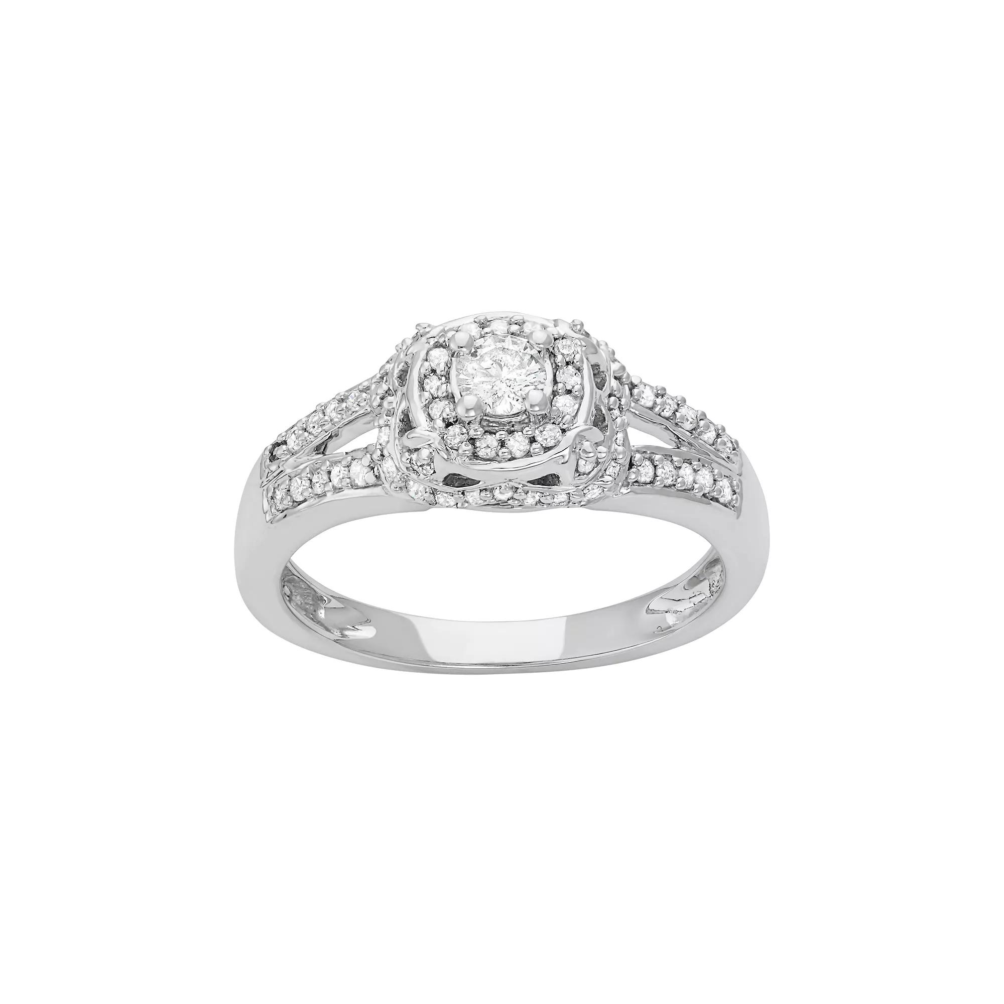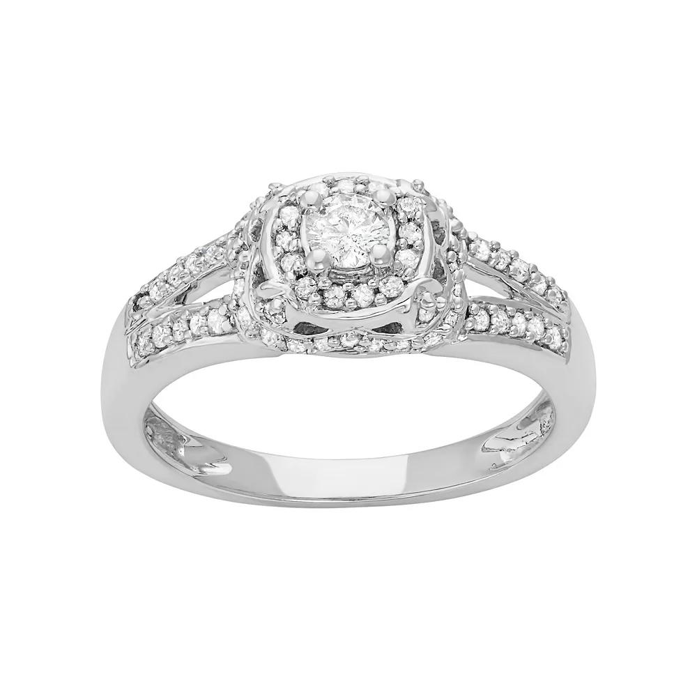 Beautifully designed, this diamond engagement ring celebrates your everlasting love. With round-cut diamonds set in a tiered halo motif, this engagement ring is truly stunning.RING DETAILSWidth: 8 mmMetal: rhodium-plated 14k white goldDIAMOND DETAILSTotal weight: 1/2 ct.Center stone weight: 1/5 ct.Shape: roundColor grade: H-IClarity: I1-I2Setting: prongImage(s) may be enlarged to show detail.Diamond weights are approximate. Diamond total weights may vary between .01 and .08 ct. Some diamonds have fewer than 17 facets.Please note, due to the high value of this item, a signature may be required upon delivery.Gemstones may have been treated to enhance their appearance. Special care may be required. Please visit our Gemstone Treatment & Special Care Guide for more information. Size: 9. Gender: female. Age Group: adult.