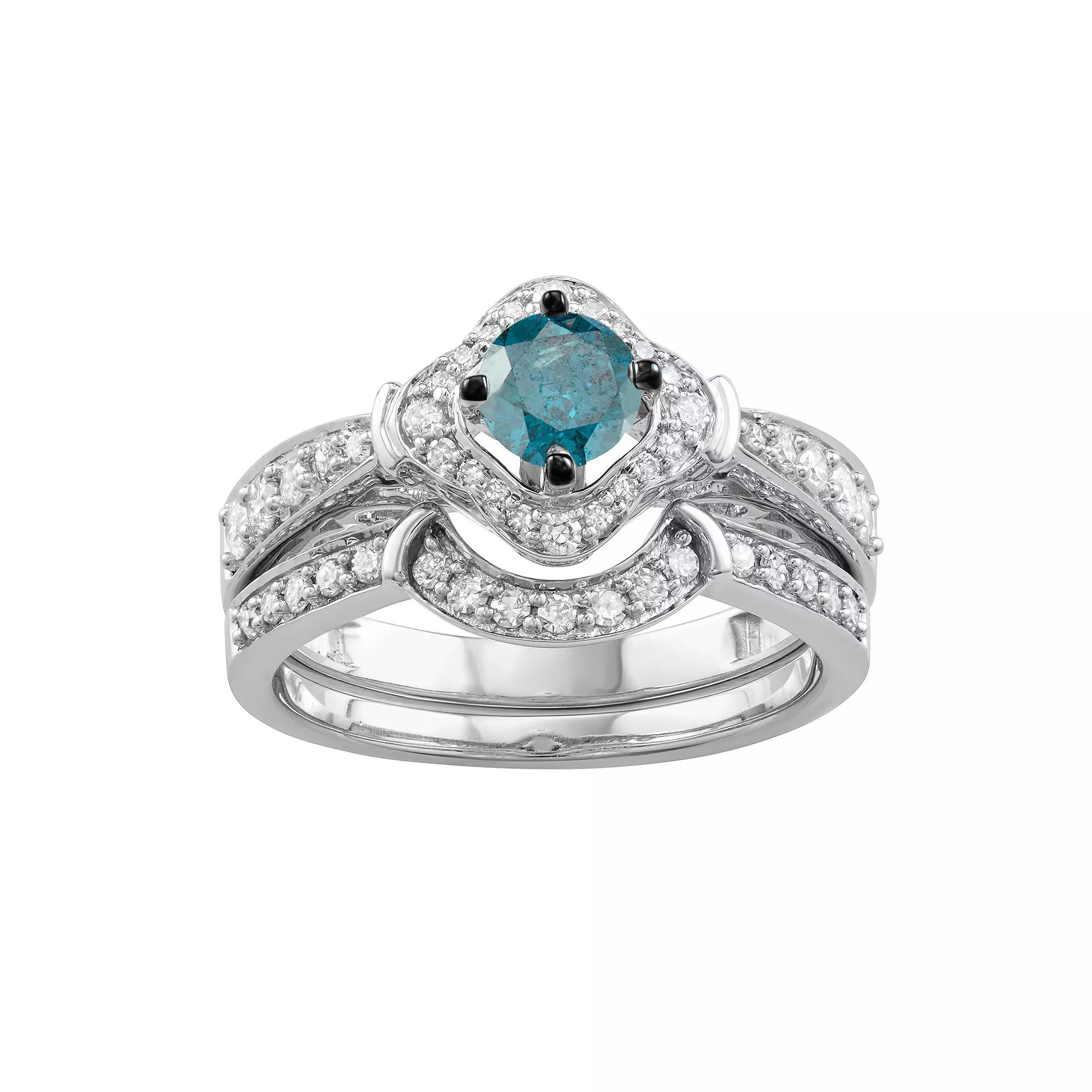Complete with an engagement ring and companion wedding ring, this blue and white diamond engagement ring set is a perfect choice for the modern bride. SET DETAILS Includes: engagement ring & wedding band Width: 0.47 in. Metal: 14k white gold Packaging: boxed DIAMOND DETAILS Total weight: 1 ct. Center stone weight: 1/2 ct. Color: white, blue Clarity: I1-I2 Color grade: H-I Shape: round Setting: prong Gemstones may have been treated to enhance their appearance. Special care may be required. Please visit our Gemstone Treatment & Special Care Guide for more information.Image(s) may be enlarged to show detail.Diamond weights are approximate. Diamond total weights may vary between .01 and .08 ct. Some diamonds have fewer than 17 facets.Please note, due to the high value of this item, a signature may be required upon delivery. Size: 5. Color: Multicolor. Gender: female. Age Group: adult.