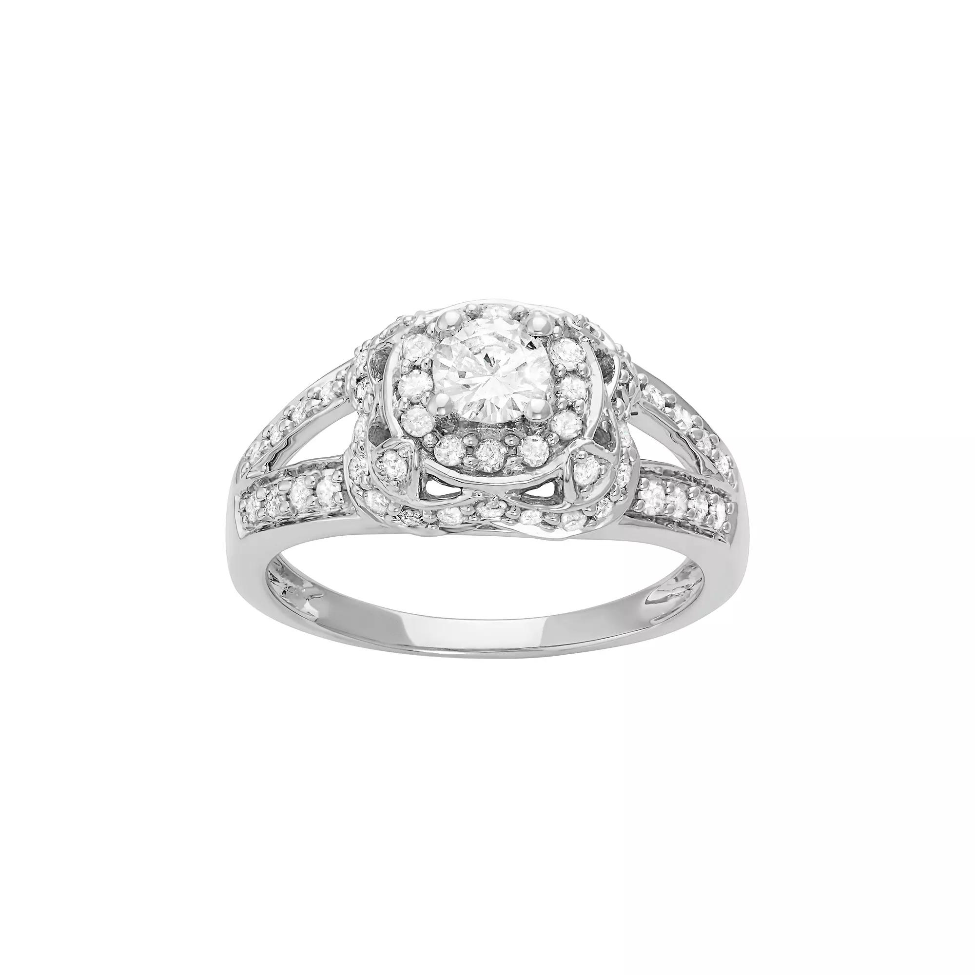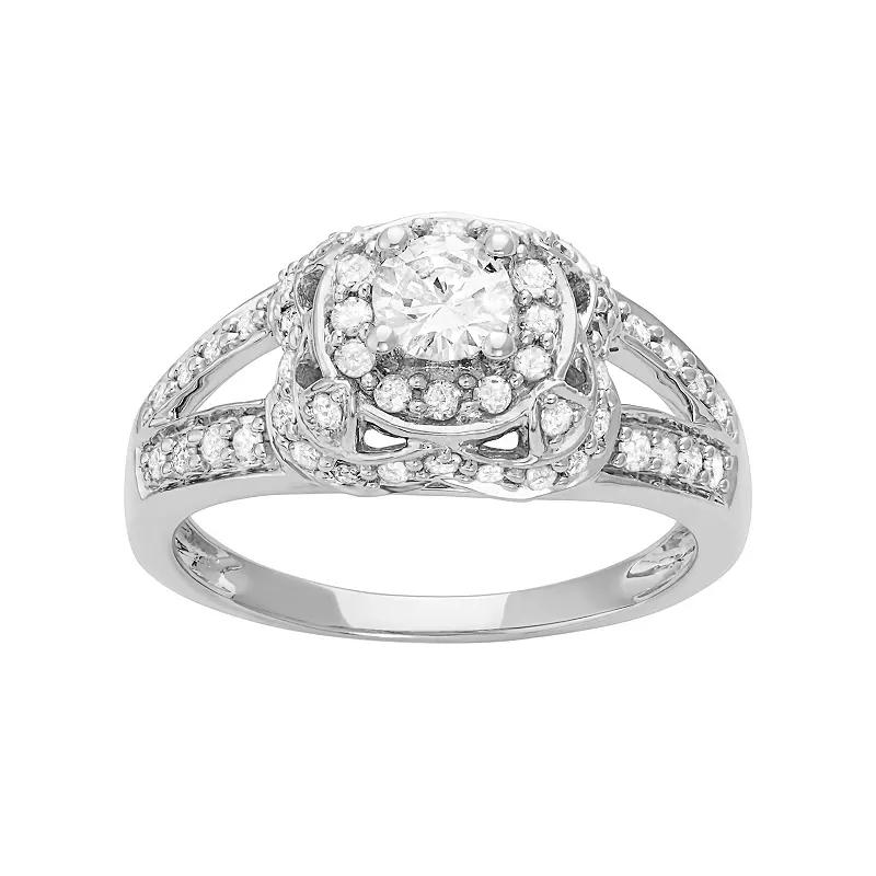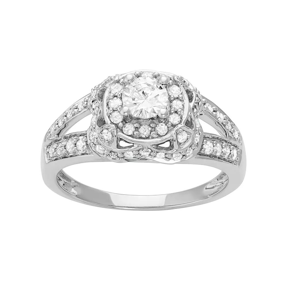 Exquisitely designed, this diamond engagement ring celebrates your unending love. With round-cut diamonds set in a tiered halo motif, this engagement ring is simply stunning.RING DETAILSWidth: 8 mmMetal: rhodium-plated 14k white goldDIAMOND DETAILSTotal weight: 1 ct.Center stone weight: 3/8 ct.Shape: roundColor grade: H-IClarity: I1-I2Setting: prongImage(s) may be enlarged to show detail.Diamond weights are approximate. Diamond total weights may vary between .01 and .08 ct. Some diamonds have fewer than 17 facets.Please note, due to the high value of this item, a signature may be required upon delivery.Gemstones may have been treated to enhance their appearance. Special care may be required. Please visit our Gemstone Treatment & Special Care Guide for more information. Gender: female. Age Group: adult.