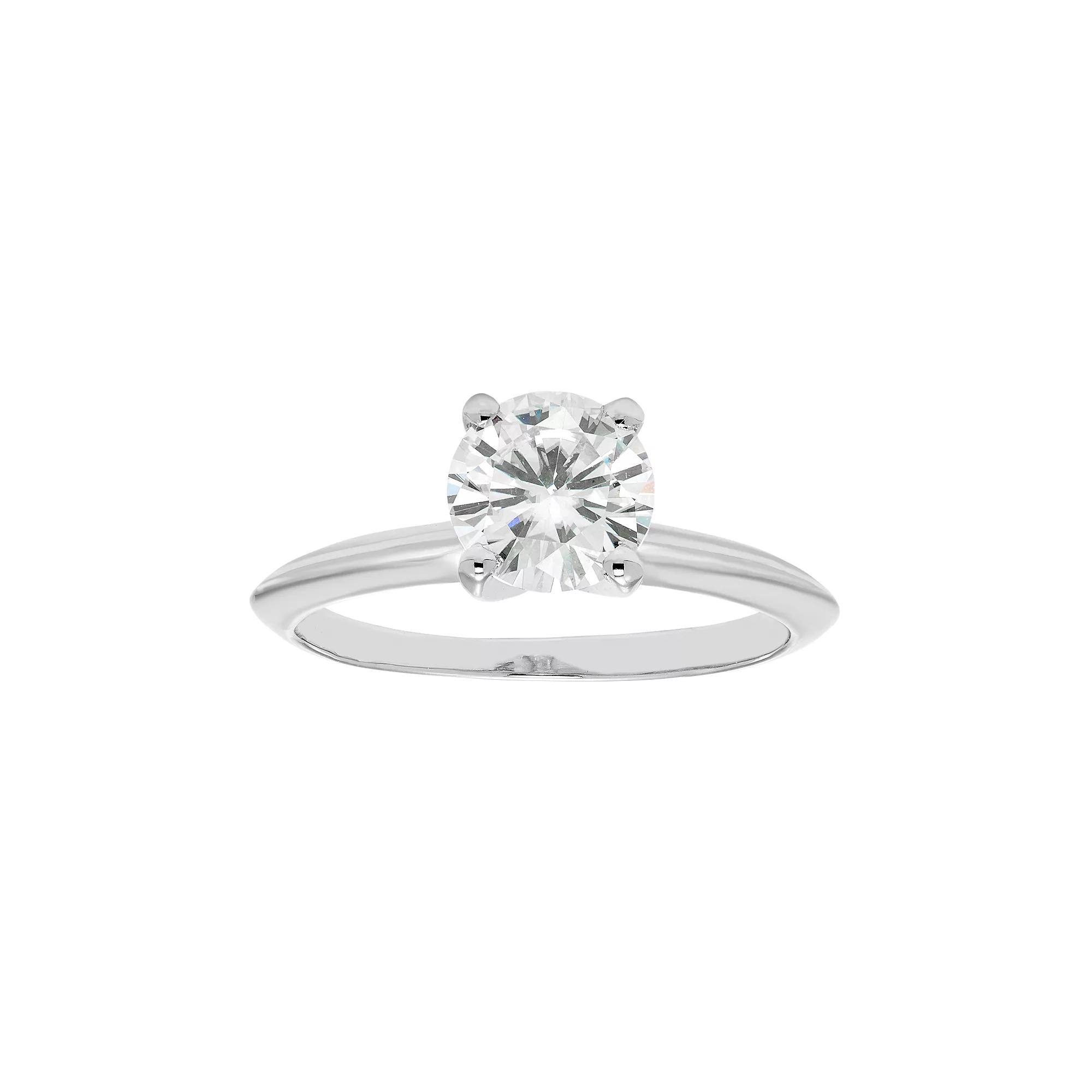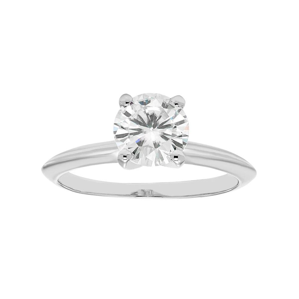 Accentuated with a round-cut, lab-created moissanite center stone, this engagement ring symbolizes your love in a magnificent way. Create a lifetime of memories together when you propose with this 14k white gold engagement ring. Click on this JEWELRY & WATCHES GUIDE to learn about fit, styles, materials and more! - https://www.kohls.com/feature/jewelry-guide.jsp. RING DETAILS. Width: 2 mm, Metal: 14k white gold, Packaging: boxed. STONE DETAILS. Stone type: lab-created moissanite, Diamond equivalent total weight: 1 ct., Shape: round, Setting: prong. Gemstones may have been treated to enhance their appearance. Special care may be required. Please visit our. Gemstone Treatment & Special Care Guide. - https://www.kohls.com/sale-event/gemstone-care-product-guide.shtml for more information. Diamond equivalent carat (ct.) Total Weight (T.W.) represents the approximate total weight of diamonds of equivalent appearance. Please note, due to the high value of this item, a signature may be required upon delivery. Size: 4. Gender: female. Age Group: adult. Material: 14 KT GOLD.