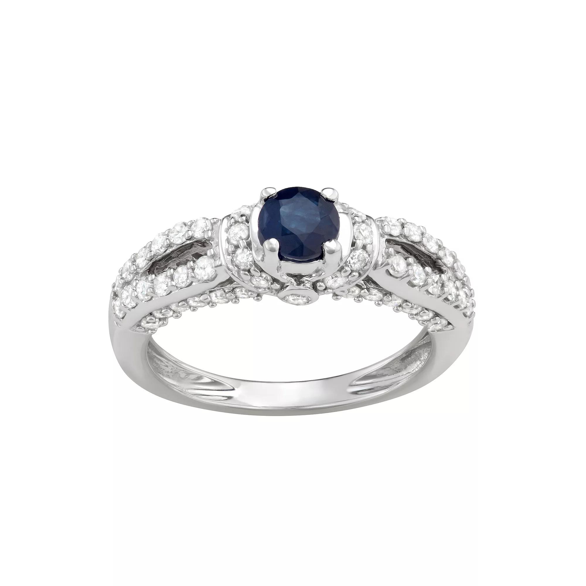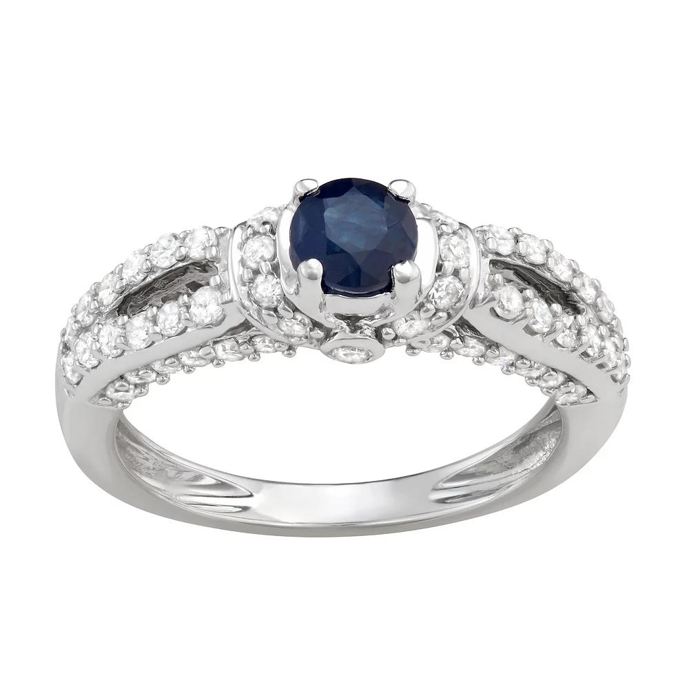 She'll love the effortless style of this 14k white gold sapphire and diamond engagement ring. She'll love the effortless style of this 14k white gold sapphire and diamond engagement ring. Width: 5.8 mm Metal: 14k white gold Finish: polished Packaging: boxedSTONE DETAILS Stone type: sapphire Center stone weight: 3/8 ct. Center stone size: 4.5 mm x 4.5 mm Shape: round Setting: prongDIAMOND DETAILS Total weight: 5/8 ct. Shape: round Setting: prong Clarity: I1-I2 Gemstones may have been treated to enhance their appearance. Special care may be required. Please visit our Gemstone Treatment & Special Care Guide for more information. Please note, due to the high value of this item, a signature may be required upon delivery. Diamond weights are approximate. Diamond total weights may vary between .01 and .08 ct. Some diamonds have fewer than 17 facets. Image(s) may be enlarged to show detail. Color: Blue. Gender: female. Age Group: adult.