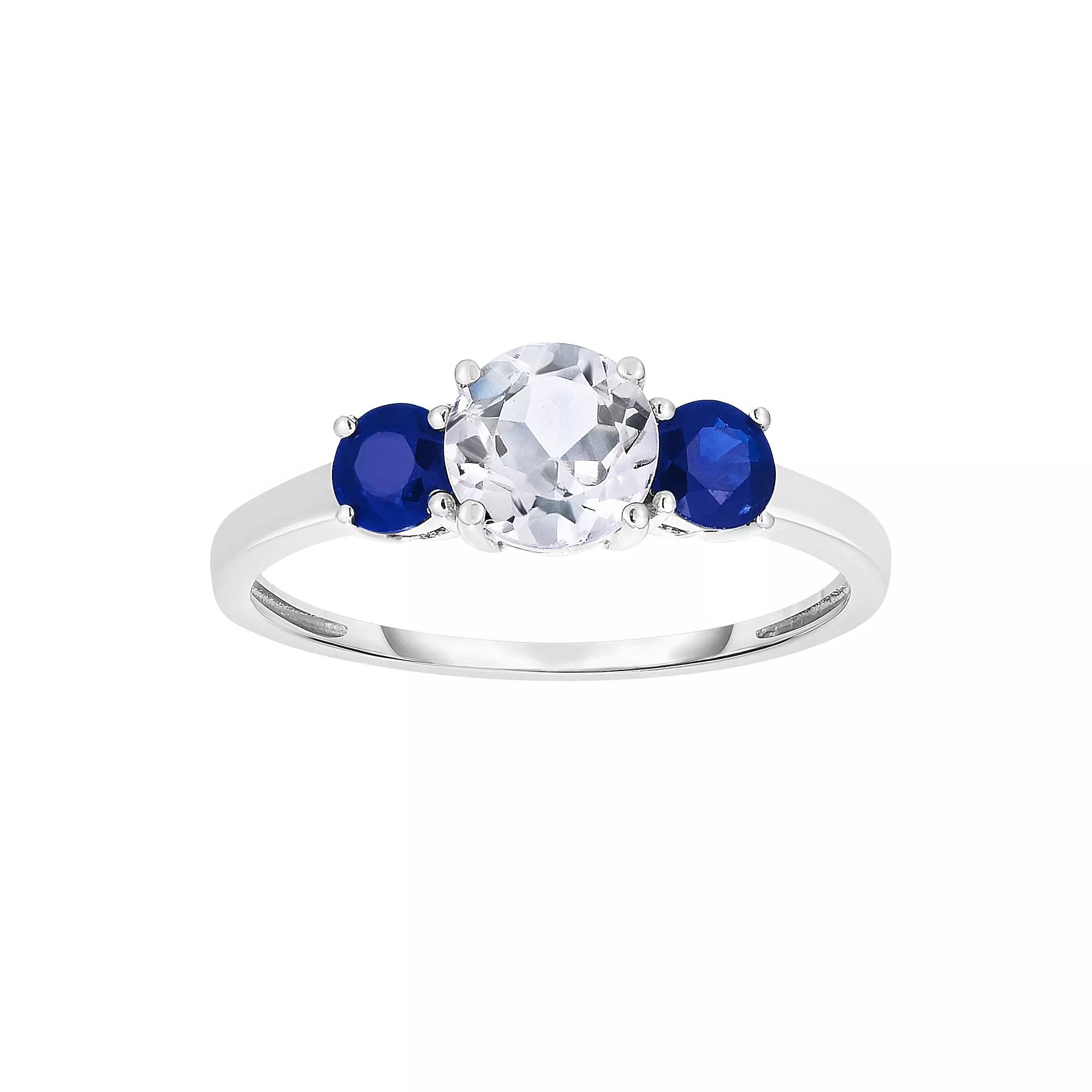 Dazzling with a round-cut white topaz stone flanked by two sapphires, this 14k white gold ring exudes elegance. Dazzling with a round-cut white topaz stone flanked by two sapphires, this 14k white gold ring exudes elegance. Width: 19.5 mm Metal: 14k white gold Plating: rhodium Finish: polished Packaging: boxedSTONE DETAILS Stone type: white topaz, sapphire Total weight: 1 1/2 ct. Center stone weight: 9/10 ct. Center stone size: 6 mm x 6 mm Shape: round Setting: prong Gemstones may have been treated to enhance their appearance. Special care may be required. Please visit our Gemstone Treatment & Special Care Guide for more information. Please note, due to the high value of this item, a signature may be required upon delivery. Size: 7. Gender: female. Age Group: adult.