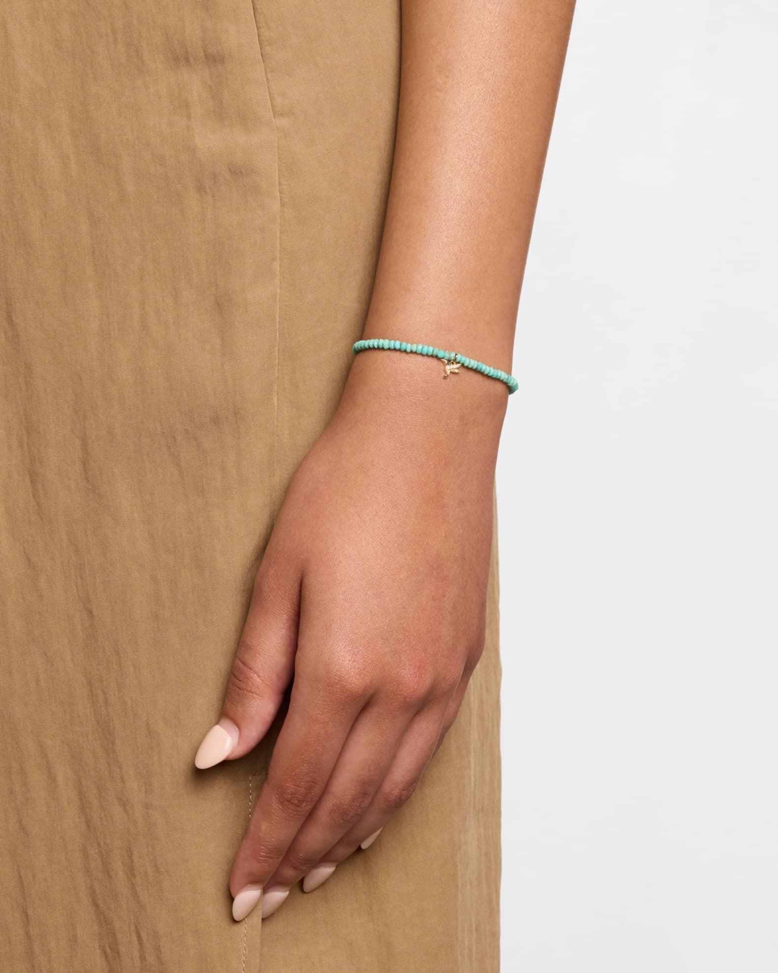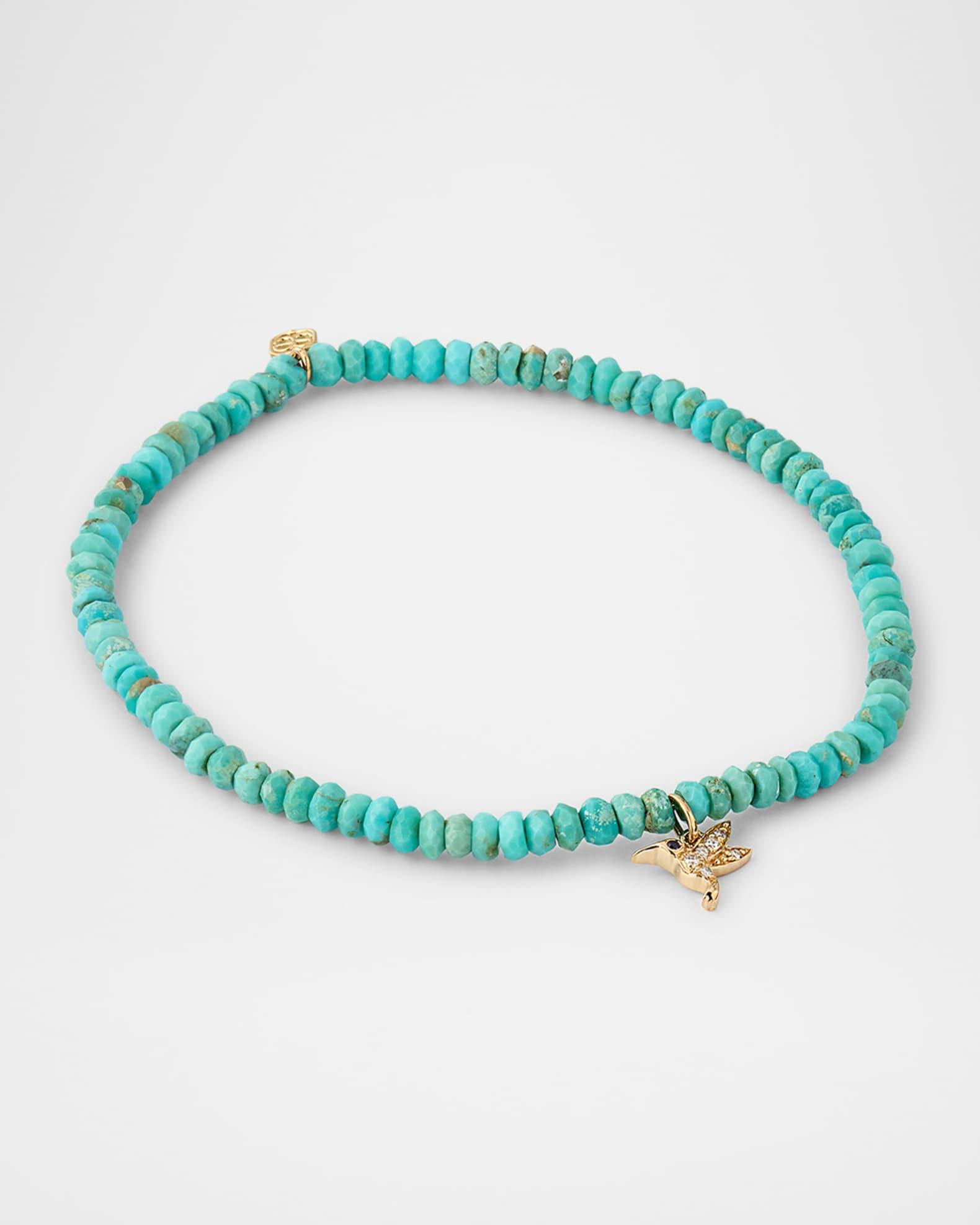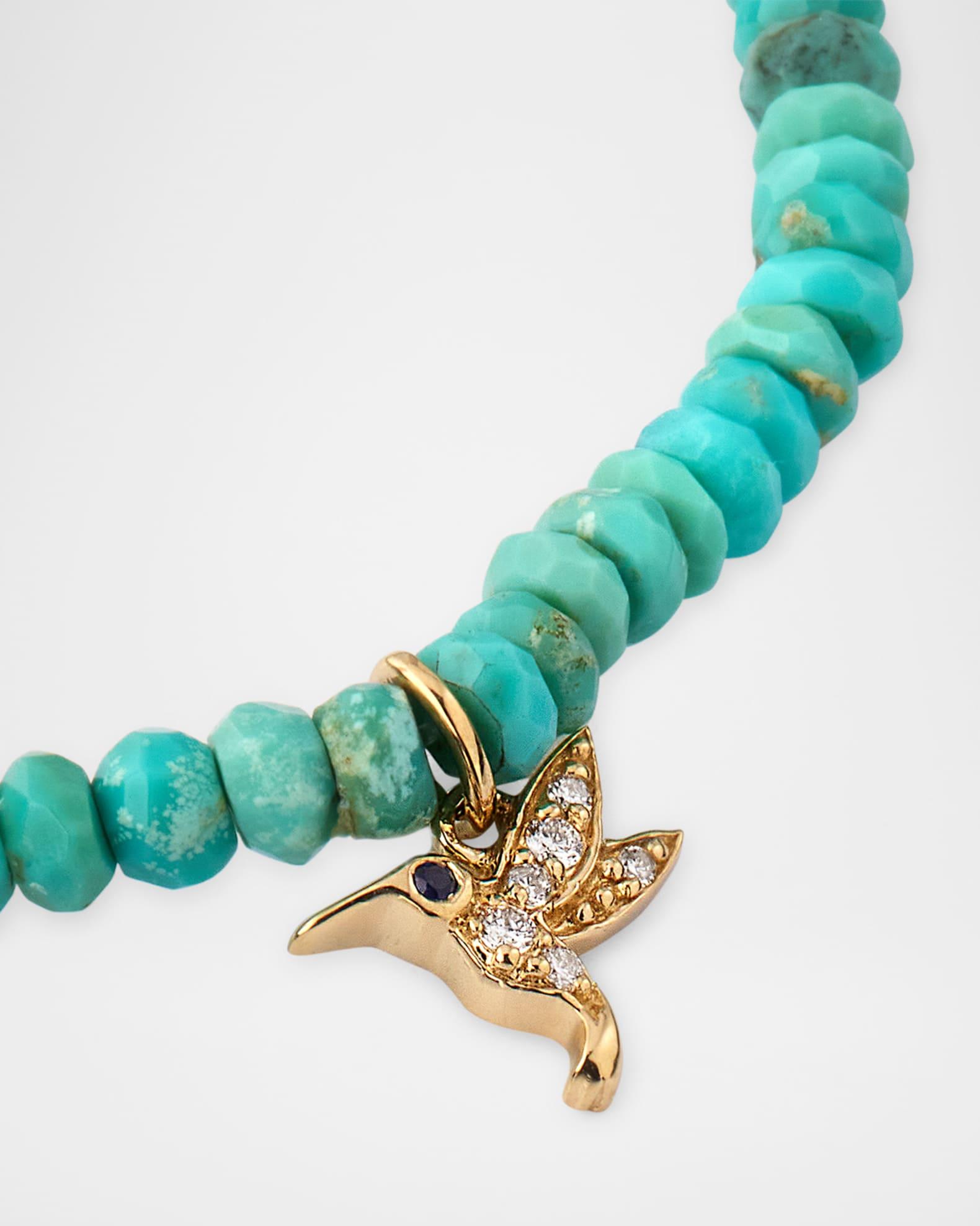 14K Yellow Gold Tiny Hummingbird Diamond Charm and Arizona Turquoise Bead Bracelet