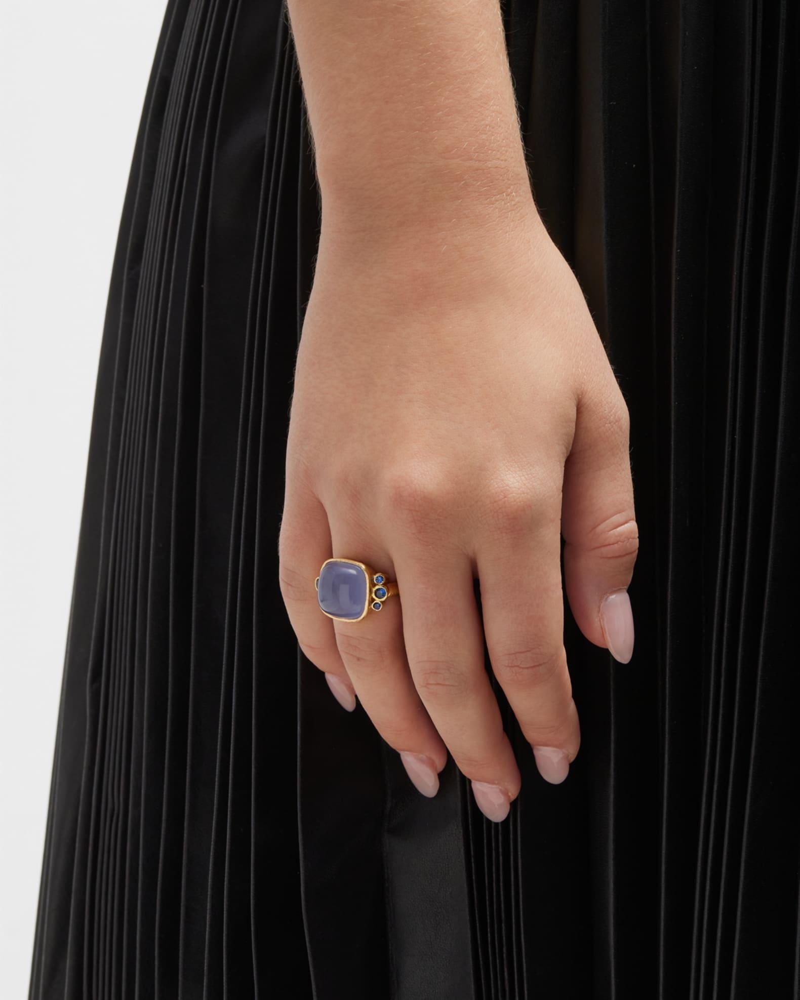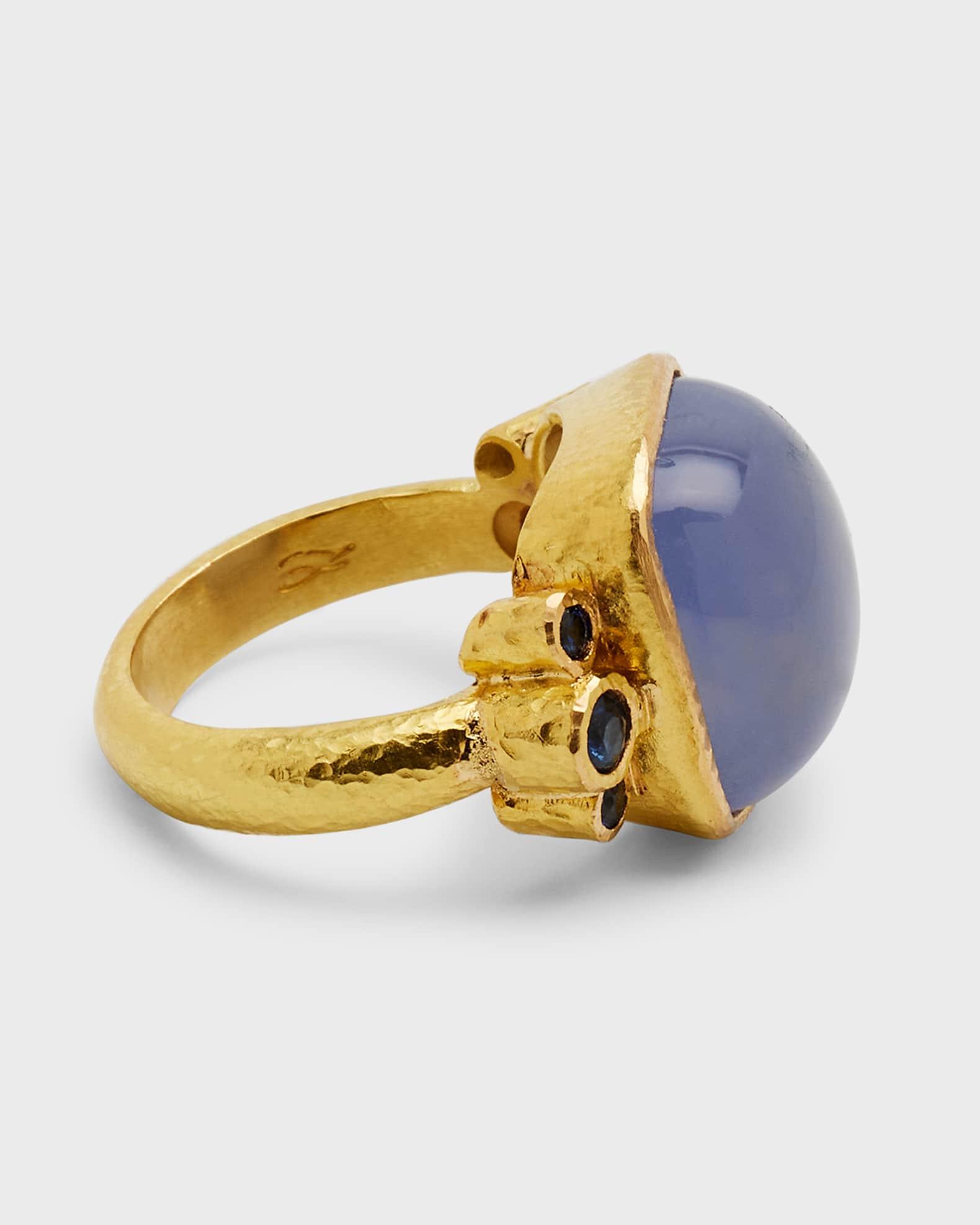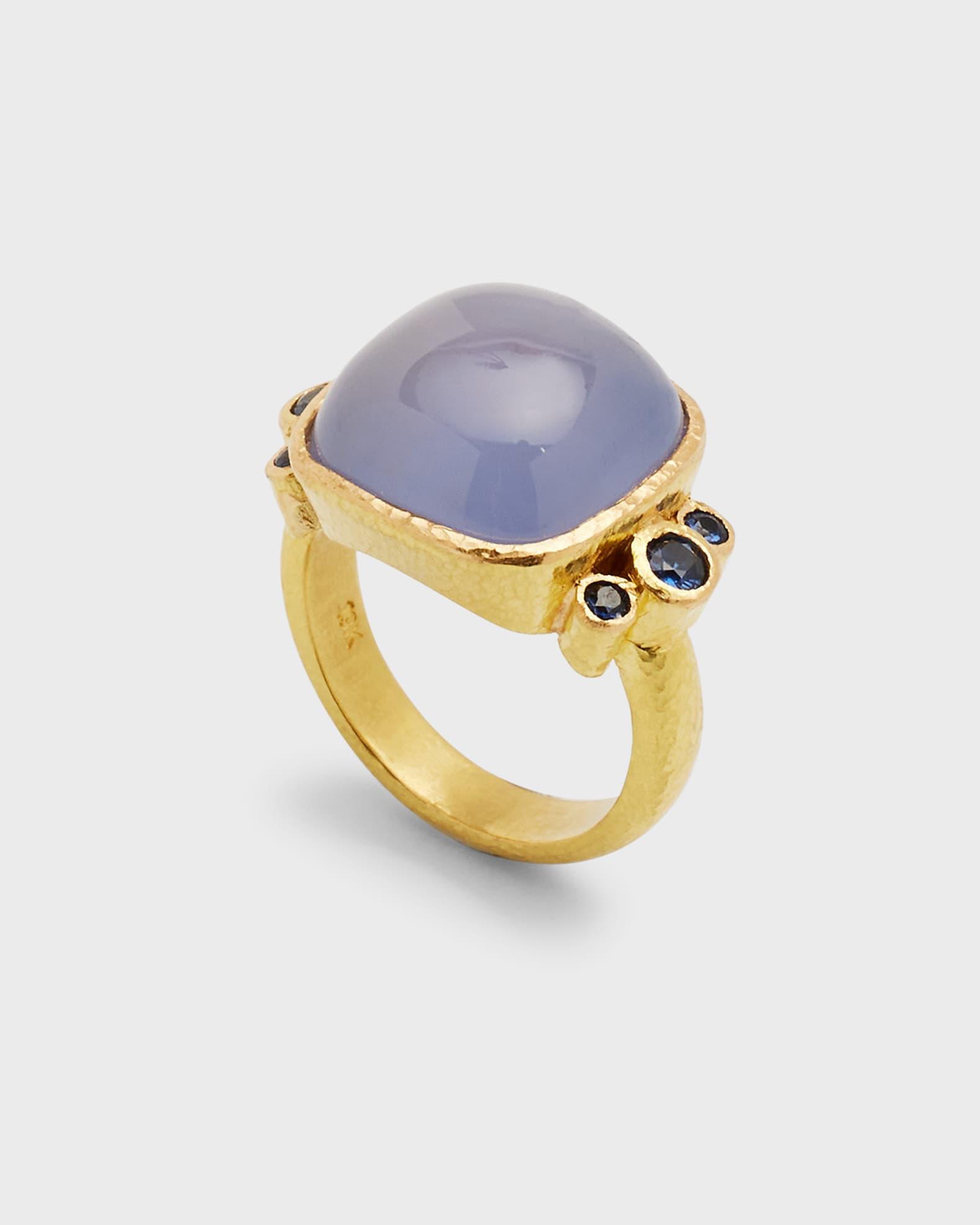 Elizabeth Locke ring Approx. size 6.5; 0.86" long x 0.59" wide Signature 19-karat yellow gold 14mm blue chalcedony cushion 3mm and 2mm blue sapphires Chalcedony total carat weight: 11.6 Sapphire total carat weight: 0.44 Imported