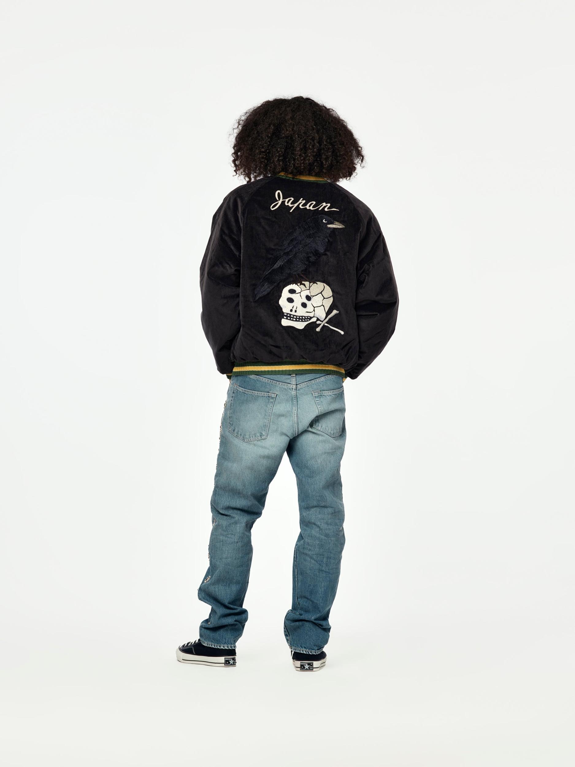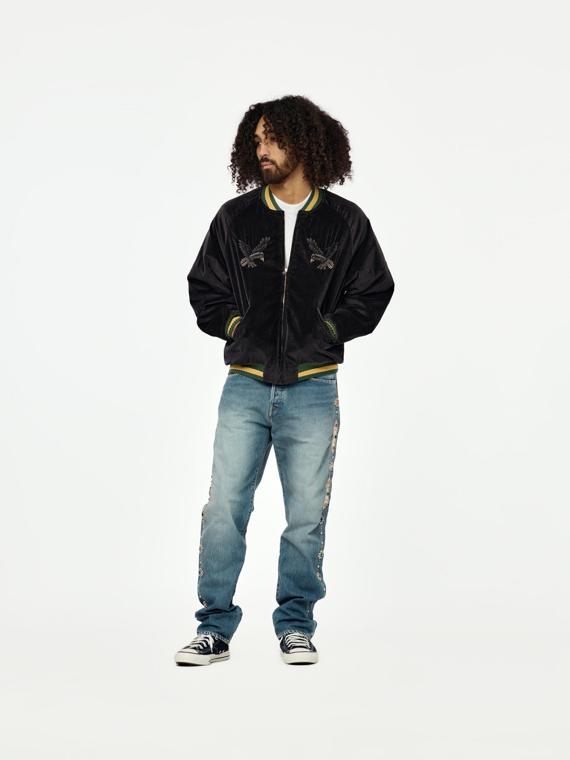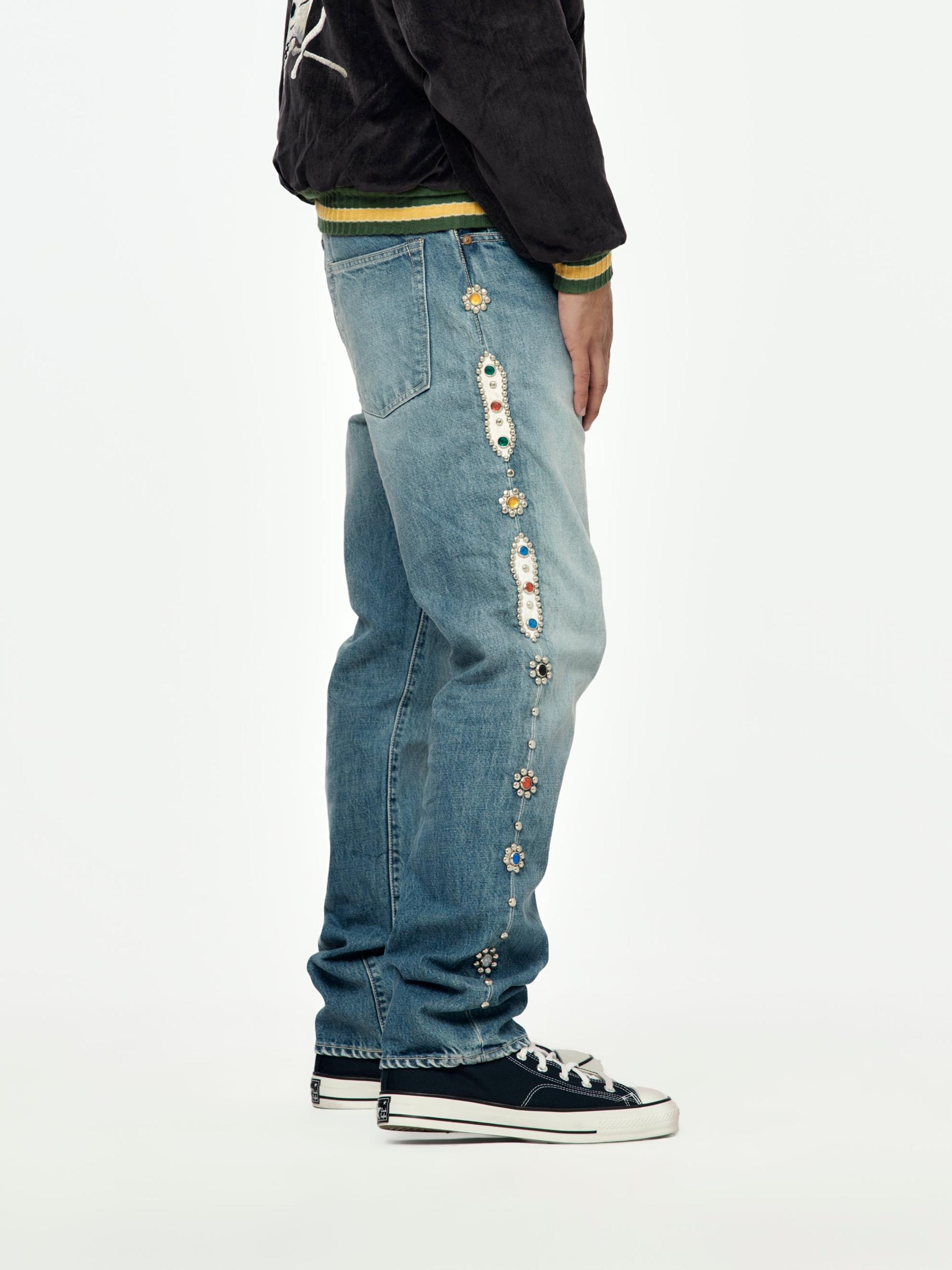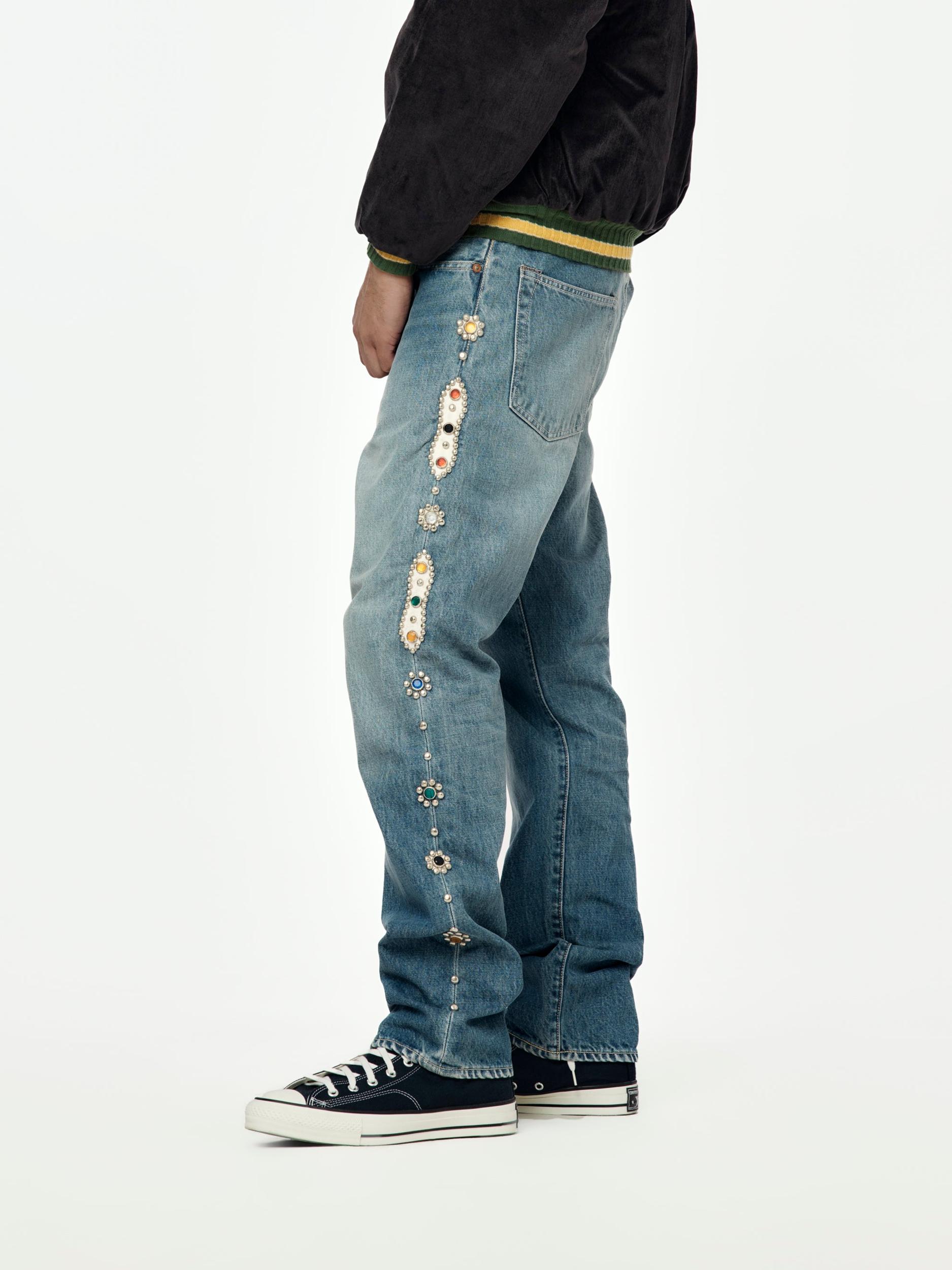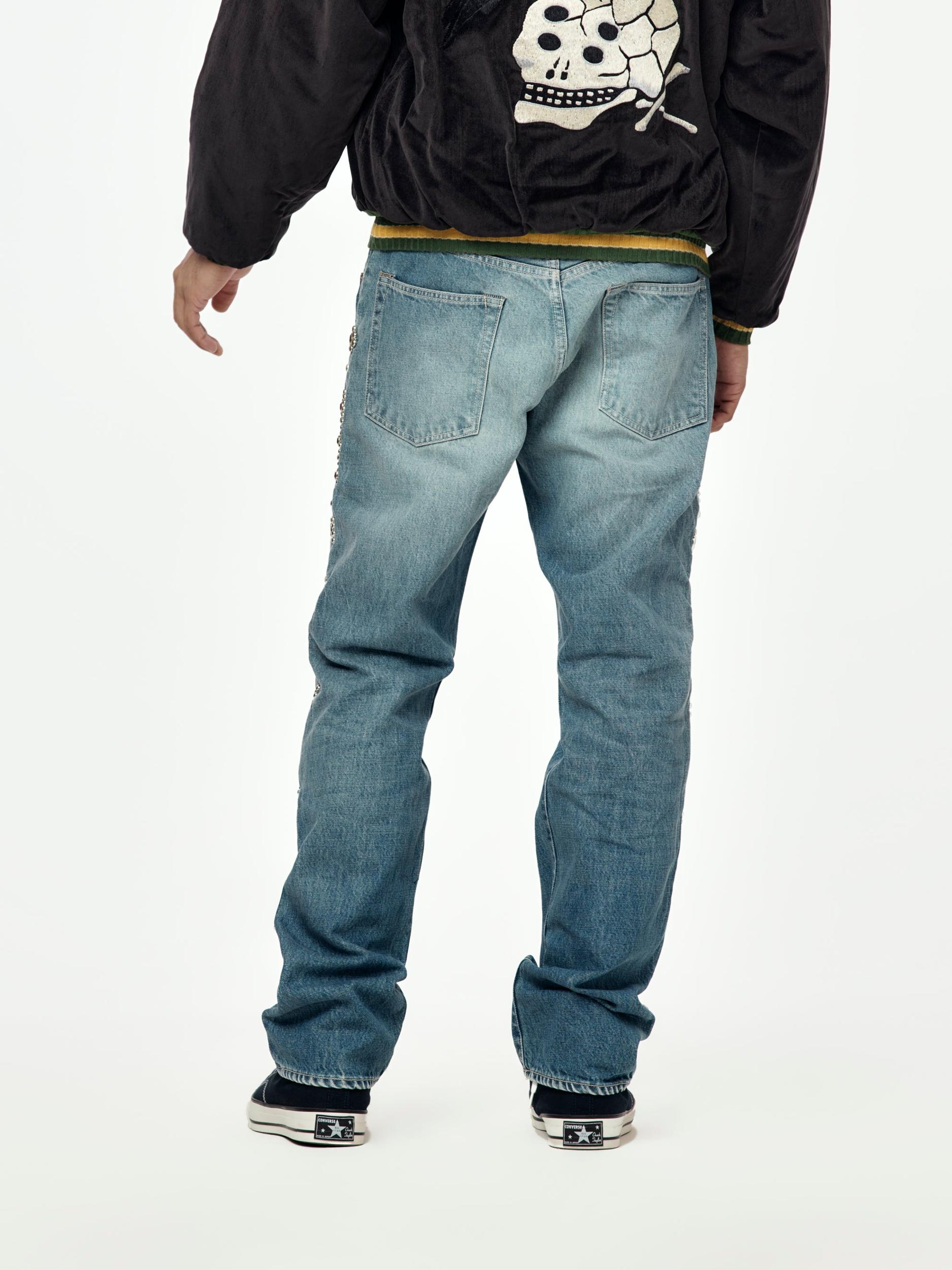 Kapital’s 14oz denim MONKEY CISCO jeans bring vintage attitude with studs on both sides and a tapered silhouette. Each pair is uniquely remade with intentional distressing for an authentic worn-in look. IDG dye may transfer, and natural leather details can bleed with wear. Crafted in Japan, these jeans fuse bold design with Kapital’s renowned craftsmanship. Made in Japan. SKU: EK-1174LPA