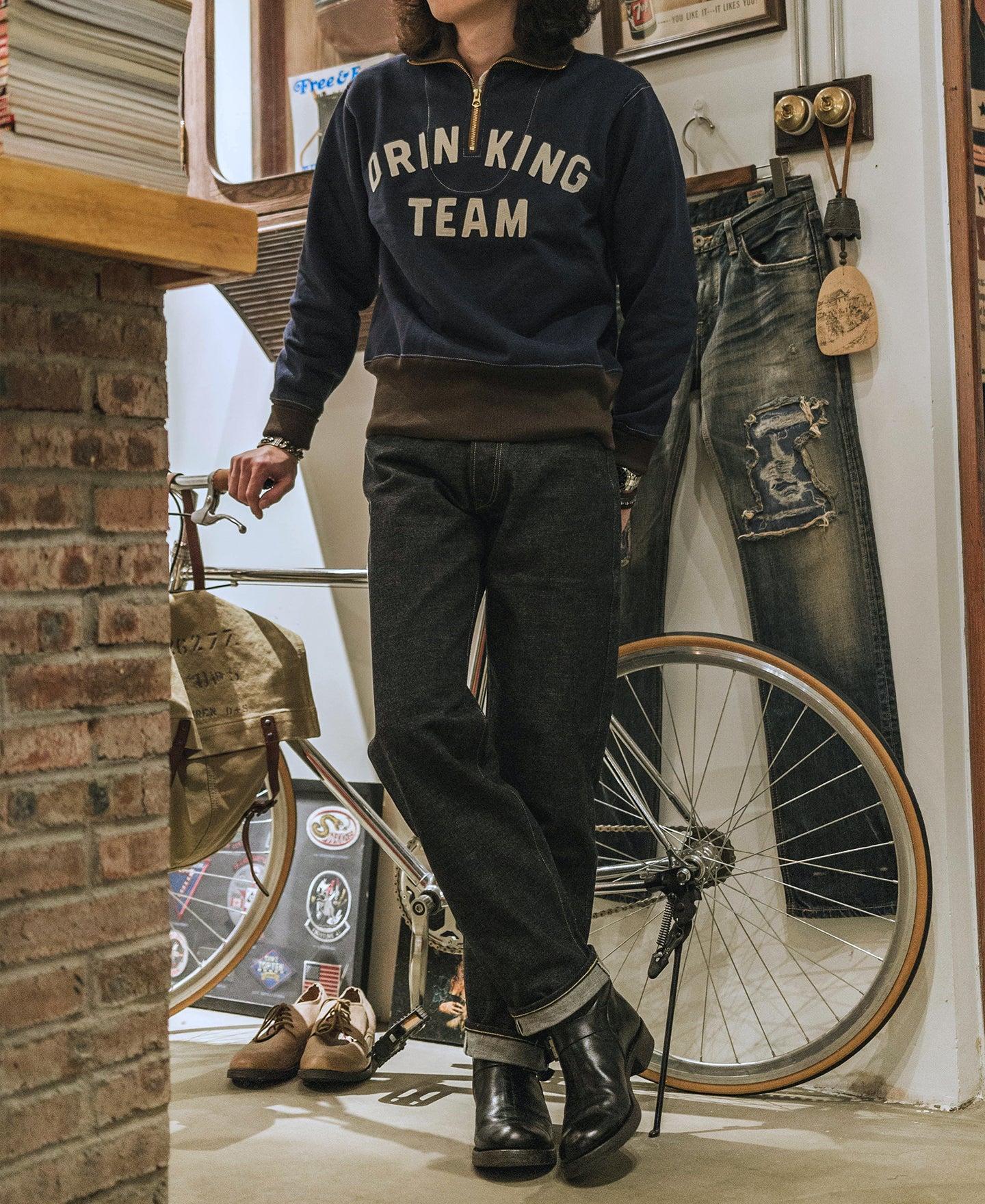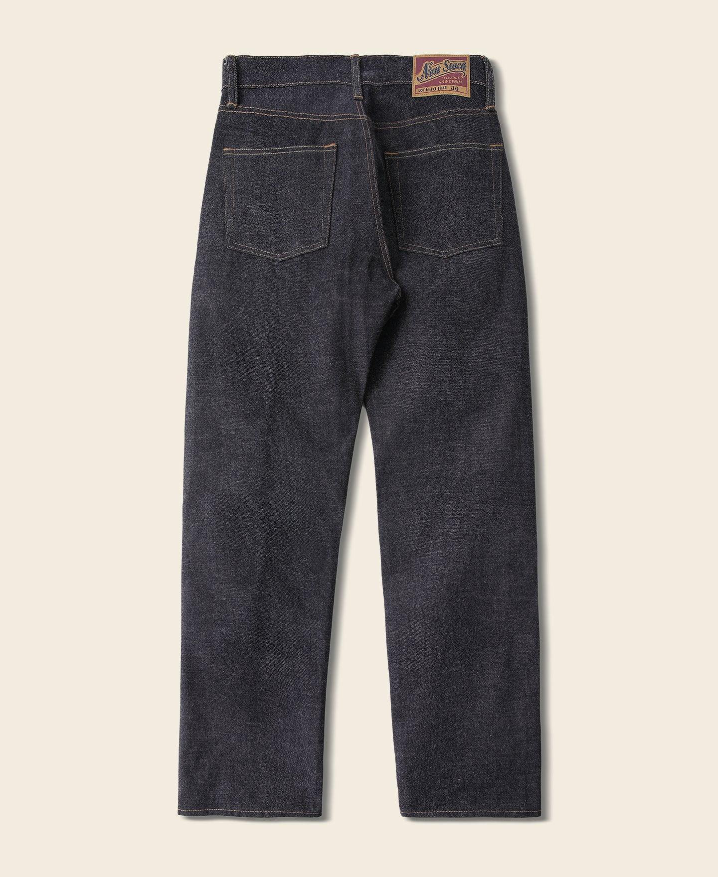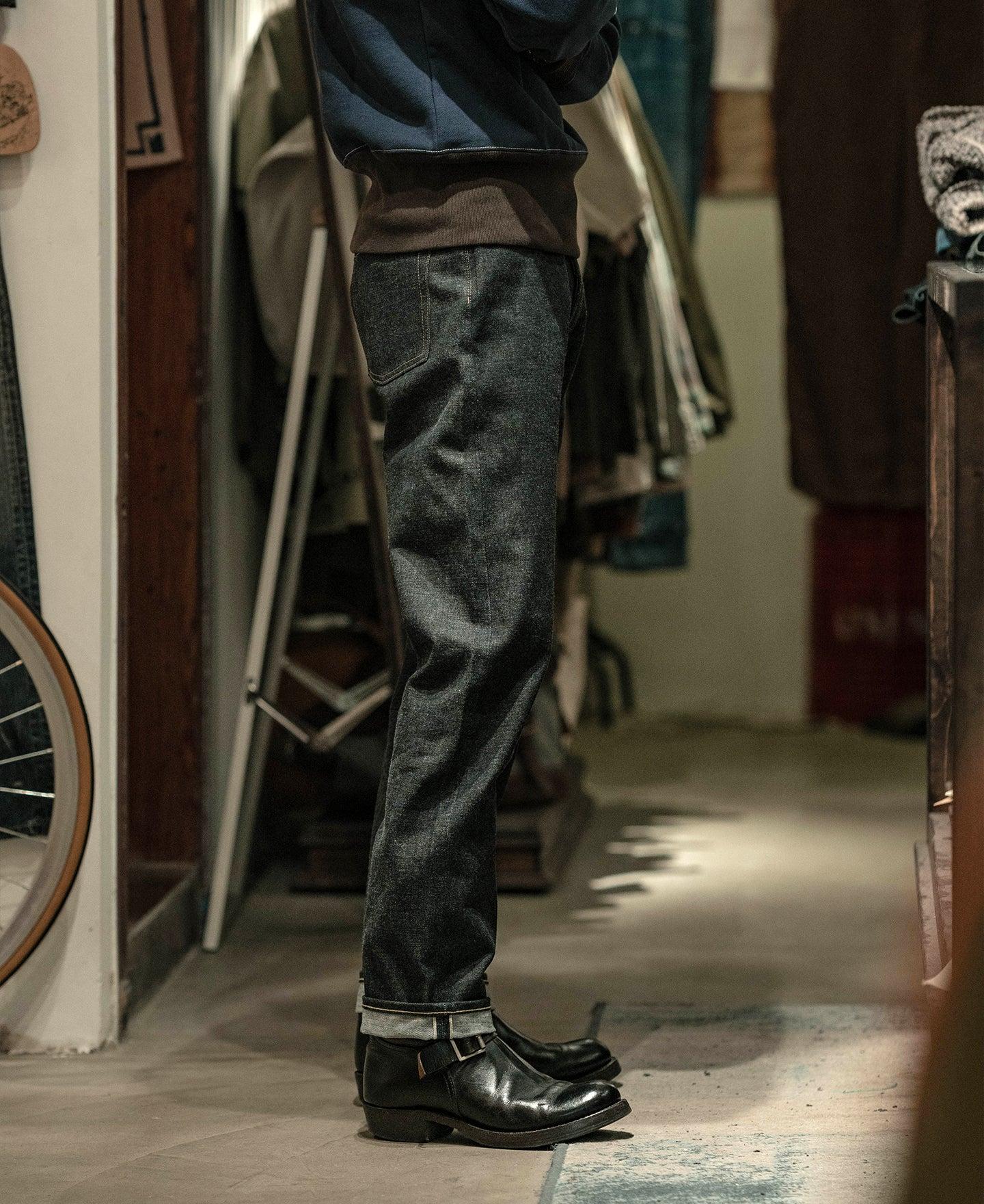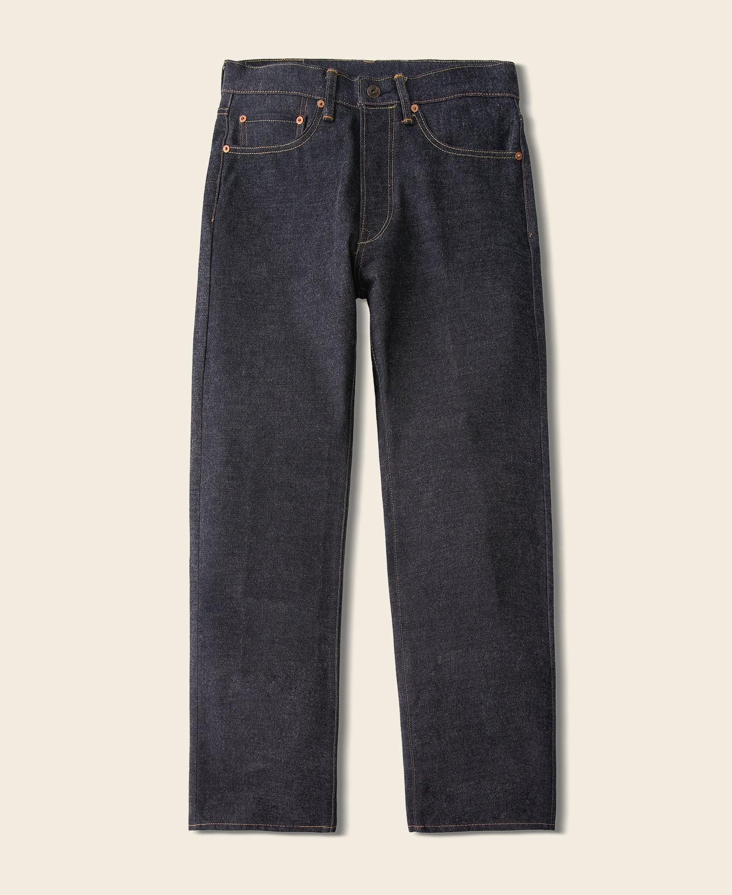 Model wears raw denim sized based on one-wash measurements for an accurate fit.
