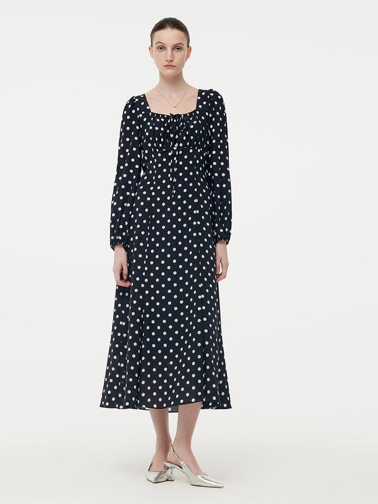 -16MM mulberry silk -X-line fit -Skin-friendly Gracefully flowy and effortlessly elegant, this dress is crafted from 16MM mulberry silk for a soft, breathable, and skin-friendly feel. Elastic details at the neckline and cuffs, along with adjustable tie straps, ensure a perfect fit and comfort. The X-shaped silhouette a