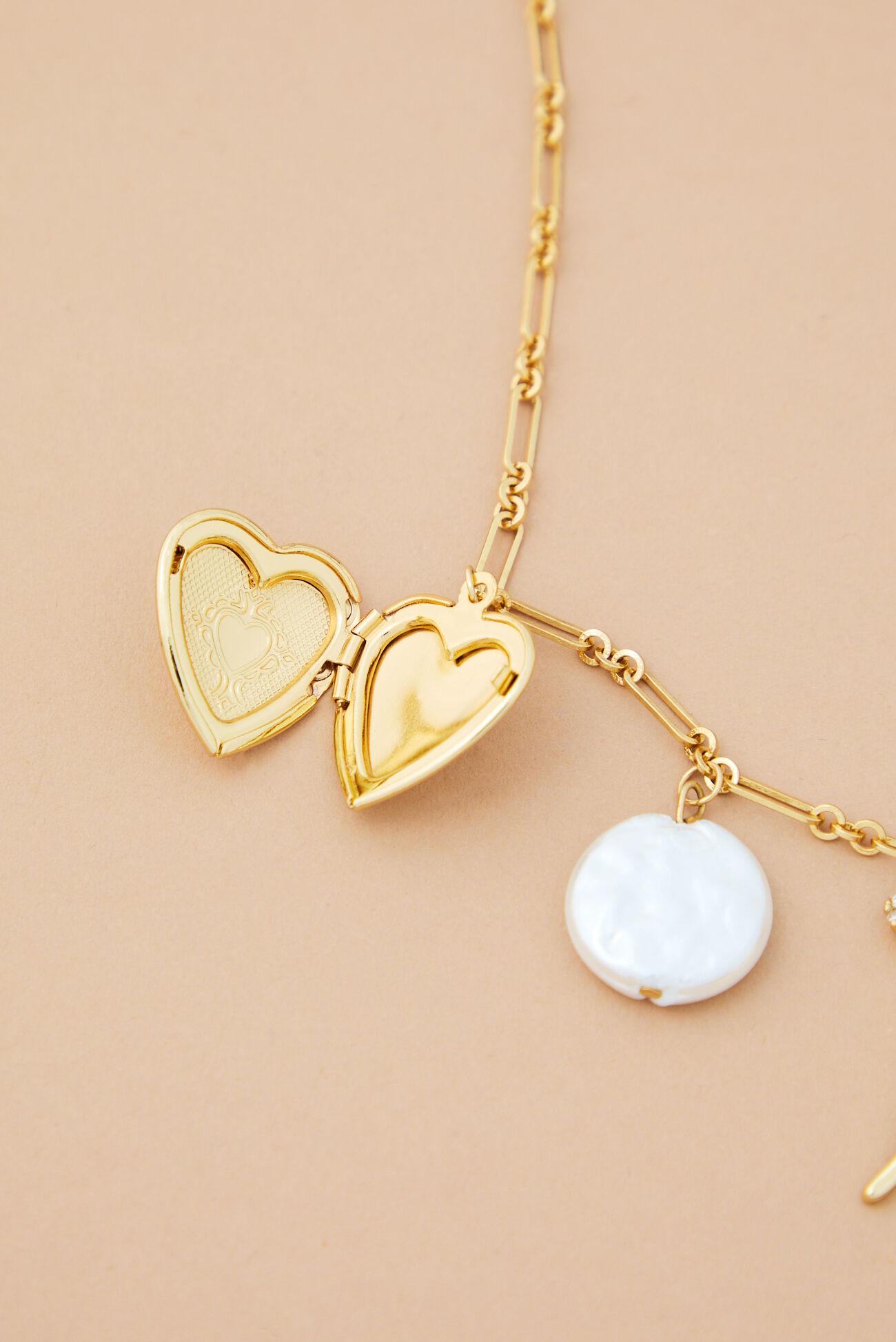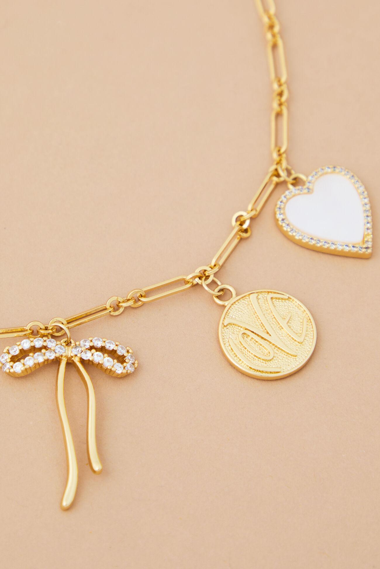 This charm necklace is a beautiful tribute to love, featuring a collection of meaningful symbols including a delicate bow, a loving heart, a treasured heart locket, an iridescent mother-of-pearl charm, and a word charm spelling out "love." It's the perfect gift for someone special, or a lovely way to express your own self-love.