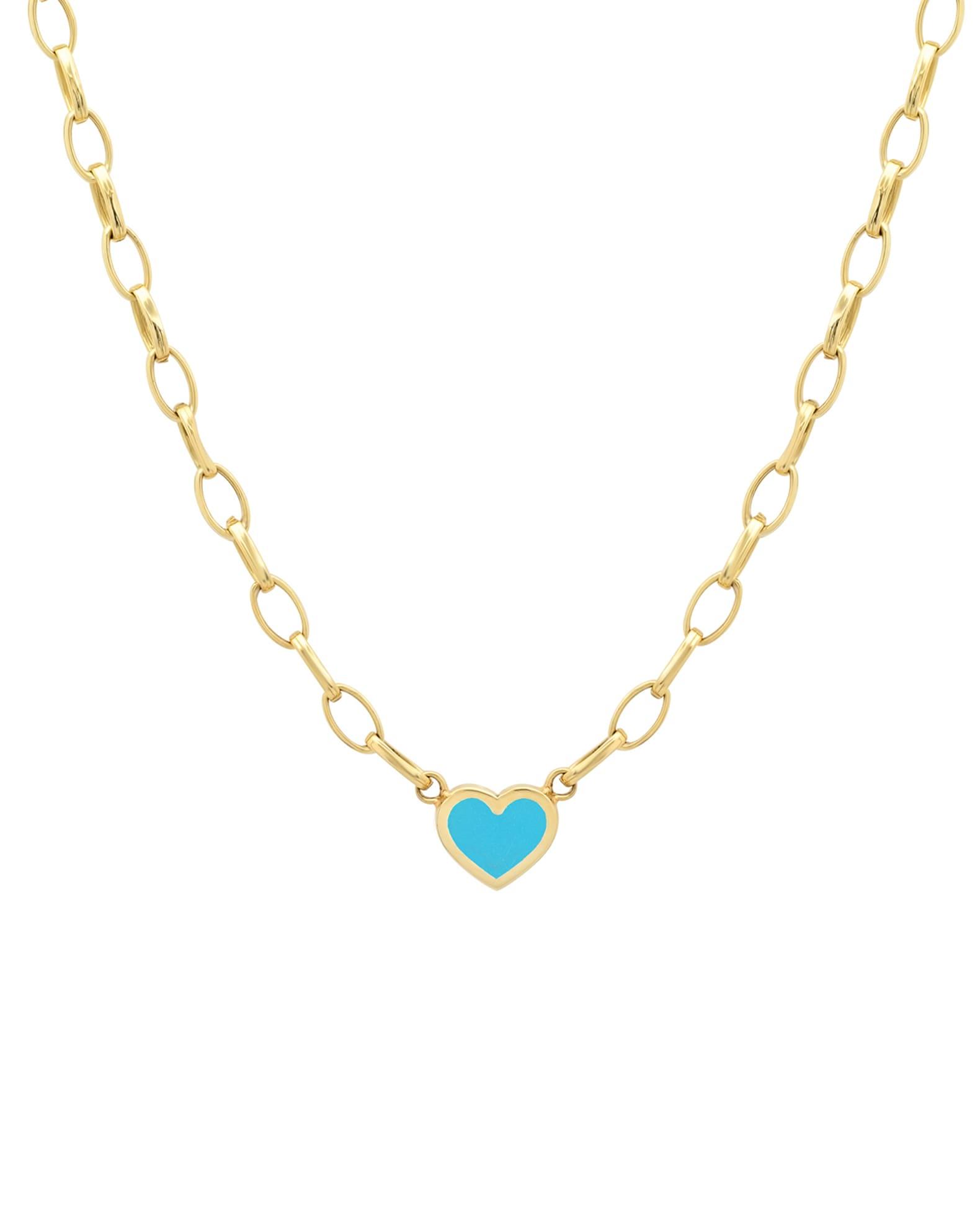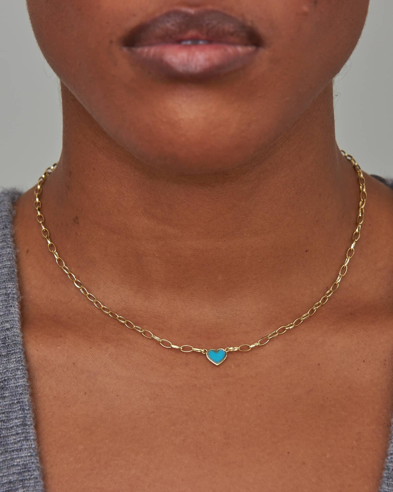 Jennifer Meyer heart-shaped pendant chain necklace. Polished 18-karat yellow gold hardware. Heart-shaped turquoise or lapis pendant. Pendant, approx. 0.26" x 0.30" x 0.07". Approx. 15"L. Lobster clasp. Made in USA.