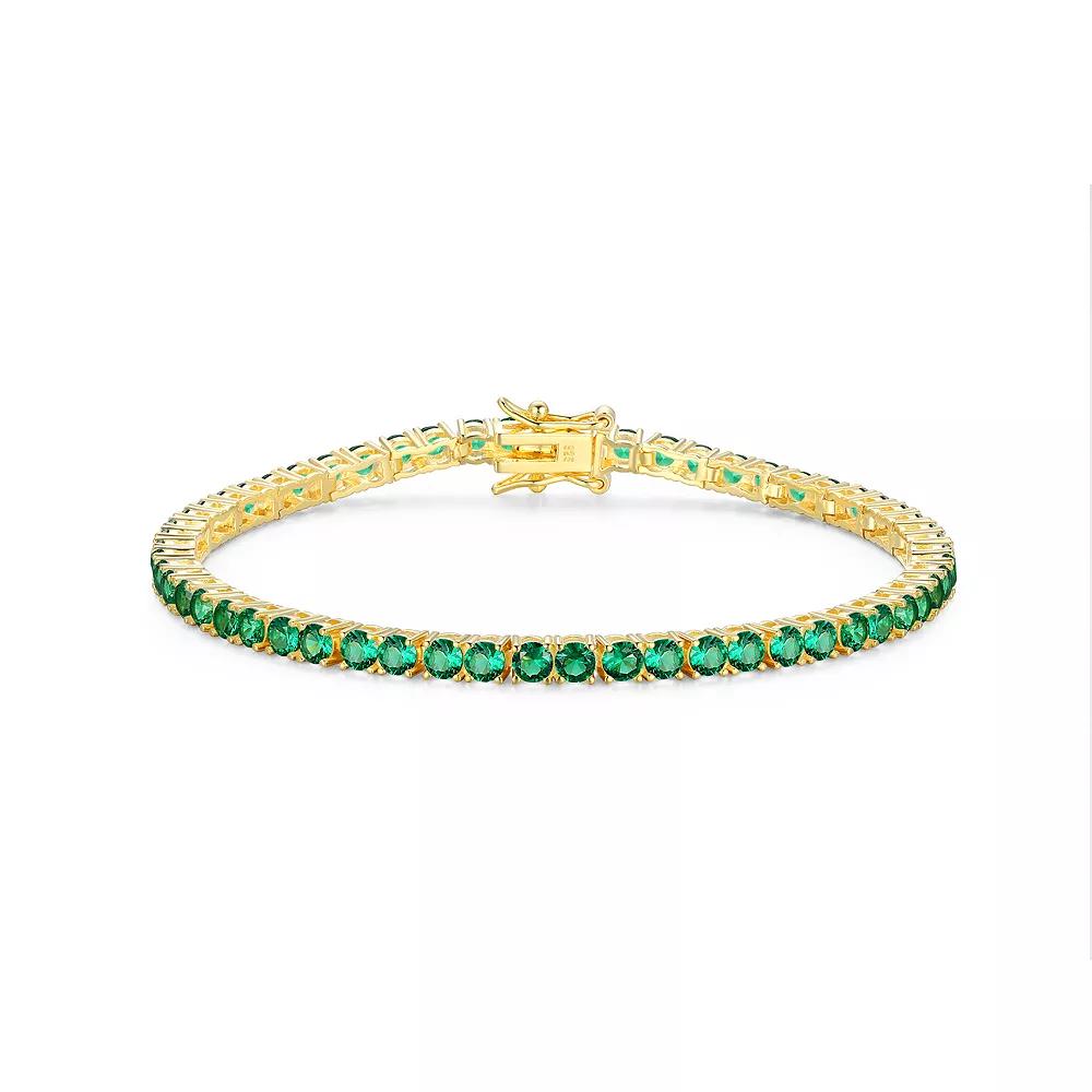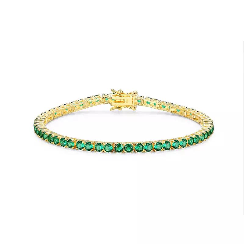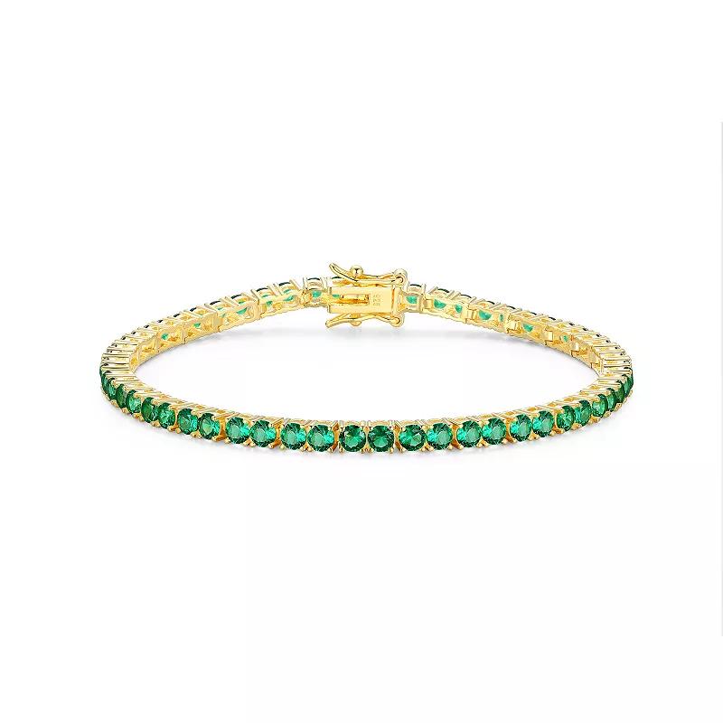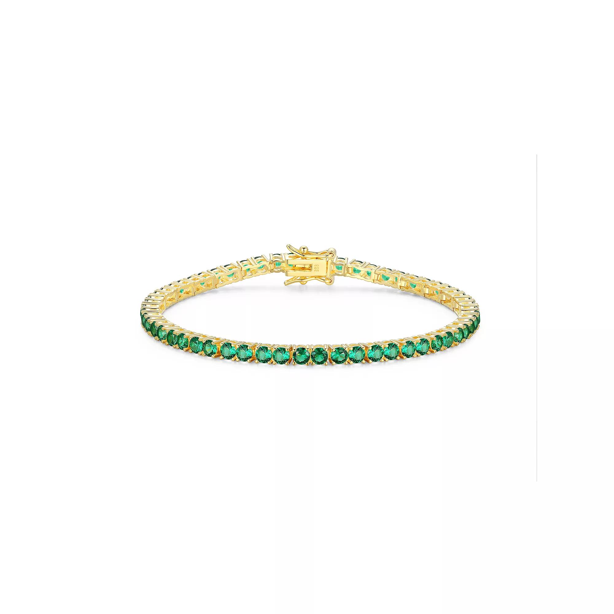 Give the perfect birthday gift with this 18k gold plated birthstone tennis bracelet. Click on this JEWELRY & WATCHES GUIDE to learn about fit, styles, materials and more! Give the perfect birthday gift with this 18k gold plated birthstone tennis bracelet. Click on this JEWELRY & WATCHES GUIDE to learn about fit, styles, materials and more! FEATURES Length: 7.25 in. Clasp: box Nickel safe Metal: sterling silver Plating: 18k gold Finish: polished ImportedSTONE DETAILS Shape: round Setting: prong Gemstones may have been treated to enhance their appearance. Special care may be required. Please visit our Gemstone Treatment & Special Care Guide for more information. Size: 7.25. Color: Synthetic Emerald May. Gender: female. Age Group: adult. Material: Gold Over Sterling.