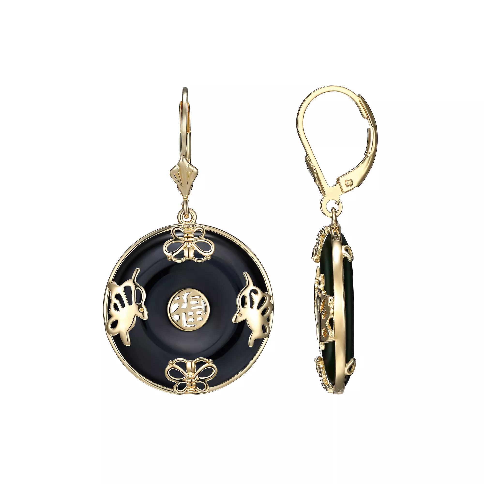 Elegantly decorated with flower and butterfly details, and the Chinese symbol for "good fortune," these black agate earrings beautifully complement your wardrobe. Elegantly decorated with flower and butterfly details, and the Chinese symbol for "good fortune," these black agate earrings beautifully complement your wardrobe. Length: 1 7/16 in. Closures: leverback Metal: sterling silver Plating: 18k gold Finish: polished Packaging: boxedSTONE DETAILS Center stone size: 20 mm x 5 mm Shape: cabochon, round Gender: female. Age Group: adult. Material: Gold Over Sterling.