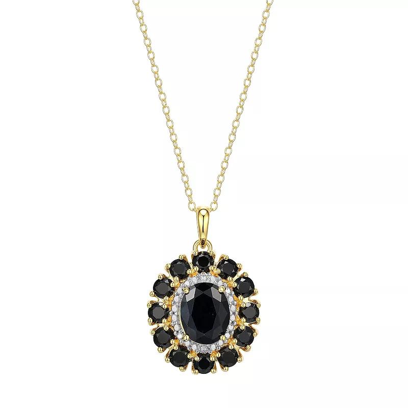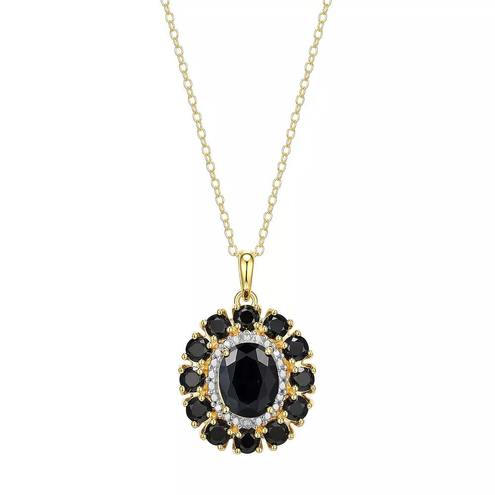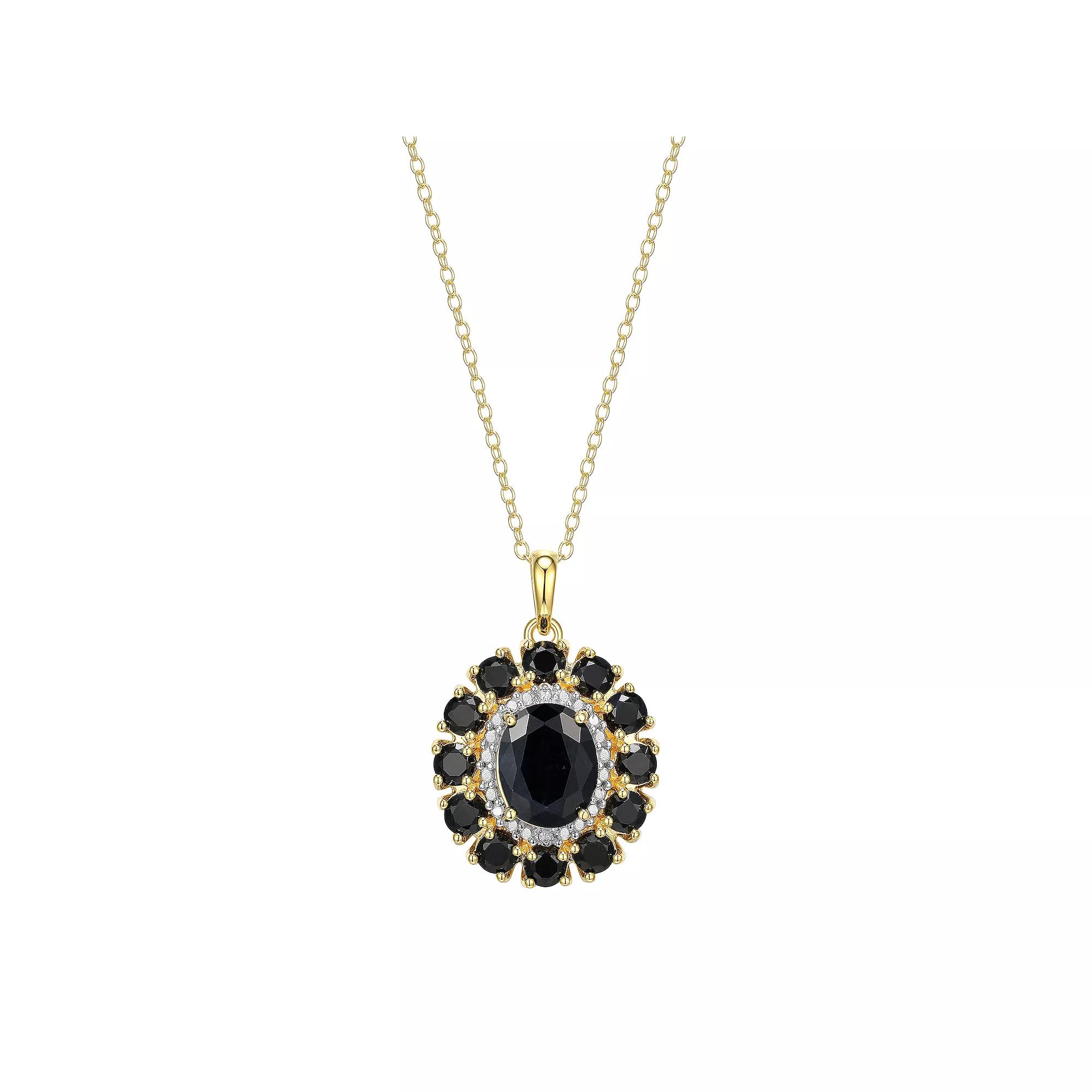 Dazzle and delight in this stunning 18K Gold Over Silver Genuine Black Sapphire and Diamond Accent Pendant. Click on this JEWELRY & WATCHES GUIDE to learn about fit, styles, materials and more! Dazzle and delight in this stunning 18K Gold Over Silver Genuine Black Sapphire and Diamond Accent Pendant. Click on this JEWELRY & WATCHES GUIDE to learn about fit, styles, materials and more! FEATURES Pendant size: 27.74 mm x 18.71 mm Chain length: 18 in. Chain type: cable Clasp: spring-ring Metal: sterling silver Plating: 18k gold Finish: polished Packaging: boxedSTONE DETAILS Stone type: sapphire Center stone weight: 3 5/8 ct. Center stone size: 10 mm x 8 mm Shape: oval, round Setting: prongDIAMOND DETAILS Total weight: less than 1/10 ct. Color: I2/I3 Clarity: I-J Shape: round Setting: pave Size: 18. Gender: female. Age Group: adult. Material: Gold Over Sterling.