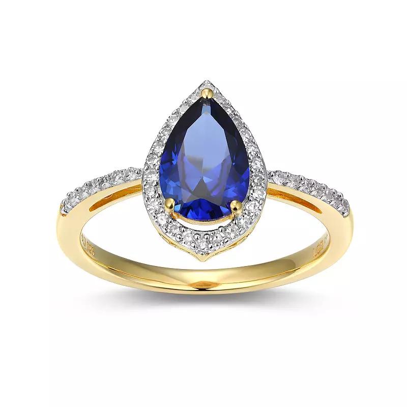 This 18k Gold Over Silver Lab-Created Sapphire & 1/5 Carat T.W. Lab-Grown Diamond Pear Ring offers a regal design with a pear-shaped sapphire and sparkling diamonds. This 18k Gold Over Silver Lab-Created Sapphire & 1/5 Carat T.W. Lab-Grown Diamond Pear Ring offers a regal design with a pear-shaped sapphire and sparkling diamonds. BENEFITS OF LAB-GROWN DIAMONDS Offer essentially the same physical, chemical and optical properties as mined diamonds Lab-grown diamonds are larger, and offer a higher quality than mined diamonds of the same price Each stone is conflict-freeFEATURES Band fit: half-round Shank style: reverse tapered Nickel safe Metal: sterling silver Plating: 18k gold, rhodium Finish: polished Packaging: boxedSTONE DETAILS Stone type: lab-created sapphire Total weight: 1 1/3 ct. Center stone size: 9 mm x 6 mm Shape: pear Setting: prongDIAMOND DETAILS Total weight: 1/5 ct. Color grade: G-H Clarity: S1-S3 Shape: round Setting: pave Diamond weights are approximate. Diamond Total Weights may vary between .01 and .13 ct. Some diamonds consist of fewer than 17 facets. Gemstones may have been treated to enhance their appearance. Special care may be required. Please visit our Gemstone Treatment & Special Care Guide for more information. Image(s) may be enlarged to show detail. Size: 8. Color: Gold Tone. Gender: female. Age Group: adult. Material: Gold Over Sterling.