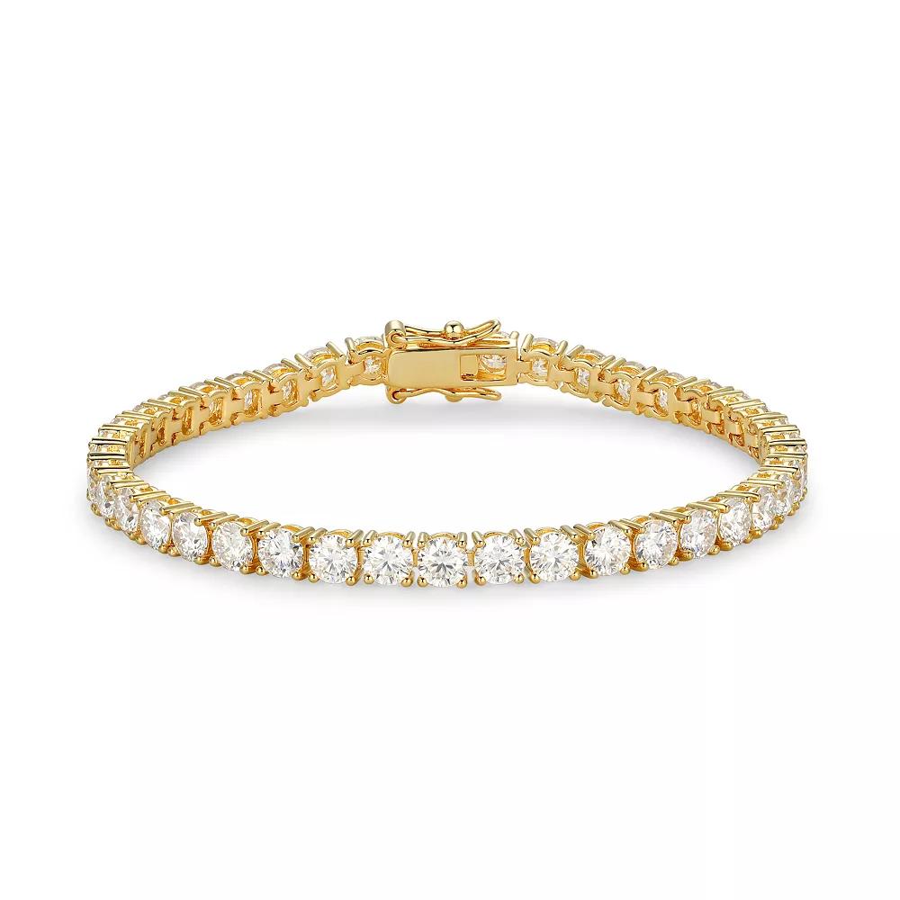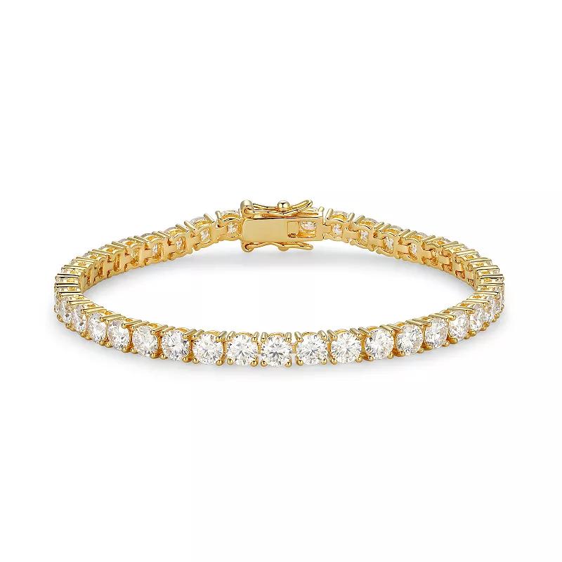 Accessorize to perfection with this stunning moissanite tennis bracelet. Click on this JEWELRY & WATCHES GUIDE to learn about fit, styles, materials and more! Accessorize to perfection with this stunning moissanite tennis bracelet. Click on this JEWELRY & WATCHES GUIDE to learn about fit, styles, materials and more! FEATURES Length: 7-in. Clasp: box Nickel safe Metal: sterling silver Plating: 18k gold Finish: polished Packaging: boxedSTONE DETAILS Stone type: lab-created moissanite Gemstone total weight: 12.3 ct Stone size: 4 mm Shape: round brilliant Setting: prong Gemstones may have been treated to enhance their appearance. Special care may be required. Please visit our Gemstone Treatment & Special Care Guide for more information. Size: 7". Color: Gold Tone. Gender: female. Age Group: adult. Material: Gold Over Sterling.