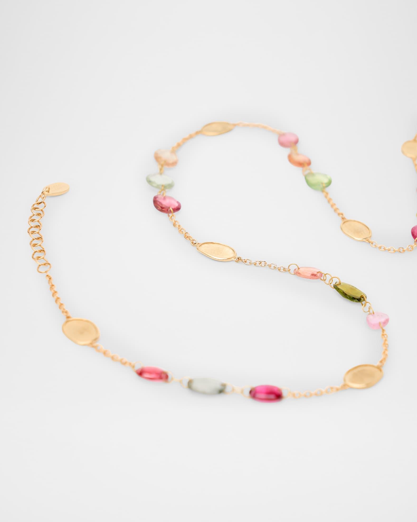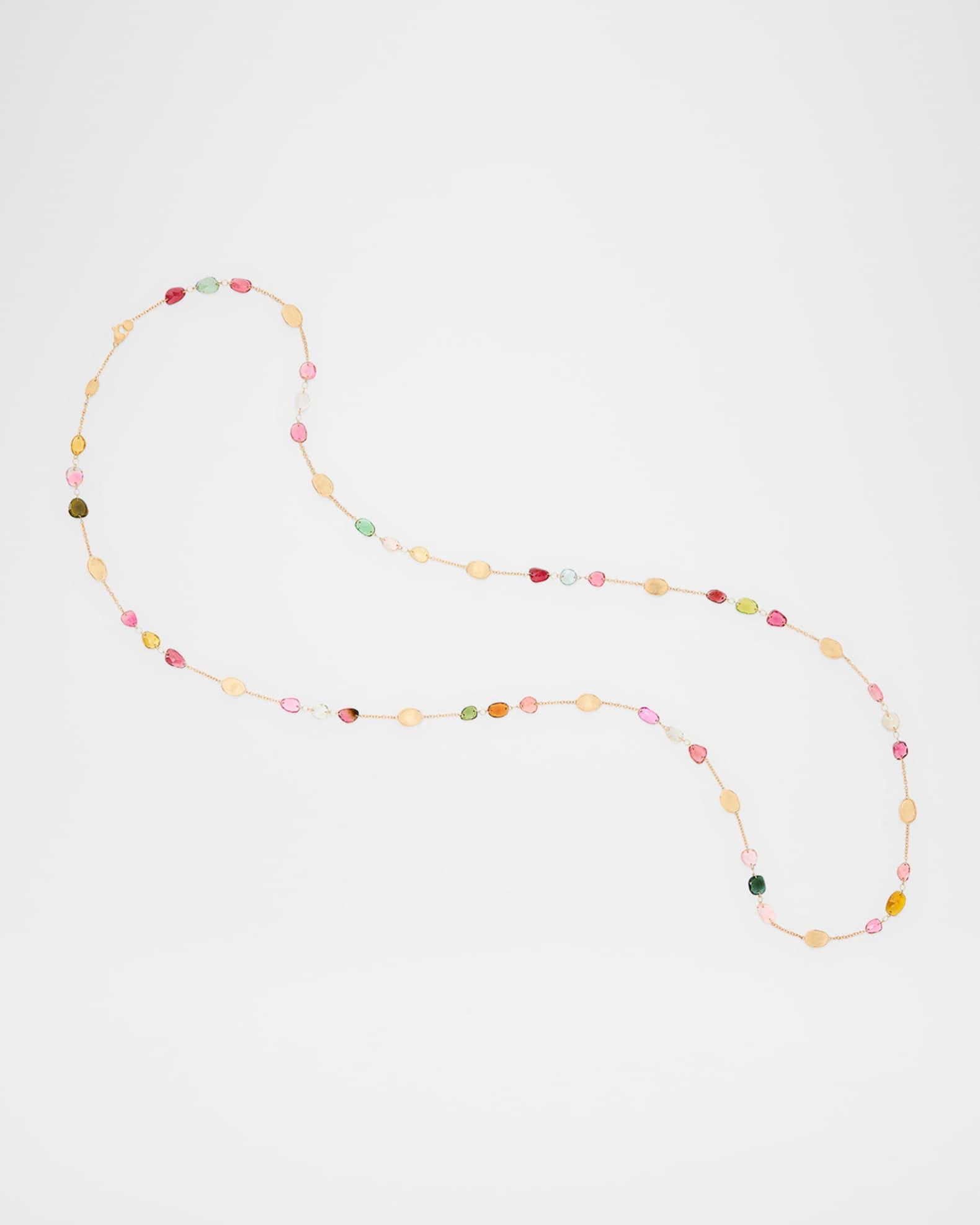 This long necklace from Marco Bicego is made with mixed tourmalines Necklace length: approx. 37.8 inches Hand-engraved 18-karat yellow gold Adjustable length Lobster clasp Professional cleaning recommended Made in Italy Please note: Each Marco Bicego piece is unique and actual stones used may vary. About the Marco Bicego Lunaria Collection: The Lunaria Collection is a line born from Marco’s love of nature. Crafted entirely of hand-engraved, 18-karat yellow gold plates framed by polished gold and hand-molded by expert craftsmen, the collection resembles the gentle movement of petals blowing in the wind. The alternating sequences of plates yield lustrous necklaces, bracelets, earrings, and rings that translate into elegant and refined styles.