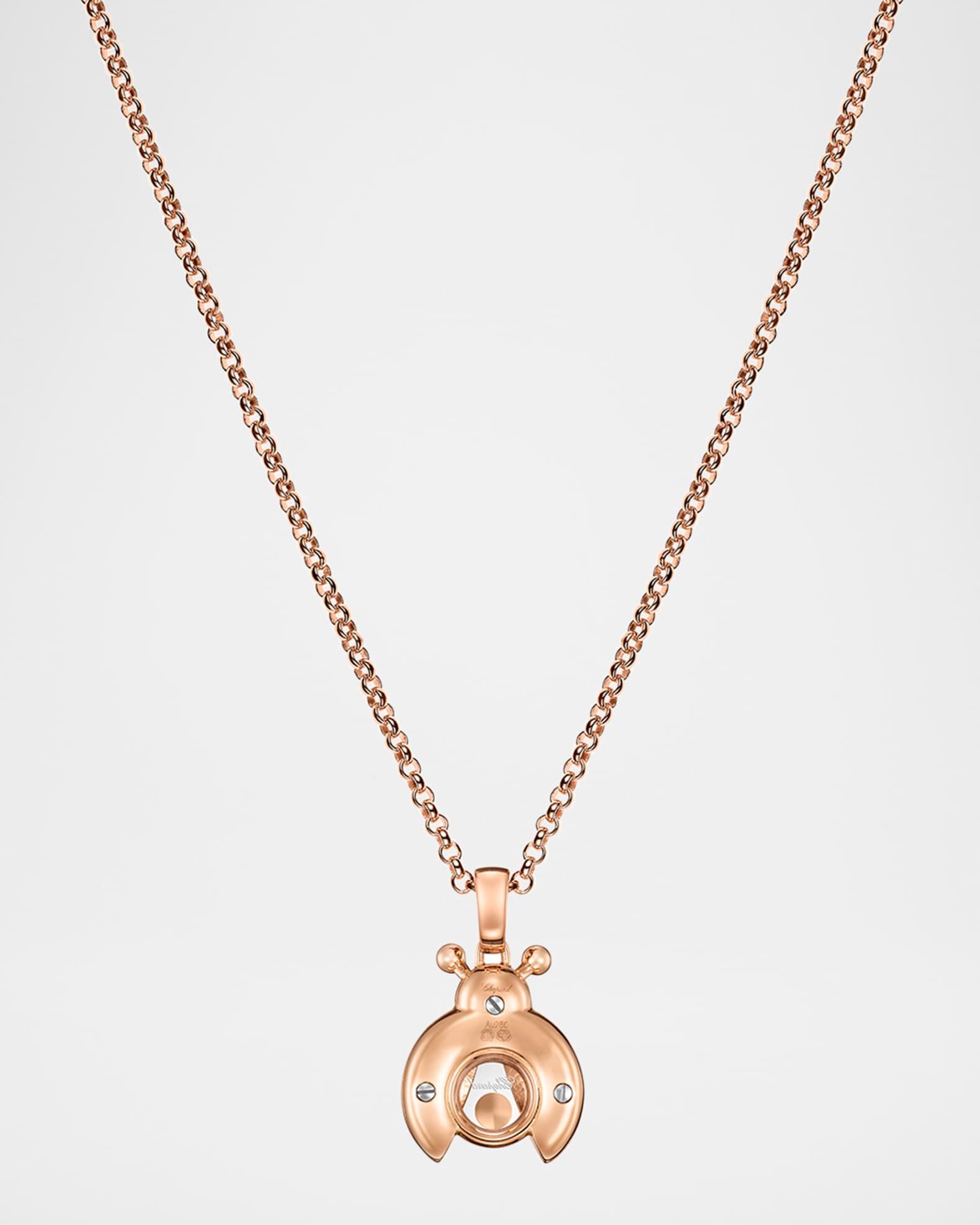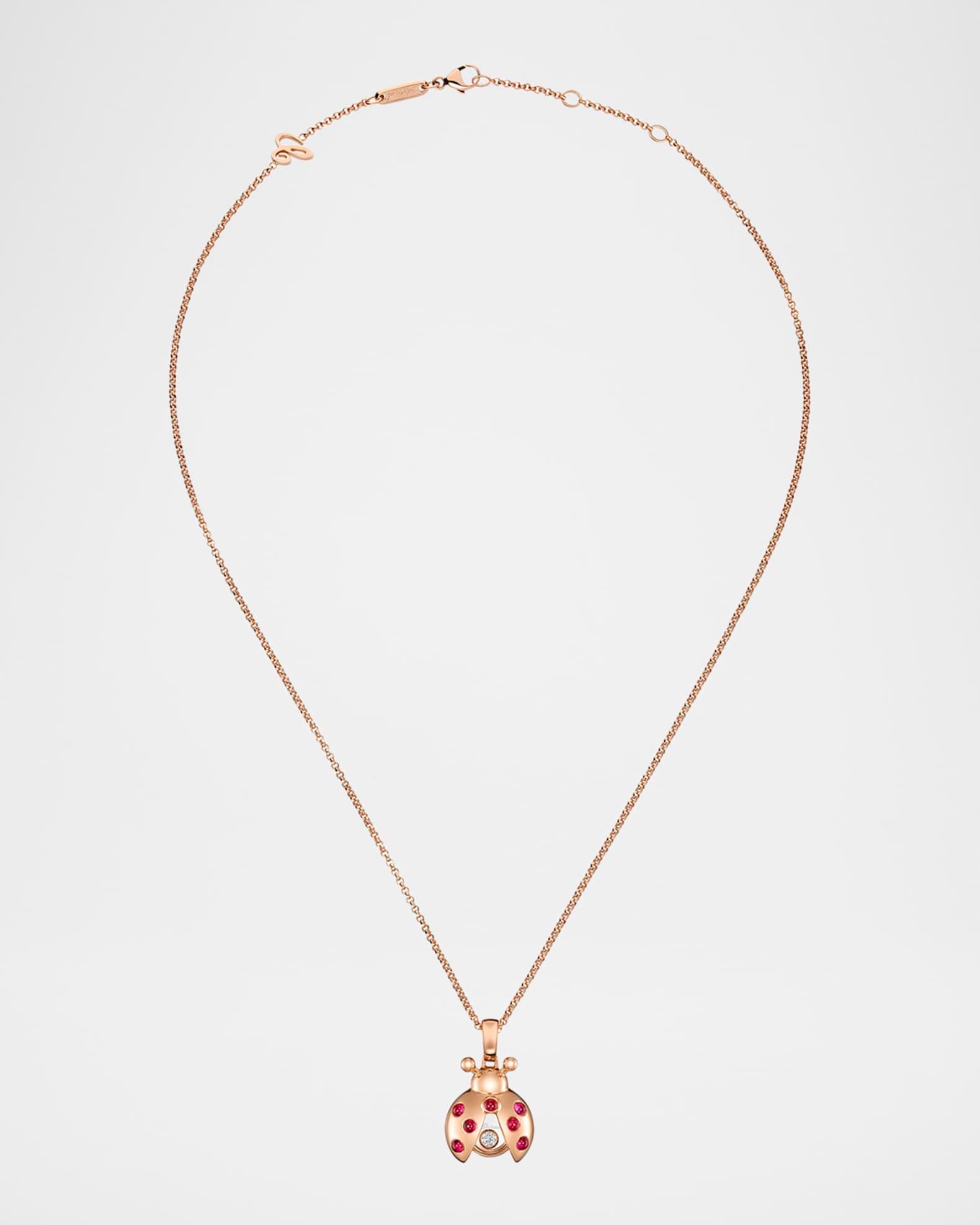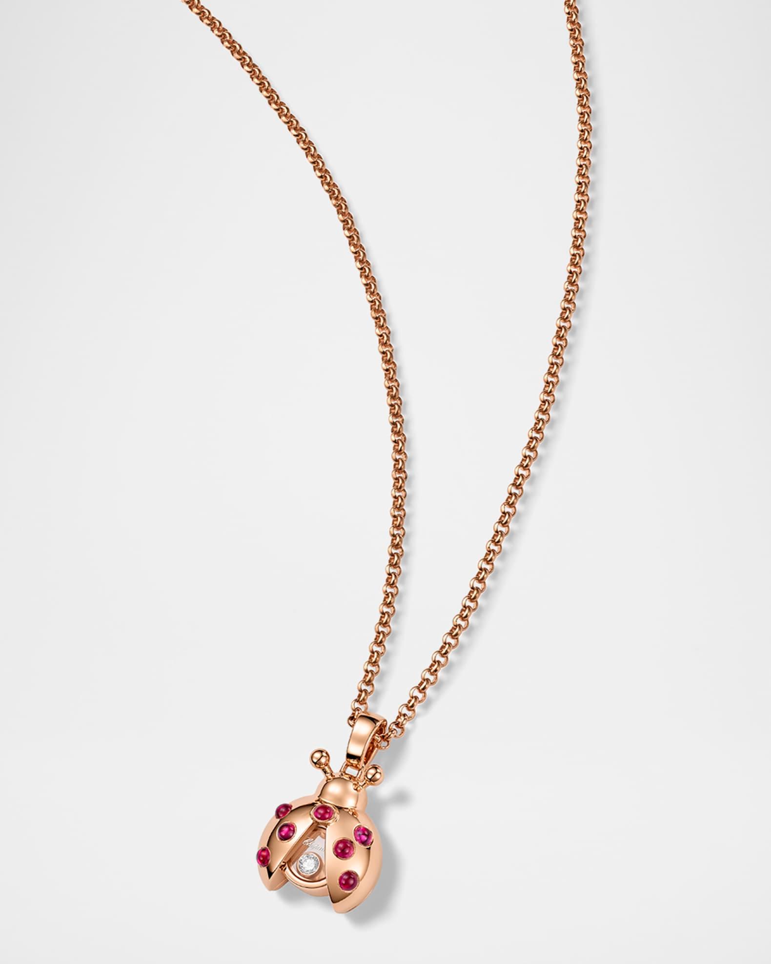 A ladybug pendant with a transparent center hangs from this Chopard Happy Diamonds necklace. Seven rubies dot the ladybug while a diamond bezel floats freely in the see-through window. Approx. 16.5" length Polished 18-karat rose gold 0.03 total diamond carat weight Adjustable length Lobster clasp Made in Germany
