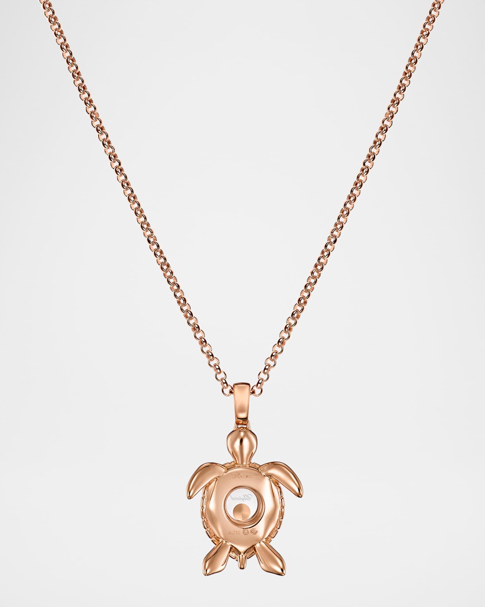 A turtle pendant with a transparent center hangs from this Chopard Happy Diamonds necklace. Two blue sapphires resemble the turtle's eyes while a diamond bezel floats freely in the see-through window. Approx. 16.5" length Polished 18-karat rose gold 0.03 total diamond carat weight Adjustable length Lobster clasp Made in Germany