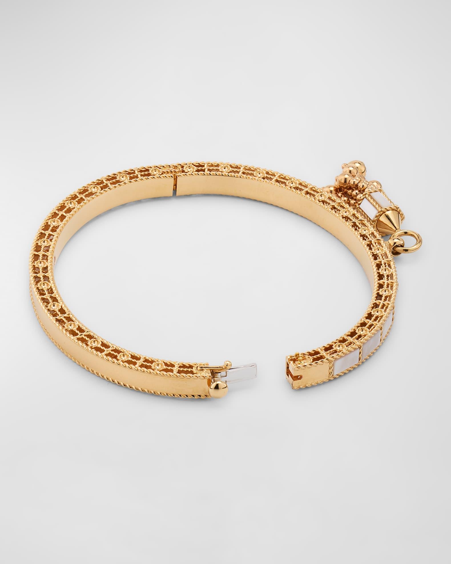 Roberto Coin bracelet from the Mosaic Collection Approx. 48mm x 58mm opening 18-karat rose gold with a polished finish The frame is set with white mother-of-pearl Mother-of-pearl tassel with a diamond bezel 0.14 total diamond carat weight Signature hidden genuine ruby Hinged opening eases dress Made in Italy