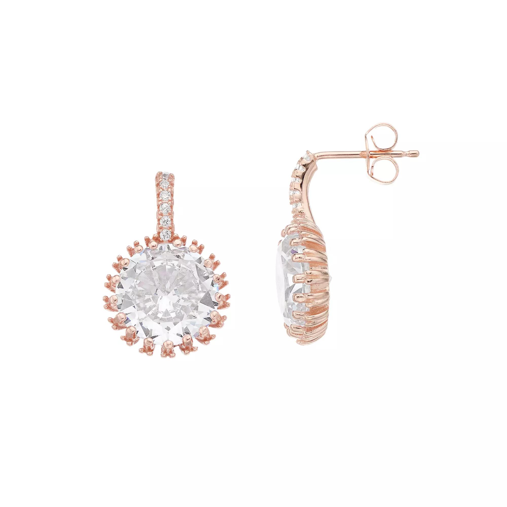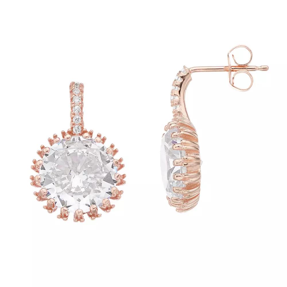 Add the perfect finishing touch for a night out or dress up your everyday wear with these sweet 18k rose gold plated cubic zirconia halo earrings. Add the perfect finishing touch for a night out or dress up your everyday wear with these sweet 18k rose gold plated cubic zirconia halo earrings. Metal: sterling silver Backings: post Packaging: boxed Plating: 18k rose gold Finish: polished Diameter: 16 mmSTONE DETAILS Stone type: cubic zirconia Total weight: 3 5/8 ct. Shape: round Gemstones may have been treated to enhance their appearance. Special care may be required. Please visit our Gemstone Treatment & Special Care Guide for more information. Size: One Size. Color: White. Gender: female. Age Group: adult.
