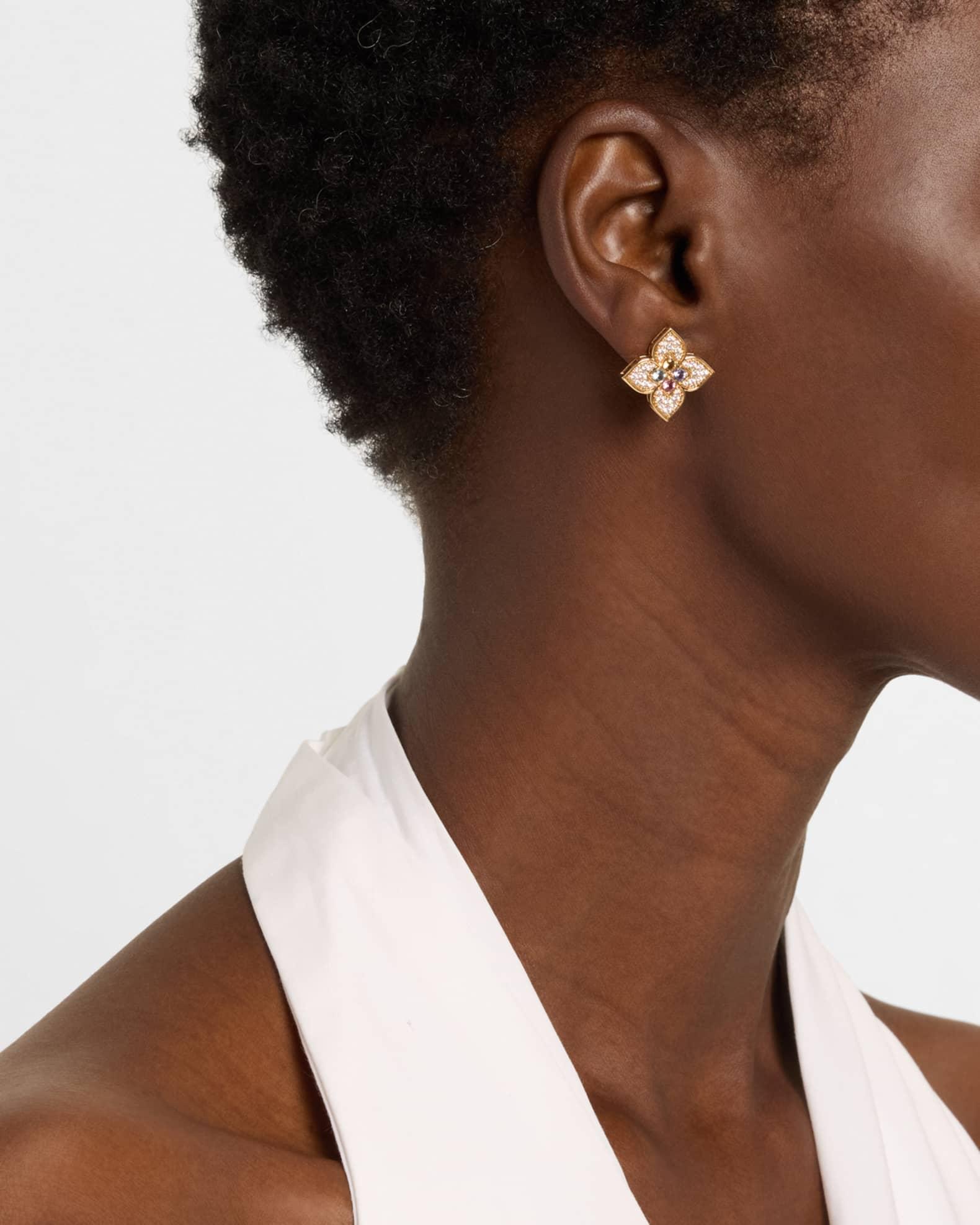 Roberto Coin stud earrings from the Venetian Princess Collection 18-karat rose gold Swiss blue topaz, tanzanite, rubellite, and citrine Round white diamonds Diamond total carat weight: 0.75 Post backs for pierced ears Made in Italy
