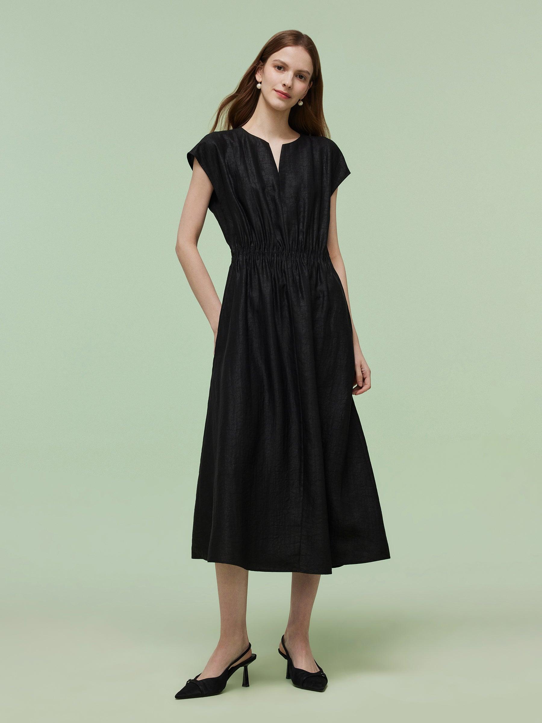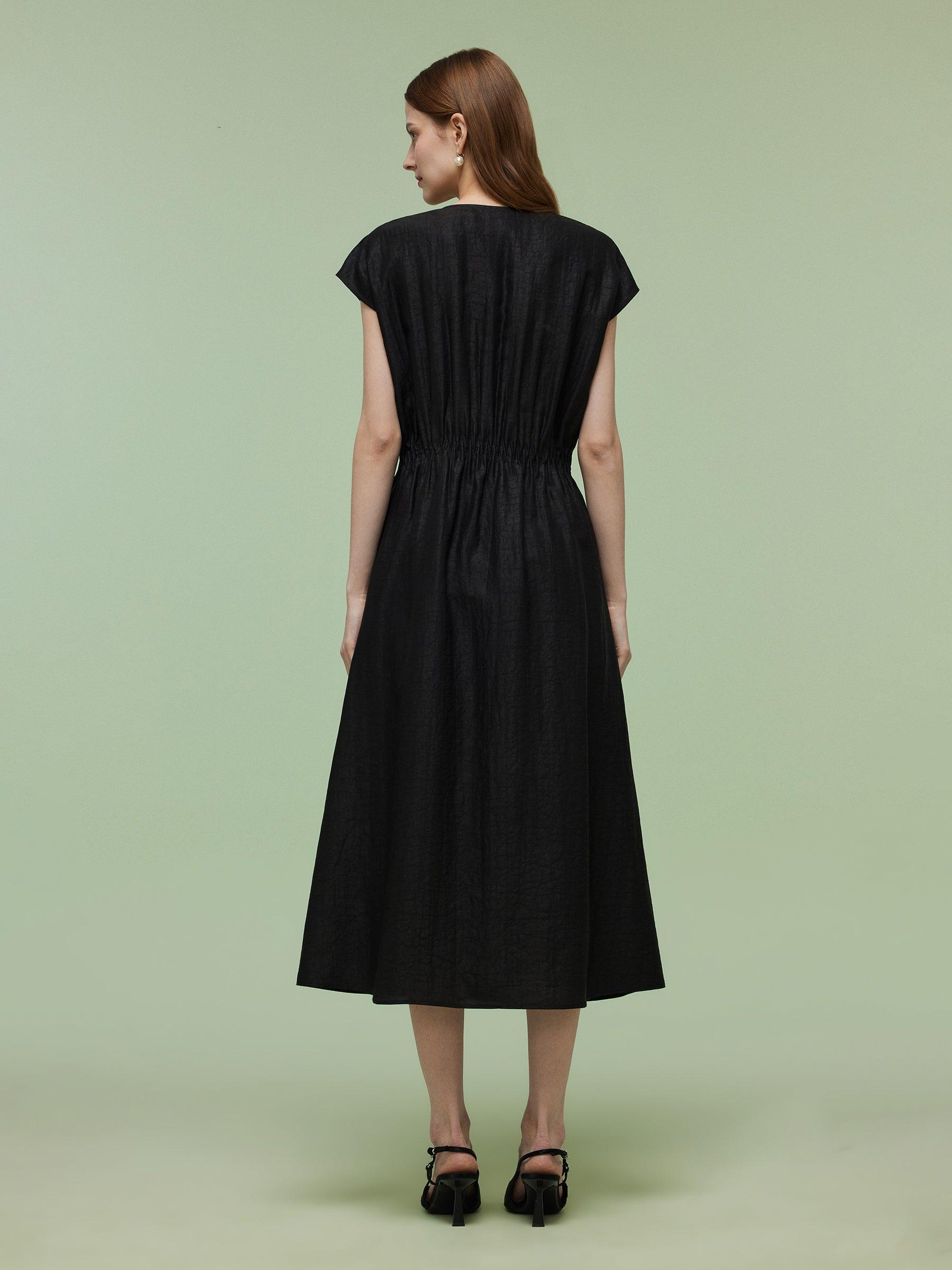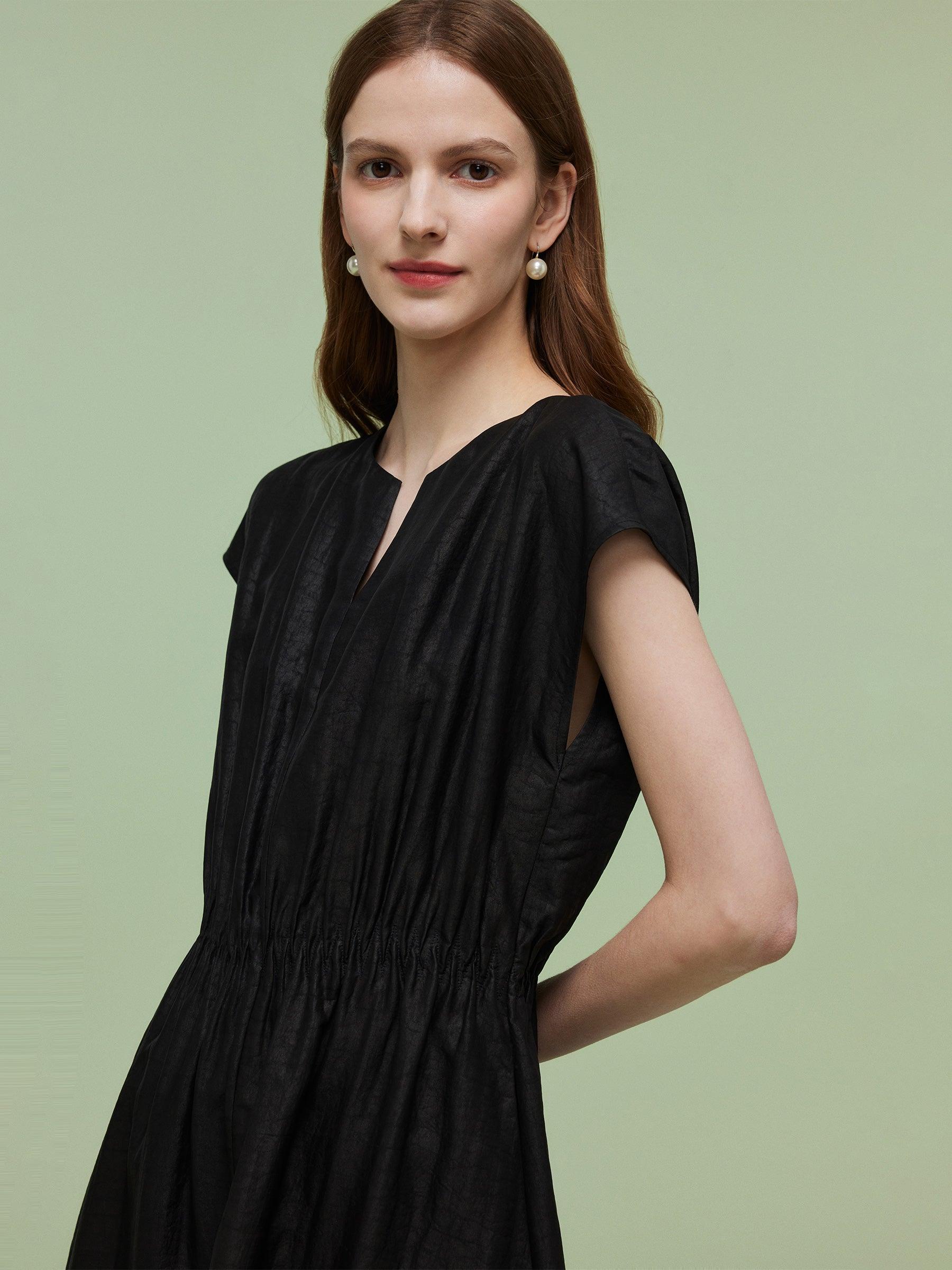 -18MM Xiang Yun Silk -With pockets -With elastic waistband Blending traditional elegance with modern simplicity, this maxi dress is made from 18MM Xiang Yun Silk, providing all-day ease and graceful drape. The refined small V-neck frames the neckline gracefully. Side pockets add practicality without compromising style.