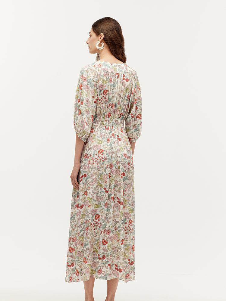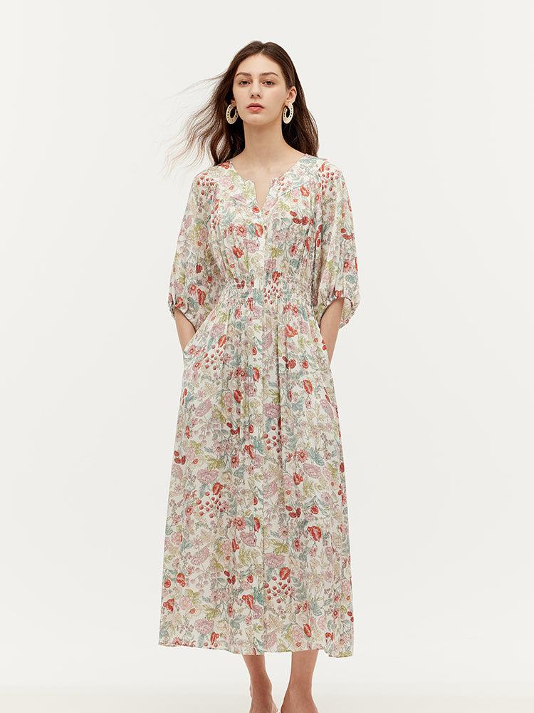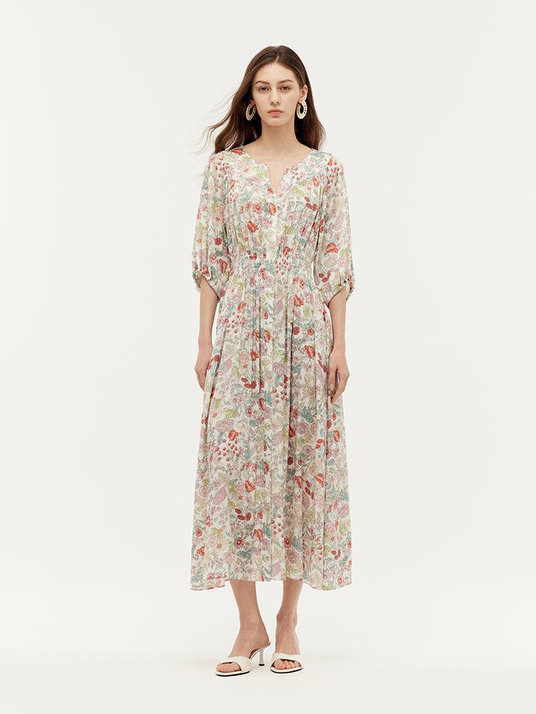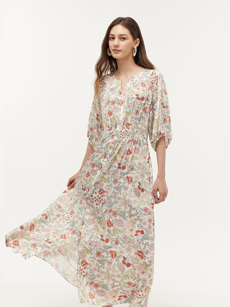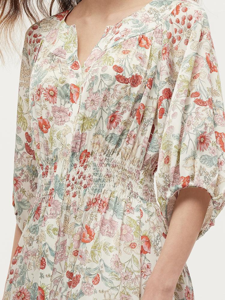 -19 Momme mulberry silk -With pockets -Vacation wear Crafted from 19-momme mulberry silk, this dress brings spring to life with its romantic charm. Made from breathable, skin-friendly silk blended with spandex, it offers a comfortable and elegant drape. Practical features like spacious pockets, a ruched waist, raglan s