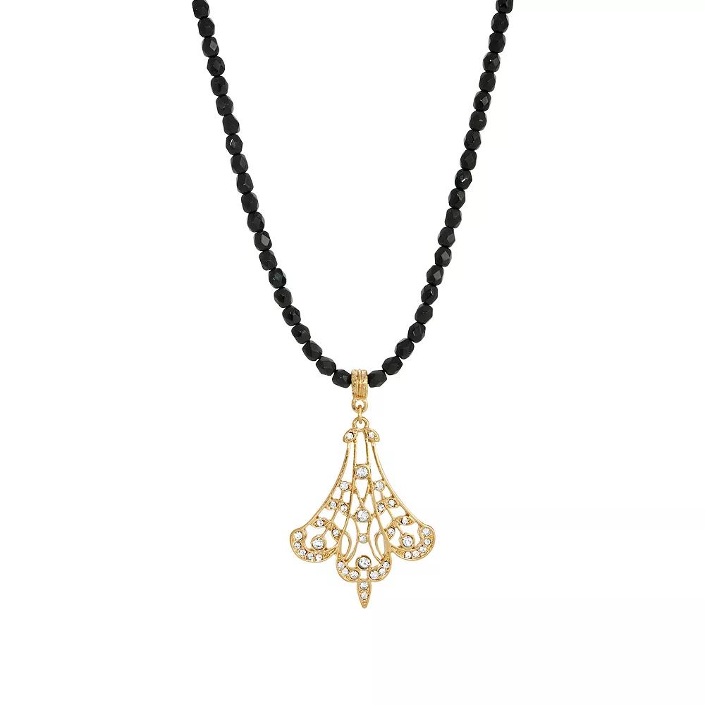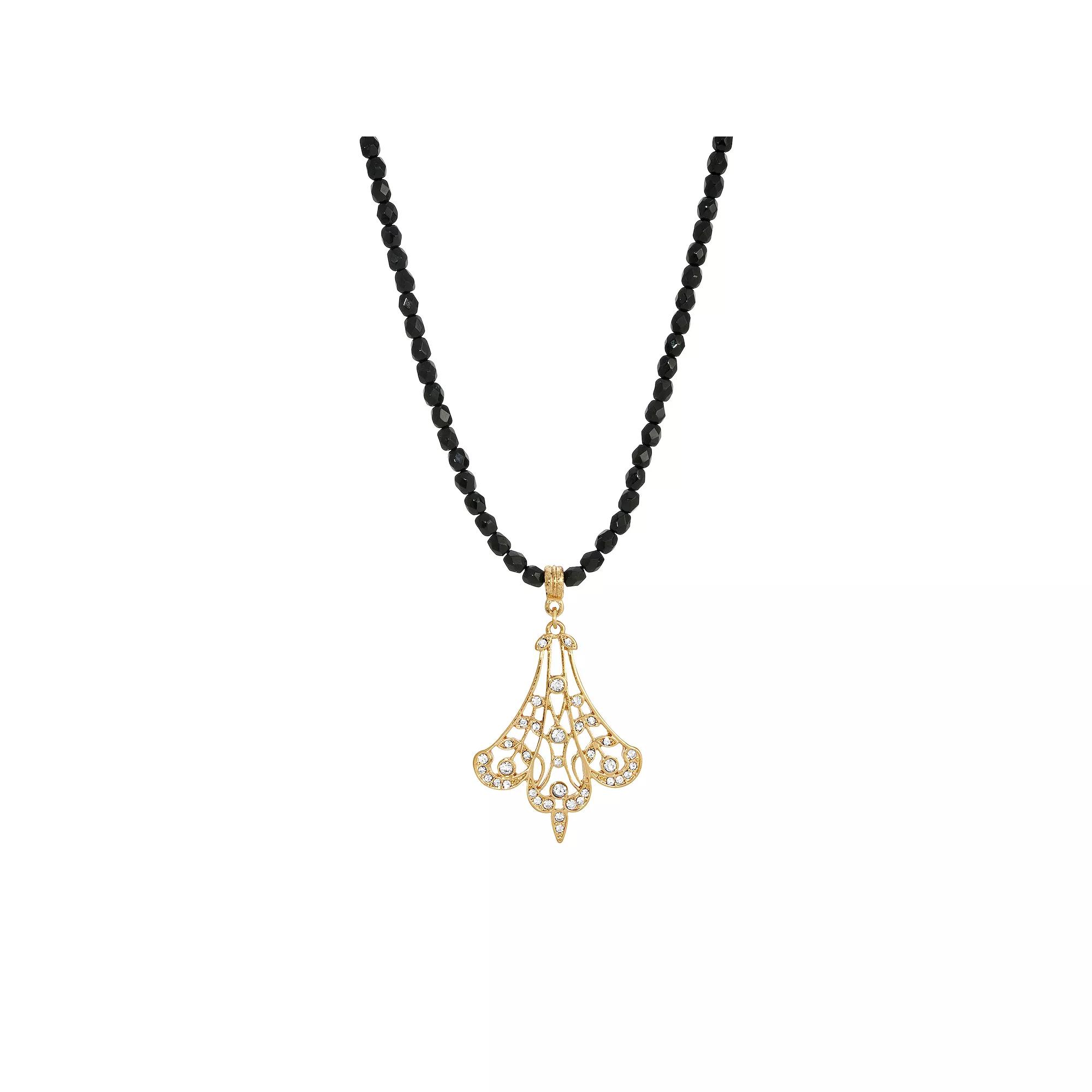 Feel elegant with this beautifully designed black beaded necklace featuring a fan shaped crystal pendant. | 1928 Jewelry Gold Tone Crystal Filigree Drop Necklace Black Bead Chain 15 Inch Adj, No Size