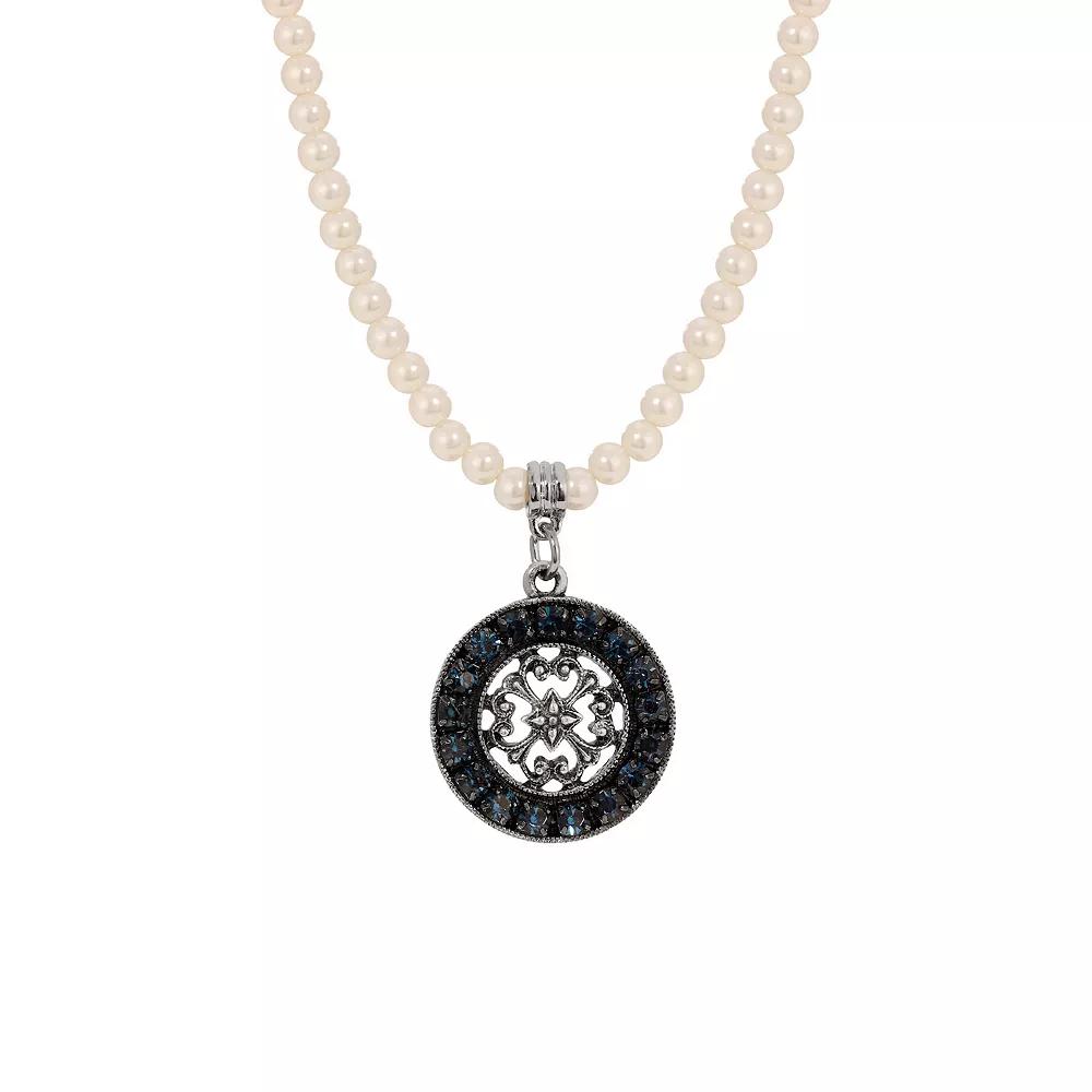 Accessorize in style with this 1928 Faux Pearl Necklace with Blue Crystal Pendant Necklace. Accessorize in style with this 1928 Faux Pearl Necklace with Blue Crystal Pendant Necklace. FEATURES Chain length: 15 in. + 3-in. extender Clasp: lobster-claw Nickel safe Metal: alloy Material: crystal Plating: silver tone Finish: polished Not appropriate for children 14 years old and younger. Size: One Size. Gender: female. Age Group: adult.