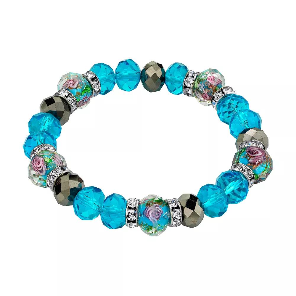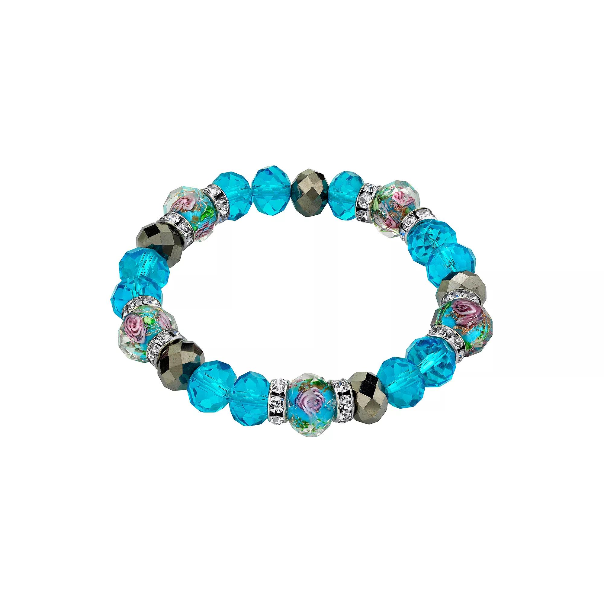 Pretty in spring! This silver-tone beaded bracelet by 1928 Jewelry is sweet and completely romantic. Aqua blue faceted beads are accented with clear glass beads, each delicately designed with a pink and blue floral design inside. Sparkling silver-tone clear crystal bands are alternated with faceted hematite color beads to finish the style. | 1928 Jewelry Silver Tone Aqua Pink Flower Crystal Stretch Beaded Bracelet, Blue