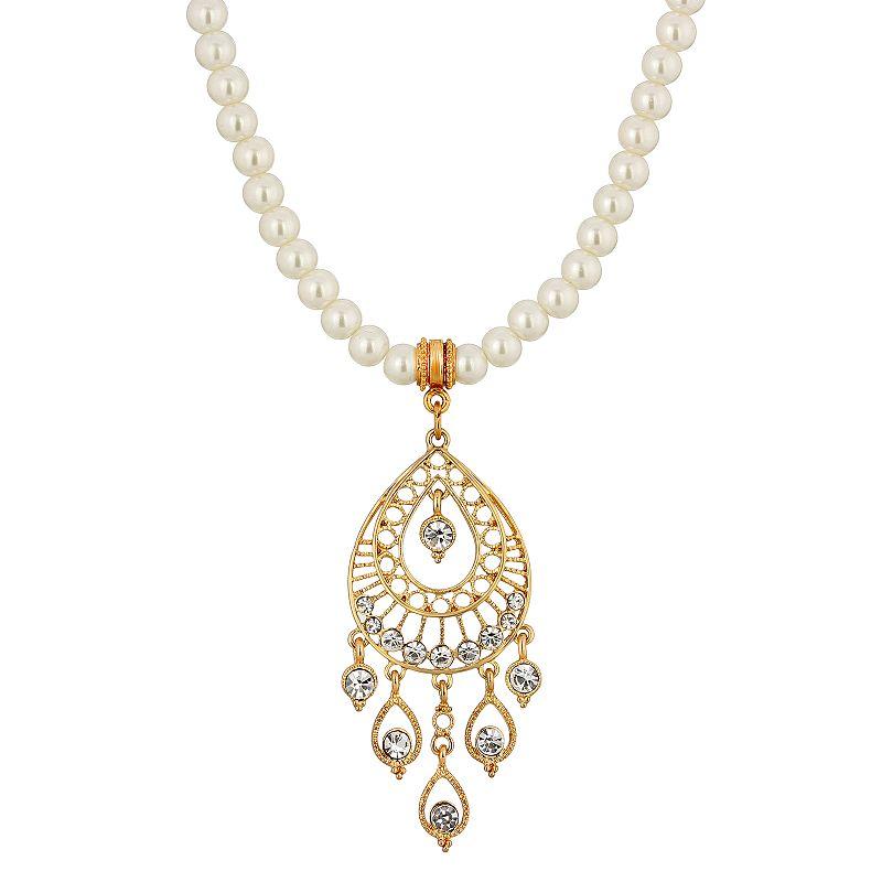 Dazzle them with this stunning gold-tone and crystal chandelier pendant on a faux pearl necklace. This piece by 1928 is sure to become a favorite in your collection. Dazzle them with this stunning gold-tone and crystal chandelier pendant on a faux pearl necklace. This piece by 1928 is sure to become a favorite in your collection. NECKLACE DETAILS Chain length: 15 in. Extender length: 3 in. Drop length: 2.9 in. Metal: alloy Plating: gold tone Finish: polished Stone: acrylic, crystal Size: One Size. Color: White. Gender: female. Age Group: adult.