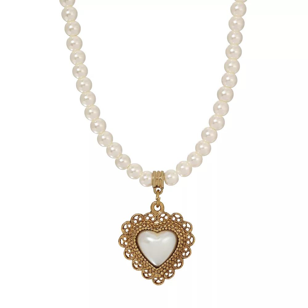 Make a fashion statement with this 1928 Gold Tone Faux Pearl Heart Shaped Necklace. Click on this JEWELRY & WATCHES GUIDE to learn about fit, styles, materials and more! Make a fashion statement with this 1928 Gold Tone Faux Pearl Heart Shaped Necklace. Click on this JEWELRY & WATCHES GUIDE to learn about fit, styles, materials and more! FEATURES Clasp: lobster-claw Nickel safe Metal: alloy Material: acrylic Plating: gold tone Finish: polished Made in USA Qualified Claim Size: One Size. Color: White. Gender: female. Age Group: adult.