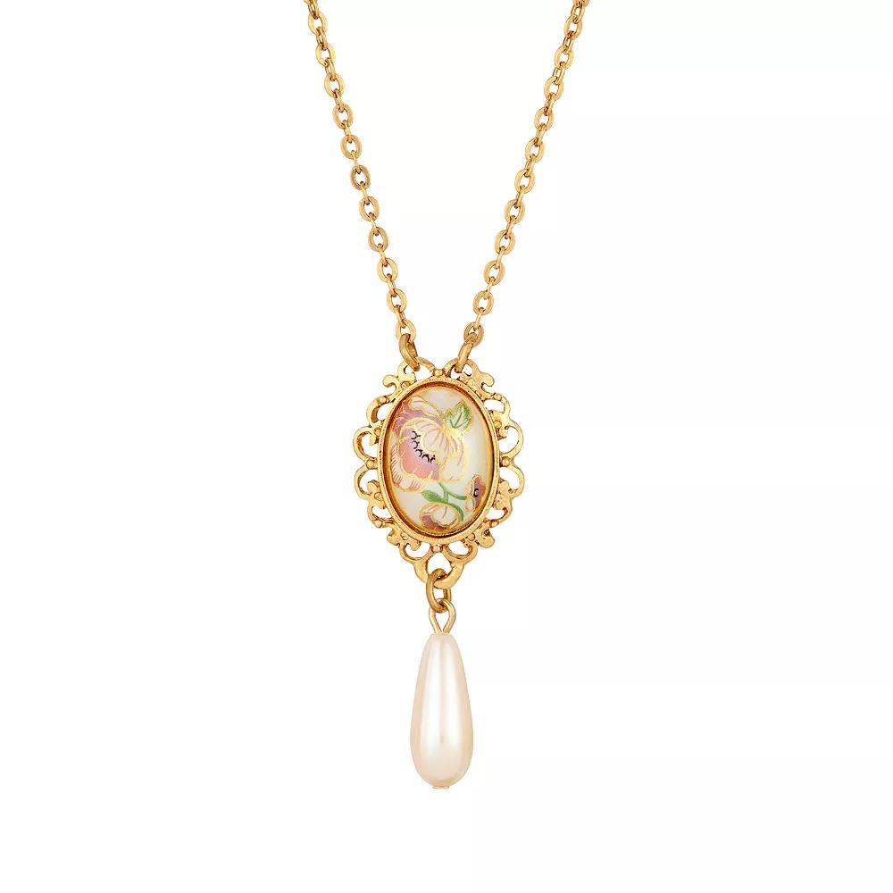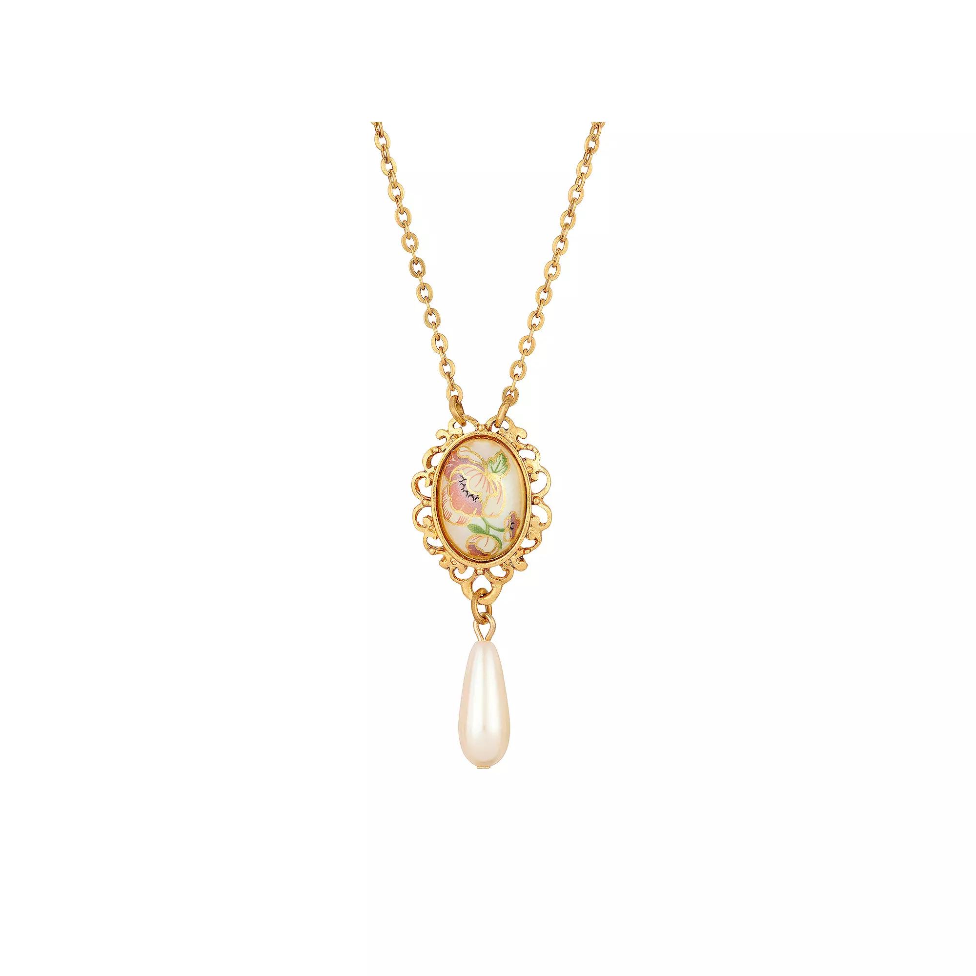 Show off your vintage style with this feminine 1928 Gold Tone Flower Decal Oval Drop Necklace. Show off your vintage style with this feminine 1928 Gold Tone Flower Decal Oval Drop Necklace. DETAILS Pendant length: 2 in. Chain length: 16 in. with 3 in. extender Clasp: lobster-claw Metal: alloy Plating: gold tone Finish: polished Size: One Size. Color: Multi. Gender: female. Age Group: adult.