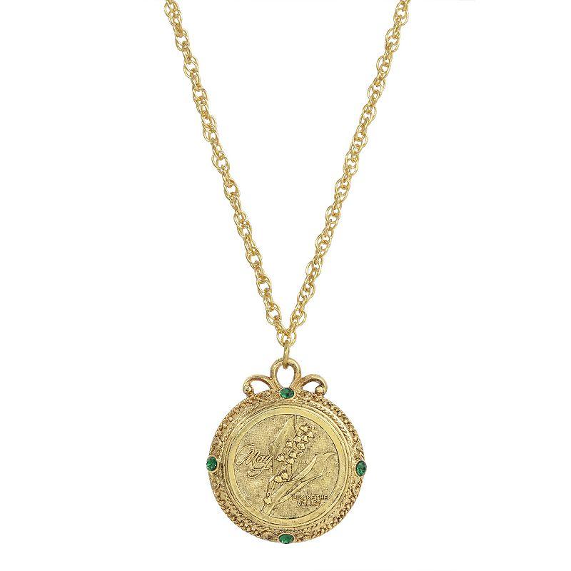 This charming 1928 gold-tone twenty-inch chain pendant necklace with green crystal accents makes a lovely and affordable birthday gift. This May birth flower, the Lily of the Valley, is a wonderfully fragrant and beautiful plant popular in bridal bouquets. Legend has it that the lily of the valley came from Eve's tears after she was driven from the Garden of Eden.