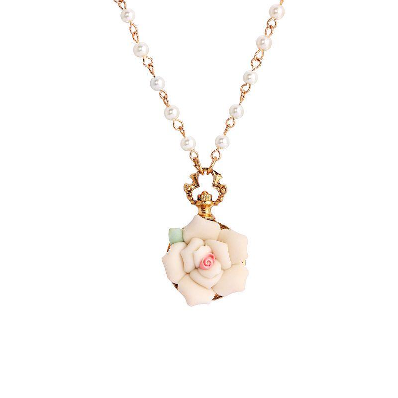 For the vintage aficionado looking for something unique, we've created this special piece Featuring a handmade white porcelain rose with pink center and green leave, which dangles elegantly from a linking chain with white faux pearl beads. | 1928 Jewelry Gold Tone Flower With Pearl 16" +3" Adj Necklace, White, No Size