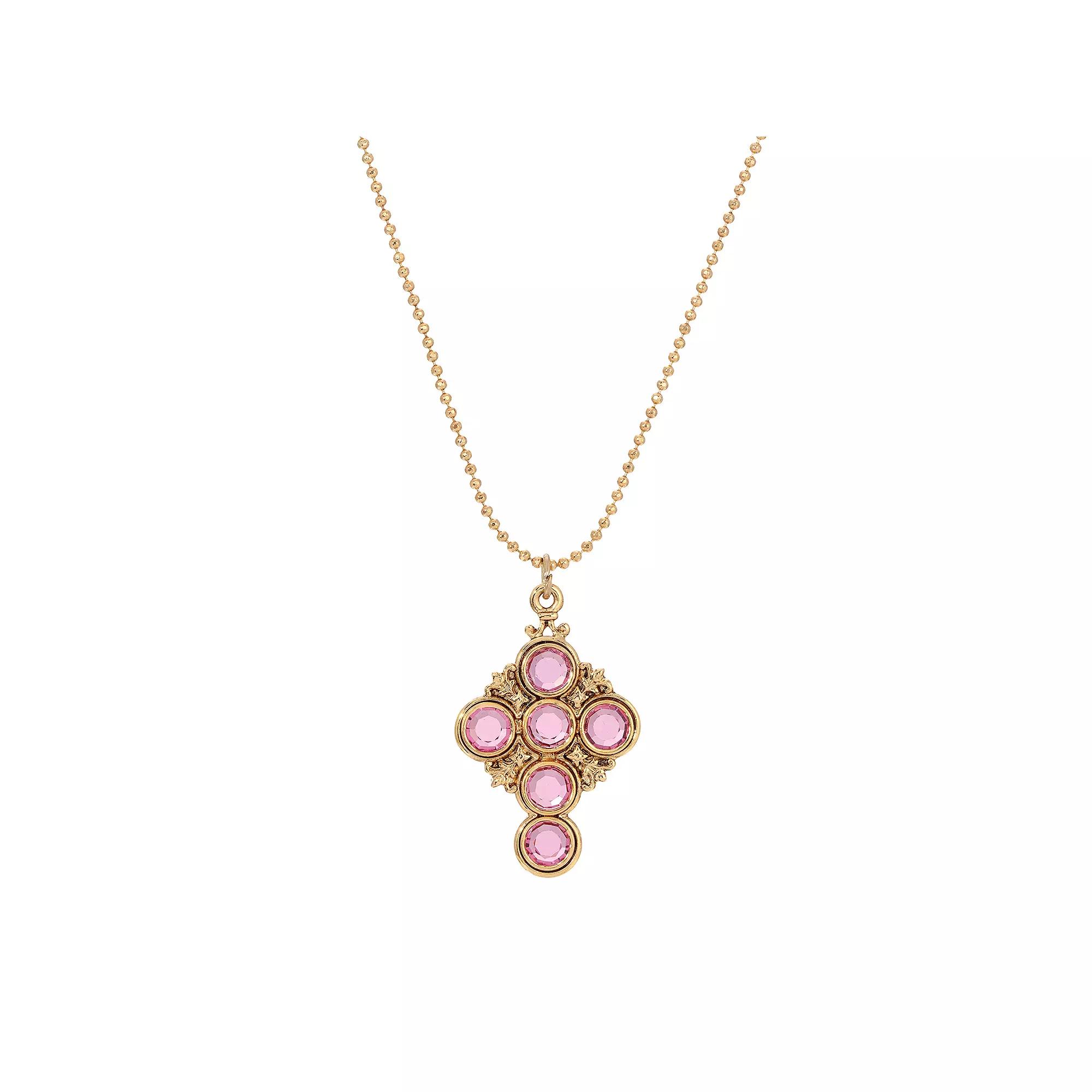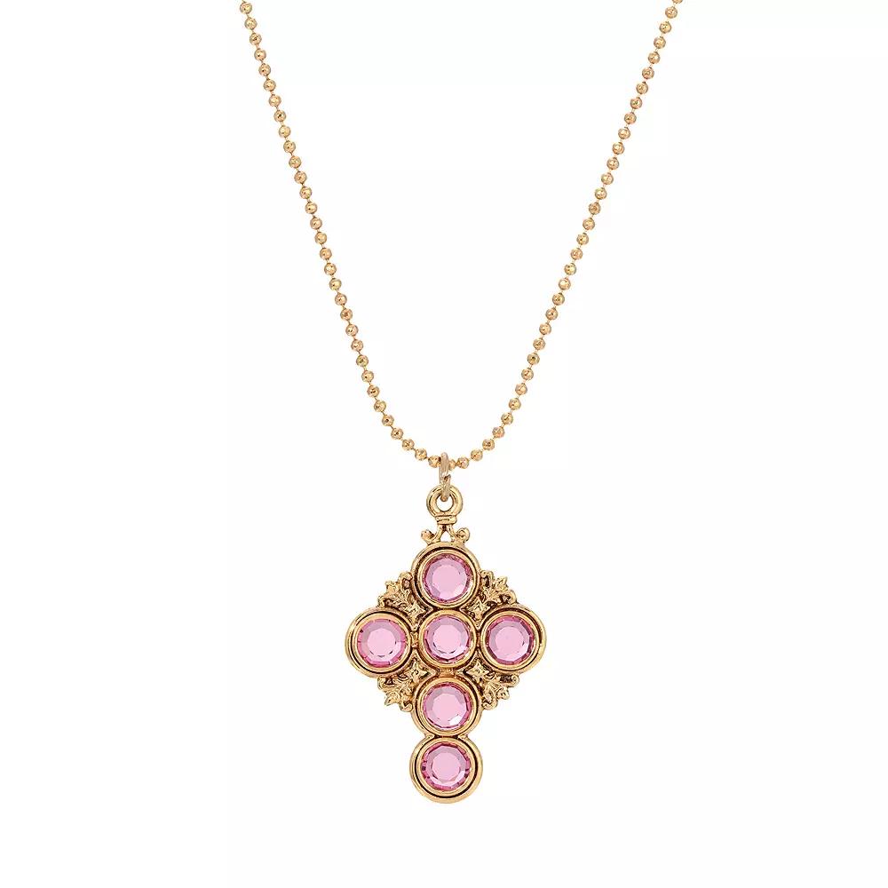 Show your spirituality with this beautiful gold tone and pink simulated crystal cross pendant necklace from 1928. Show your spirituality with this beautiful gold tone and pink simulated crystal cross pendant necklace from 1928. Metal: alloy Chain length: 16 in. Plating: gold tone Finish: polished Clasp: lobster claw Material: simulated crystal 1.6 inches Not appropriate for children 14 years old and younger. Size: One Size. Gender: female. Age Group: adult. Material: Gold Plate.