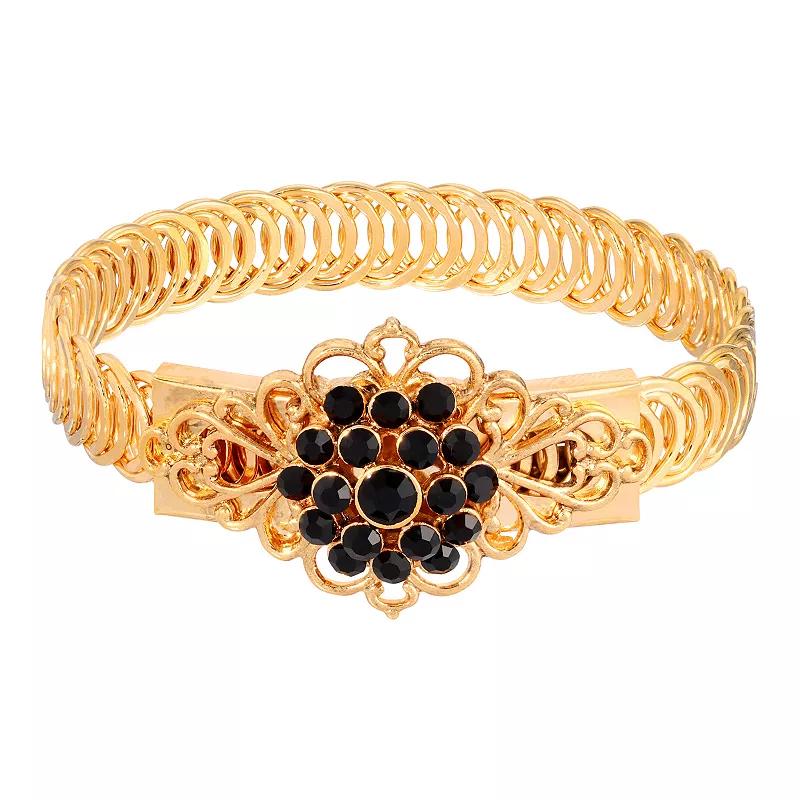 This 1928 Gold Tone Siam Flower Overlay Belt Bracelet will add sparkle and color to your outfit. This 1928 Gold Tone Siam Flower Overlay Belt Bracelet will add sparkle and color to your outfit. DETAILS Length: 7 in. Metal: alloy Plating: gold tone Finish: polished Size: One Size. Color: Black. Gender: female. Age Group: adult.