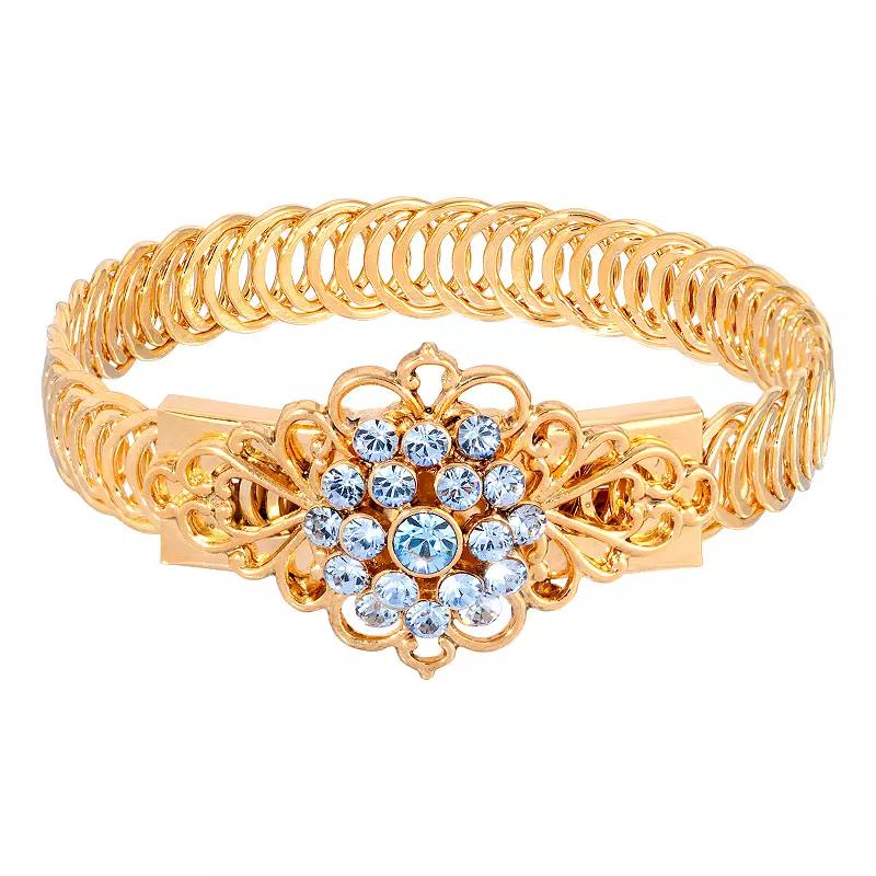 This 1928 Gold Tone Siam Flower Overlay Belt Bracelet will add sparkle and color to your outfit. This 1928 Gold Tone Siam Flower Overlay Belt Bracelet will add sparkle and color to your outfit. DETAILS Length: 7 in. Metal: alloy Plating: gold tone Finish: polished Size: One Size. Color: Blue. Gender: female. Age Group: adult.