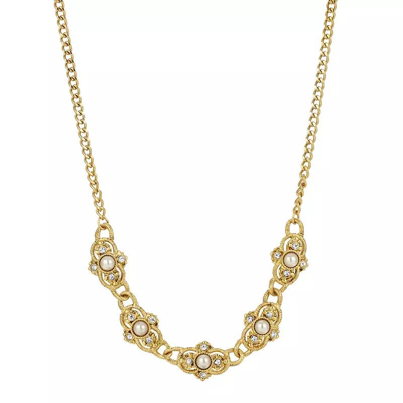This gorgeous gold tone 1928 collar necklace features pretty simulated pearls and sparkling crystal accents, making it the perfect way to add a touch of elegance to your wardrobe. This gorgeous gold tone 1928 collar necklace features pretty simulated pearls and sparkling crystal accents, making it the perfect way to add a touch of elegance to your wardrobe. Metal: alloy Length: 15 in. with 3-in. extender Plating: gold tone Finish: polished Material: acrylic, crystal Clasp: lobster claw Not appropriate for children 14 years old and younger. Size: One Size. Color: White. Gender: female. Age Group: adult.