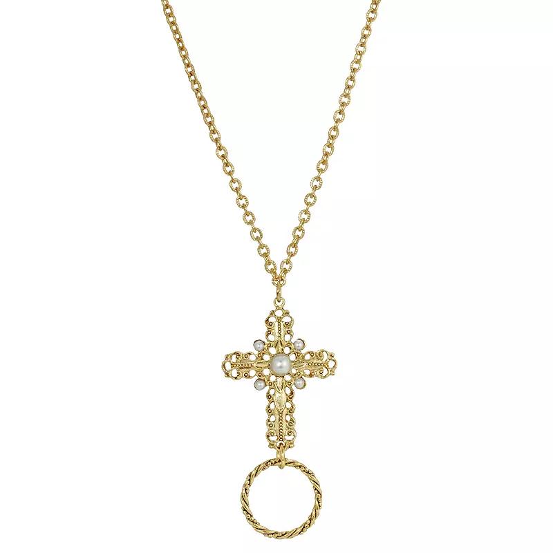 Fashion meets function in this unique gold tone cross necklace from 1928. This accessory is sure to become a favorite piece by showcasing a round ID badge or eyeglass holder, intricate design and simulated pearl accents. Fashion meets function in this unique gold tone cross necklace from 1928. This accessory is sure to become a favorite piece by showcasing a round ID badge or eyeglass holder, intricate design and simulated pearl accents. NECKLACE DETAILS Pendant length: 2.6 in. Chain length: 28 in. Clasp: lobster-claw Metal: alloy Plating: gold tone Finish: polished Not appropriate for children 14 years old and younger. Size: One Size. Color: White. Gender: female. Age Group: adult.