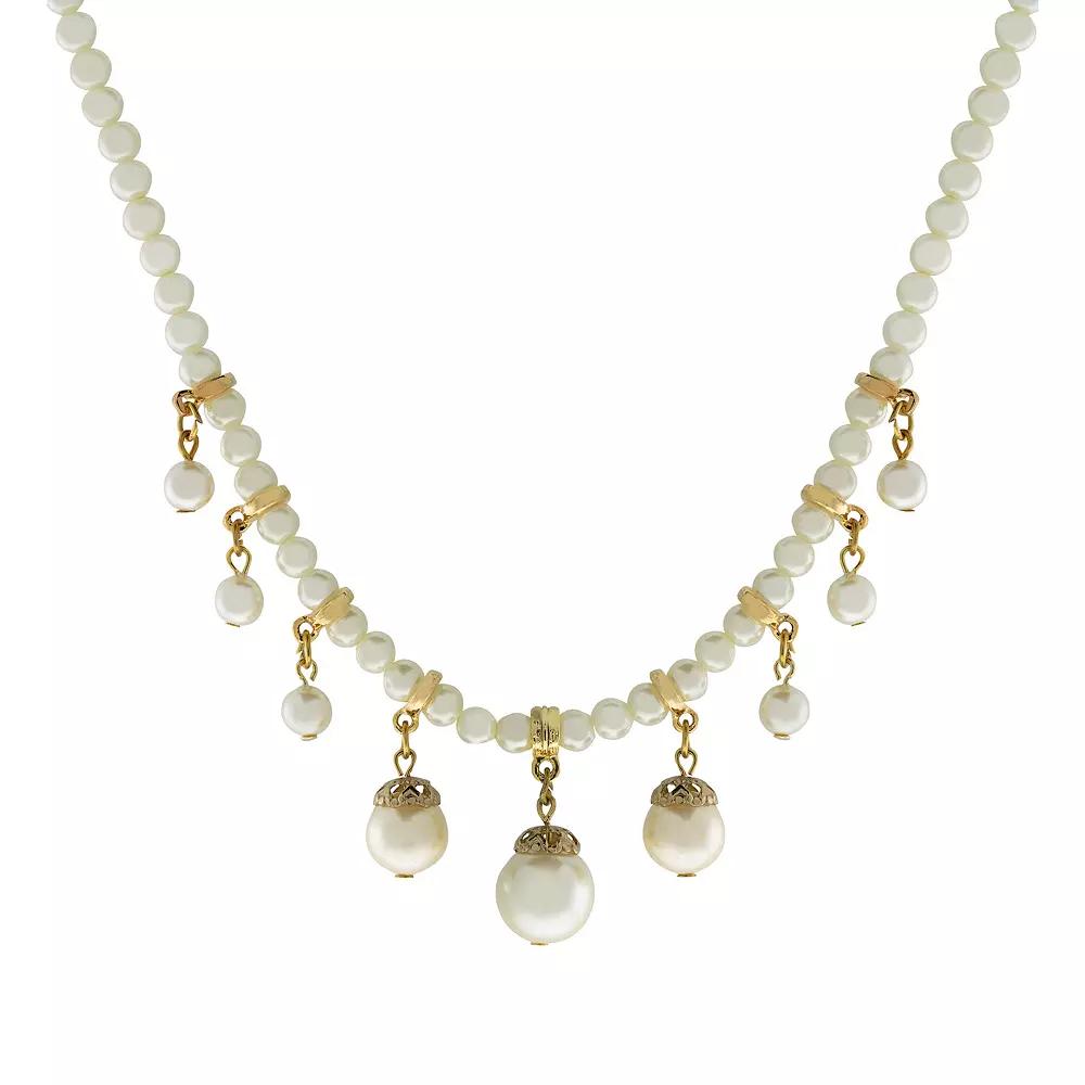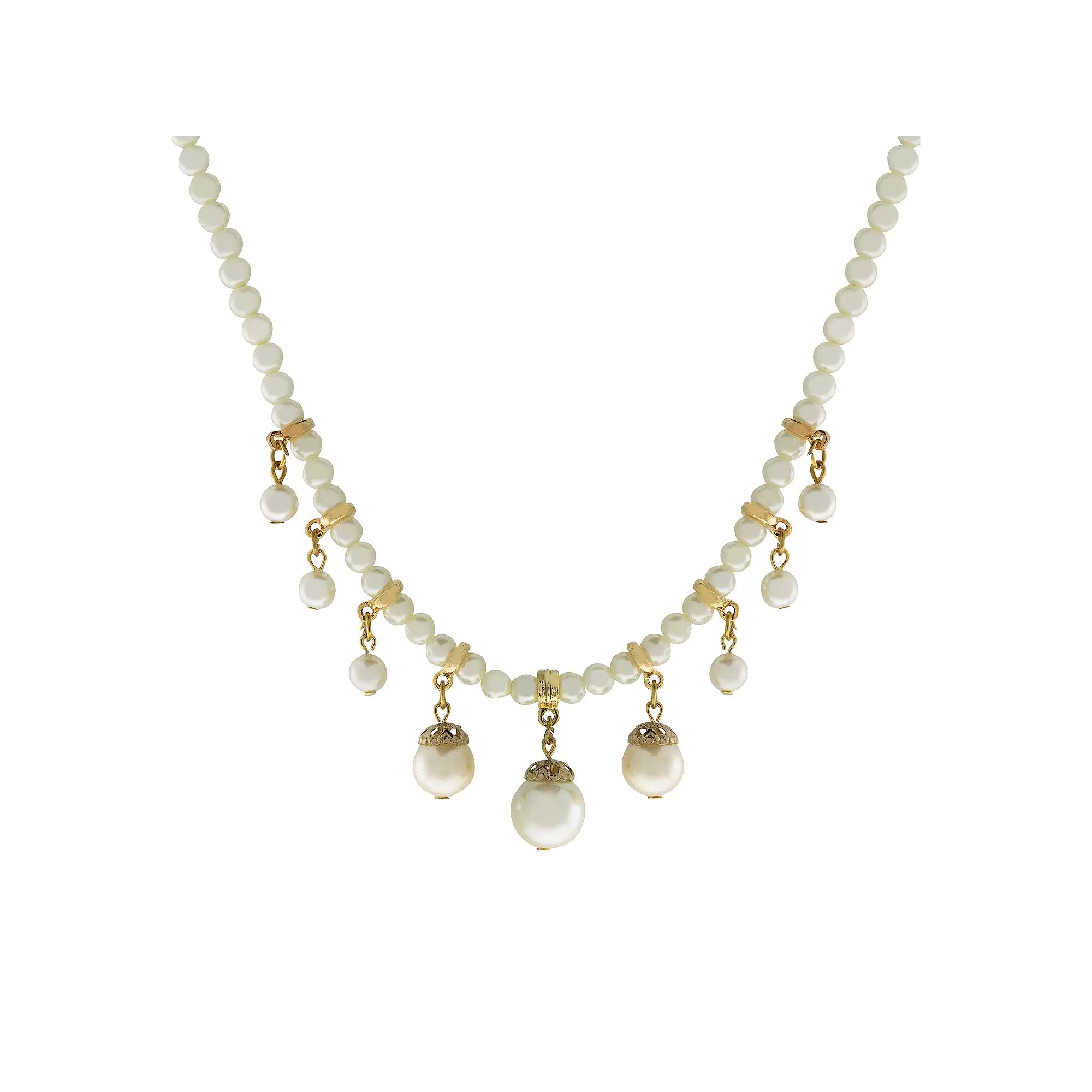 Add a touch of vintage-inspired elegance to your wardrobe with this simulated pearl strand and drop gold tone necklace from 1928. Add a touch of vintage-inspired elegance to your wardrobe with this simulated pearl strand and drop gold tone necklace from 1928. FEATURES Drop length: 1.1 in. Chain length: 15 in. with 3-in. extender Clasp: lobster-claw Metal: alloy Plating: gold tone Finish: polished Material: glass Not appropriate for children 14 years old and younger. Size: One Size. Color: White. Gender: female. Age Group: adult.
