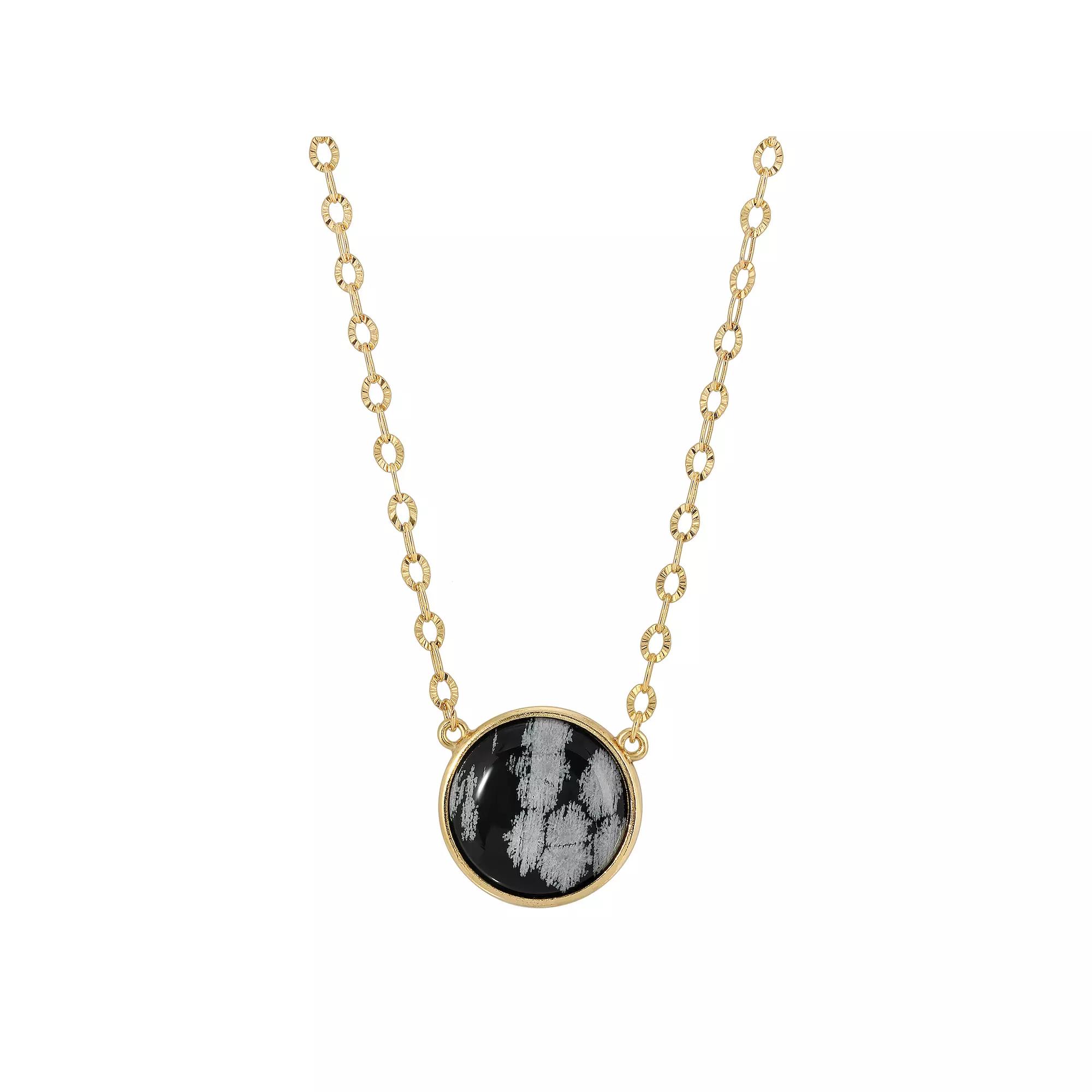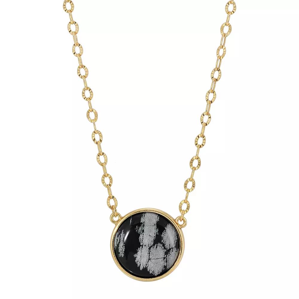 A charming combination of earth tones and classic style, this necklace features a semi-precious round cabochon on a 14K gold-dipped setting and a 14K gold dipped 16" adjustable ridge oval link chain with 1928 logo tag, a 3-inch extension chain, and lobster clasp closure for a secure fit. | 1928 Jewelry Gold Tone Round Snow Flake Obsidian 16" + 3" Adj Necklace, White