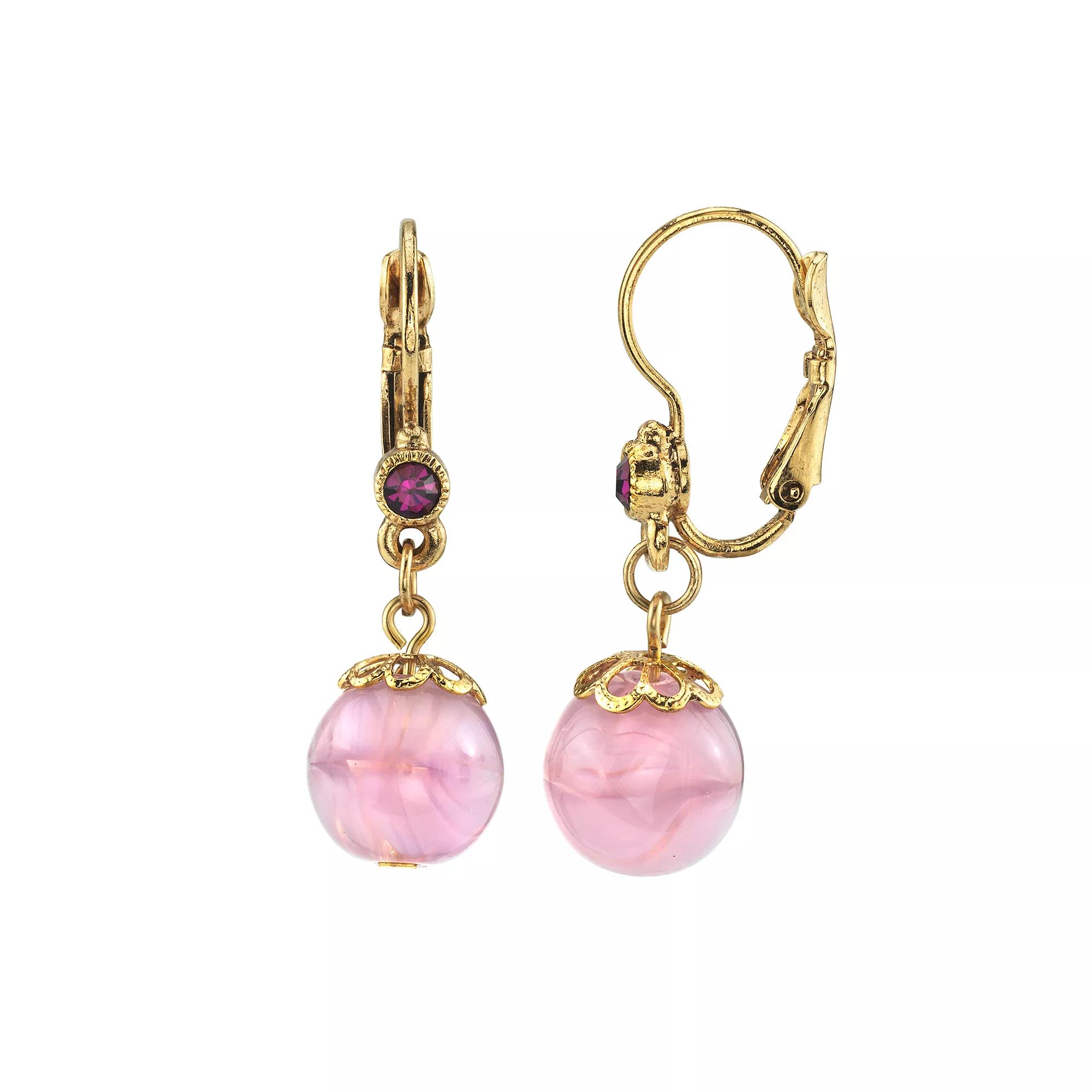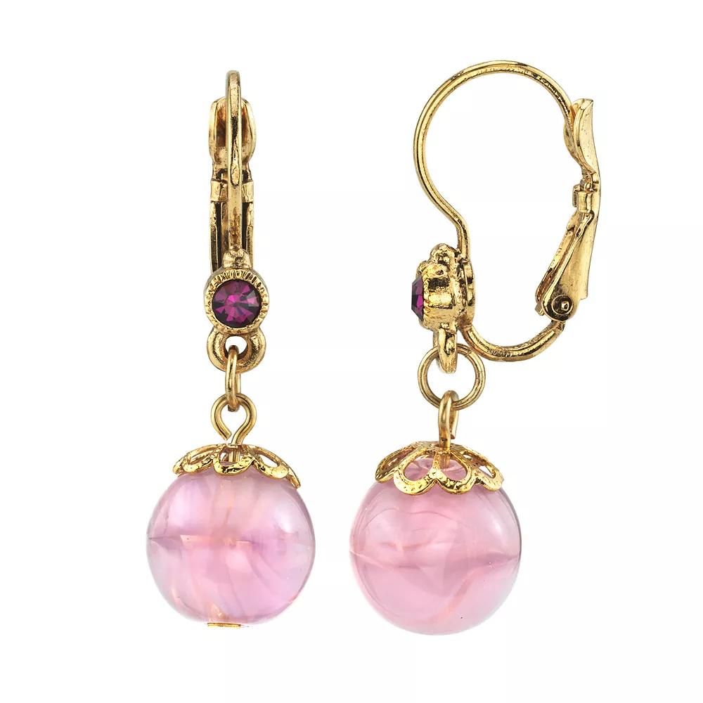 Add an amazing complement to your wardrobe with these amethyst colored ball drop earrings by 1928 Jewelry. These earrings have a lever back closure, Czech crystal accent and amethyst colored round glass stone bead to finish the look. | 1928 Jewelry Gold Tone Round Amethyst Color Drop Earrings, Purple