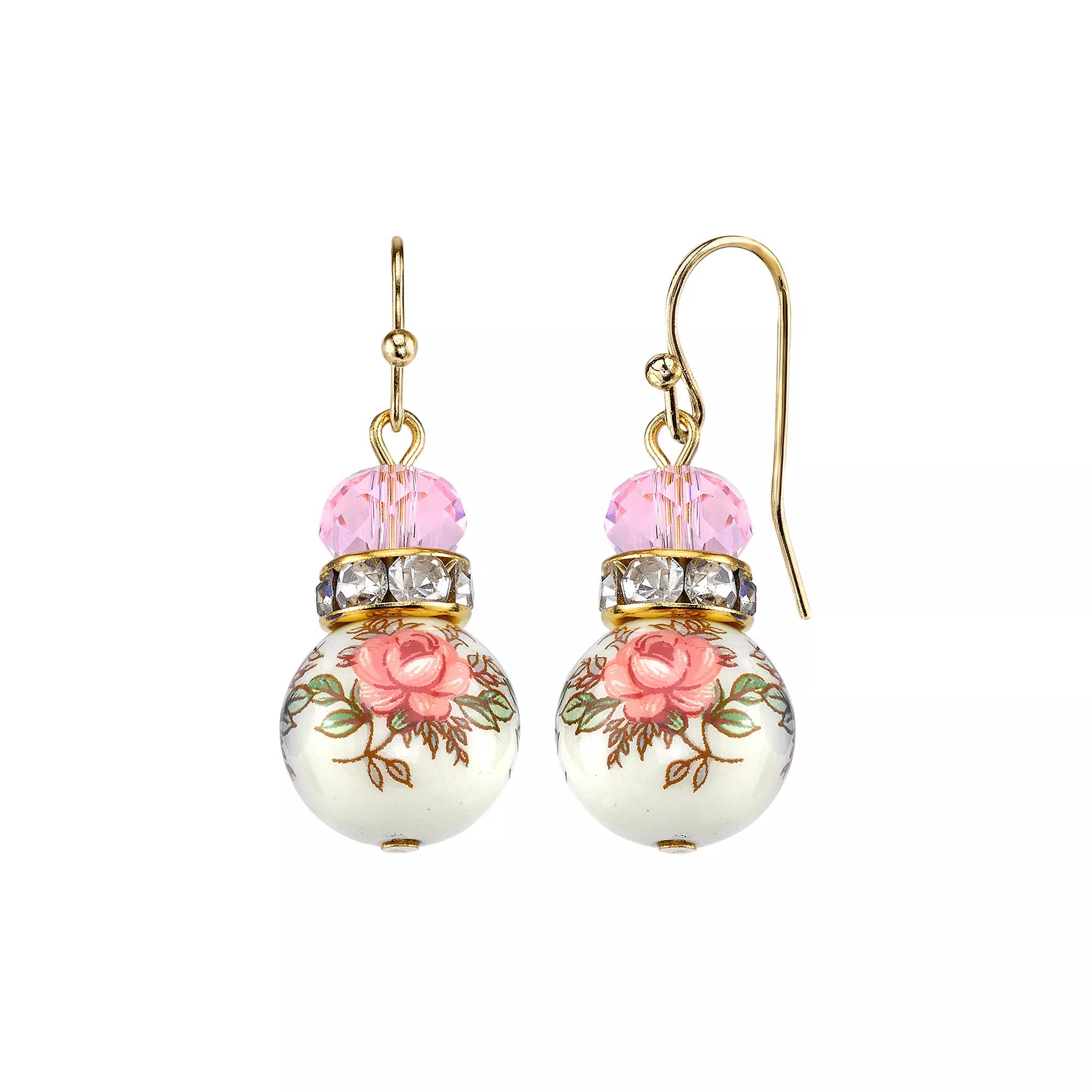 These earrings are sweet, petite and completely romantic. Featuring gold-tone multifaceted pink beads and round rose decal beads connected by crystal embellished rounded accents. | 1928 Jewelry Gold Tone Light Rose Pink And Floral Beaded Drop Earrings