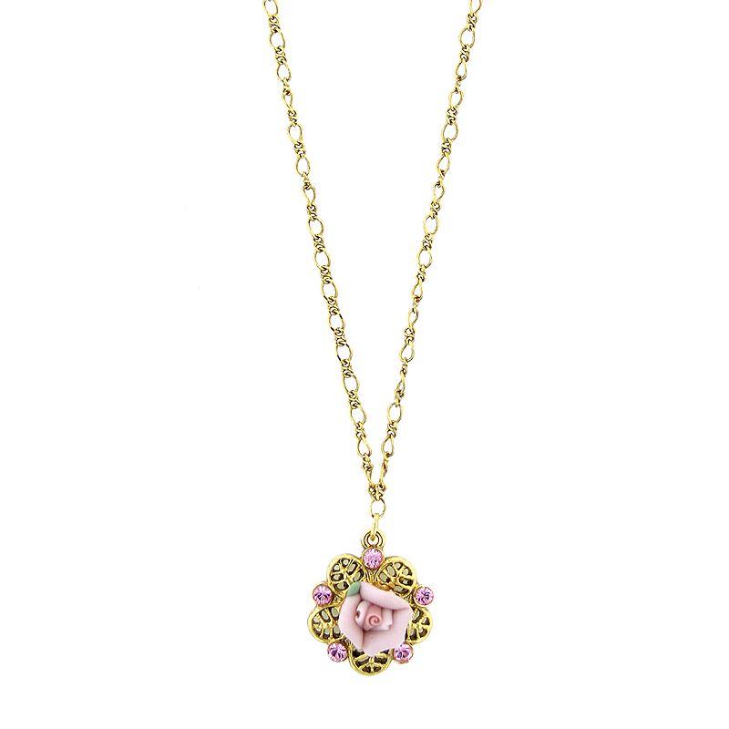 Add a vintage vibe to your jewelry collection with this gold-tone floral pendant. Necklace Details: Necklace length: 16 in. Clasp: lobster claw Metal: gold tone Stones: pink simulated crystal Model no.: 45154 Not appropriate for children 12 years old and younger. Size: One Size. Gender: female. Age Group: adult.