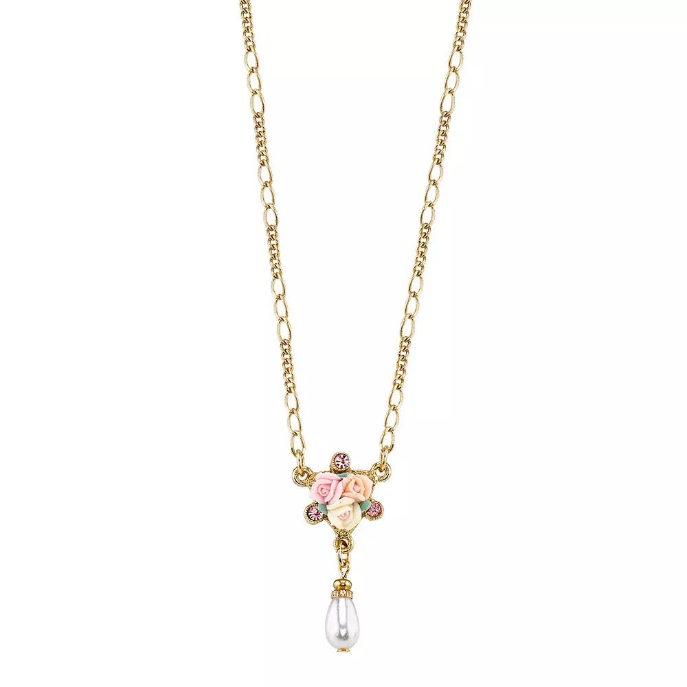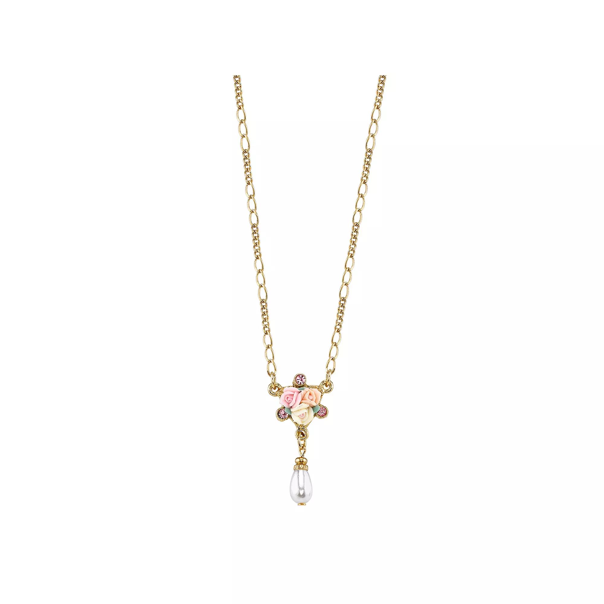 Adorned with porcelain roses, pink simulated crystals and a simulated pearl, this necklace abounds with graceful beauty. NECKLACE DETAILS Length: 16 in. with 3-in. extender Clasp: lobster-claw Plating: gold tone Model number: 49772 Not appropriate for children 14 years old and younger. Size: 16". Color: Multicolor. Gender: female. Age Group: adult.