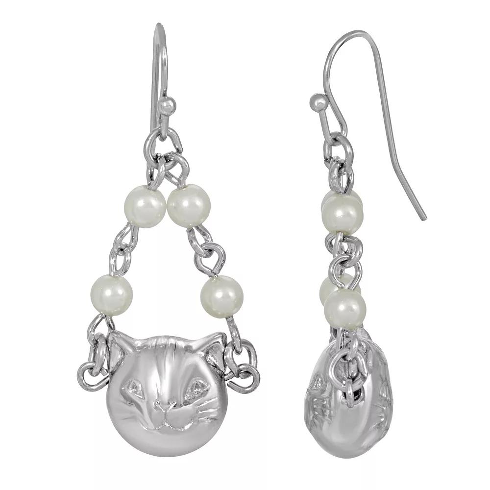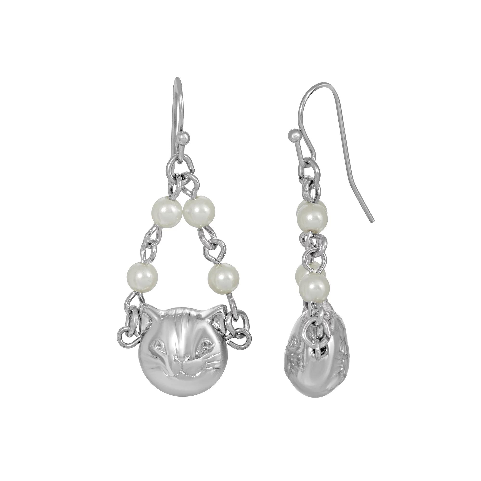 Celebrate a delightful and playful feline with our set of cat lover's earrings featuring cat head charms suspended on silver-tone chains adorned with fashion pearl beads. Celebrate a delightful and playful feline with our set of cat lover's earrings featuring cat head charms suspended on silver-tone chains adorned with fashion pearl beads. EARRING DETAILS Length: 1.6 in. Backings: fishhook Metal: alloy Plating: silver tone Finish: polished Not appropriate for children 14 years old and younger. Size: One Size. Color: White. Gender: female. Age Group: adult.