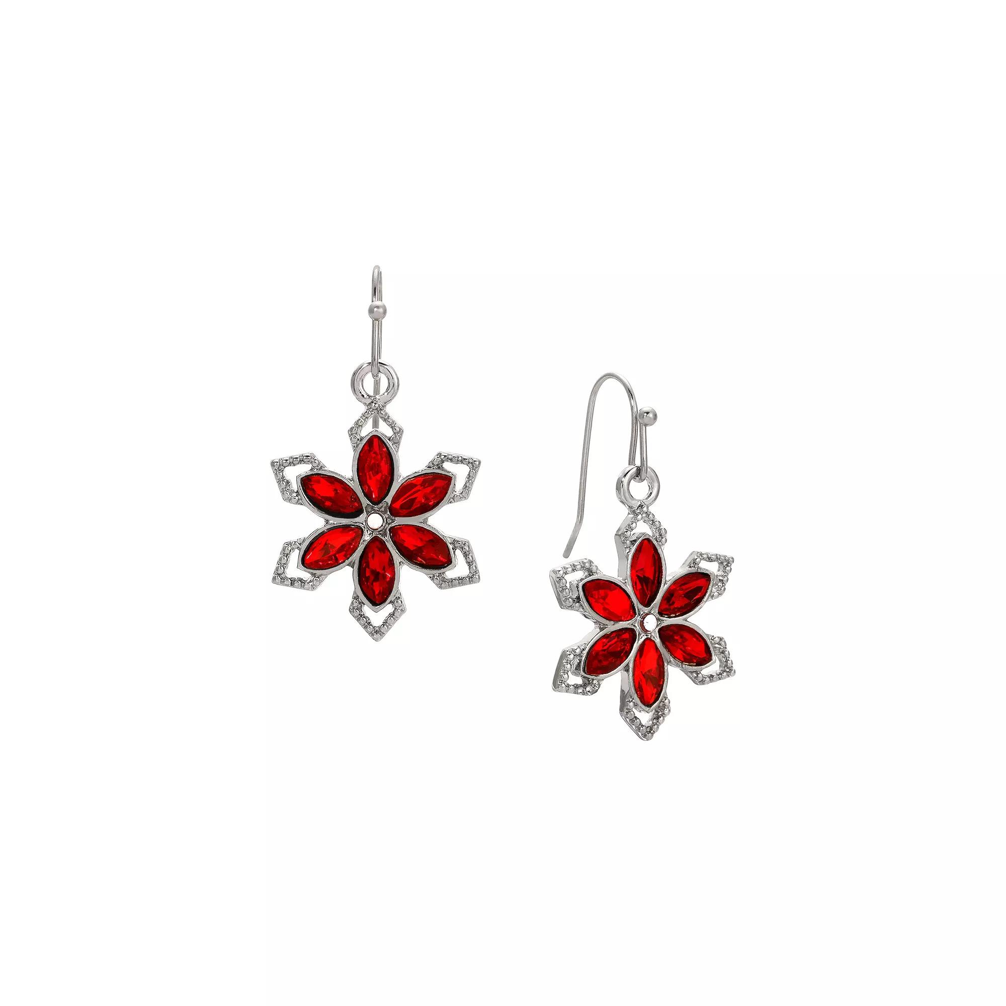 Accessorize in style with these 1928 silver tone crystal flower wire earrings. Accessorize in style with these 1928 silver tone crystal flower wire earrings. FEATURES Dimensions: 34.29 mm x 21.59 mm Backings: fishhook Nickel safe Metal: alloy Material: crystal Plating: silver tone Finish: polished Not appropriate for children 14 years old and younger. Size: One Size. Color: Red. Gender: female. Age Group: adult.