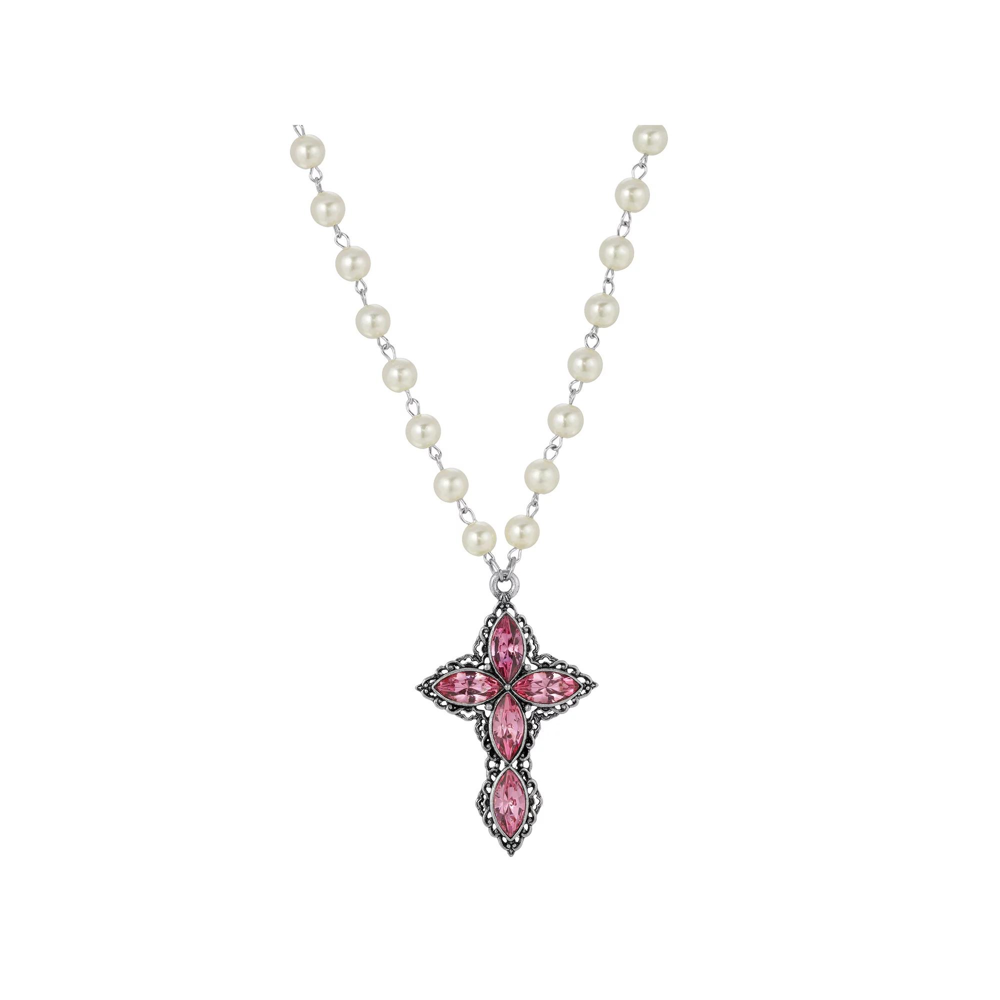 Show off your spiritual side with this beautiful 1928 Crystal Diamond Shaped Stones Cross Simulated Pearl Necklace. Show off your spiritual side with this beautiful 1928 Crystal Diamond Shaped Stones Cross Simulated Pearl Necklace. DETAILS Pendant length: 2.5 in. 16 in.-30 in. with 3 in. extender Clasp: lobster-claw Metal: alloy Plating: silver tone Finish: polished Not appropriate for children 14 years old and younger. Size: One Size. Color: Pink. Gender: female. Age Group: adult.