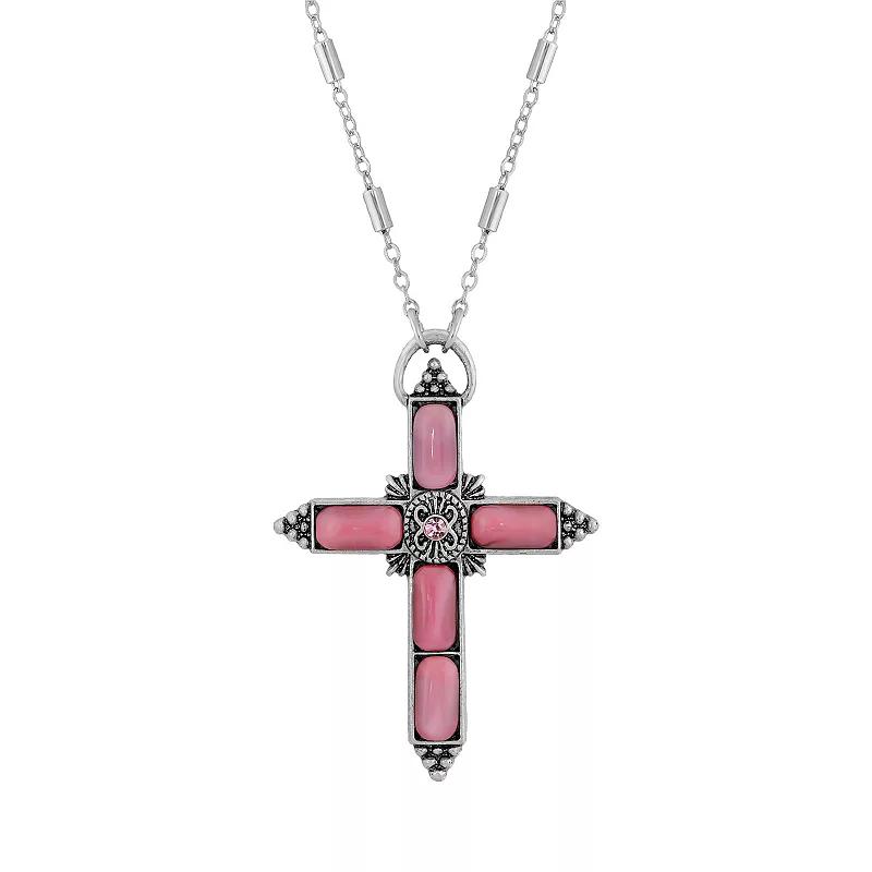 This stunning silver-tone and pink cross necklace is a spiritual fashion statement. This stunning silver-tone and pink cross necklace is a spiritual fashion statement. NECKLACE DETAILS Pendant length: 2.1 in. Chain length: 20 in. Clasp: lobster-claw Metal: alloy Plating: silver tone Finish: polished Stone: moonstone Not appropriate for children 14 years old and younger. Size: One Size. Gender: female. Age Group: adult. Material: Silver Plate.