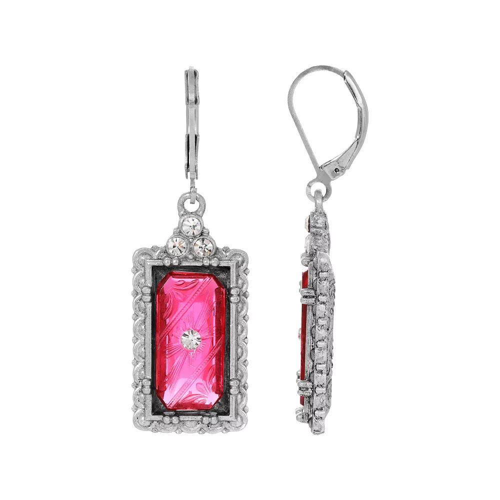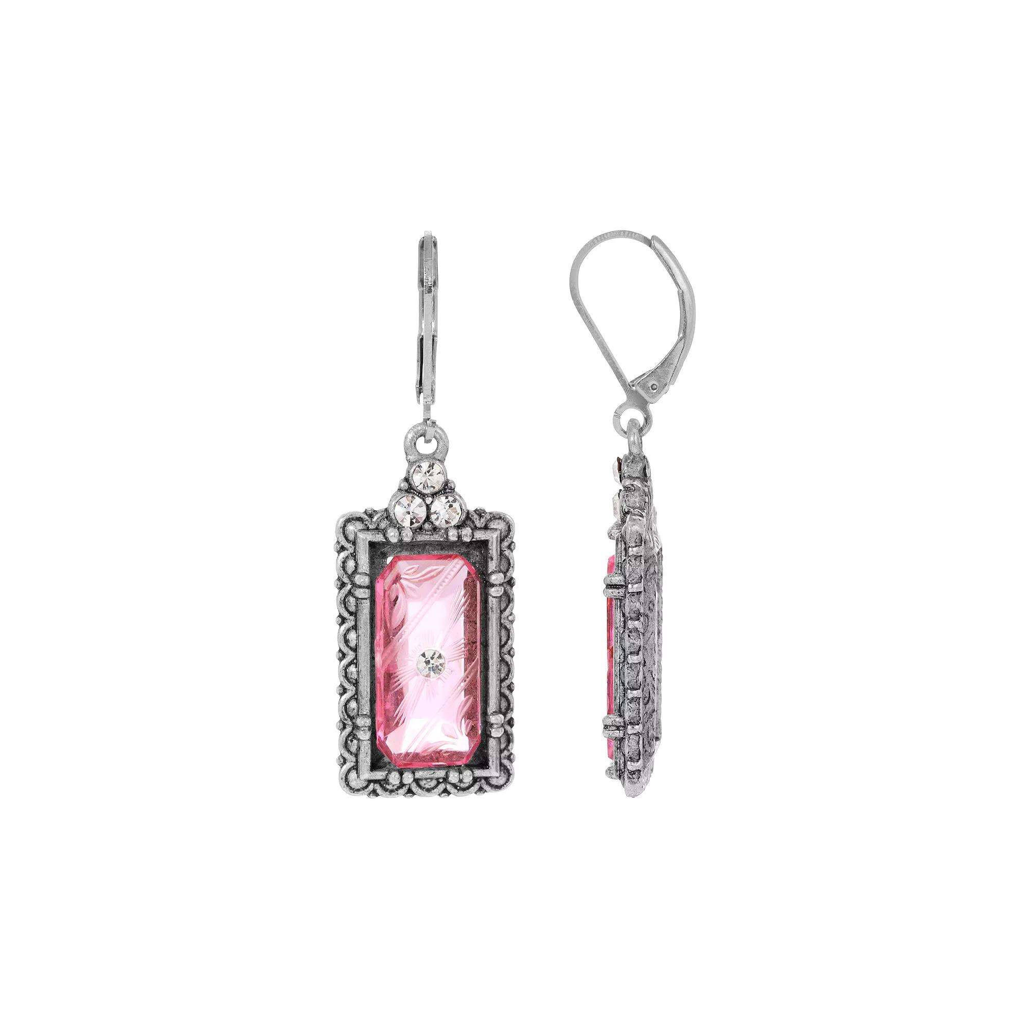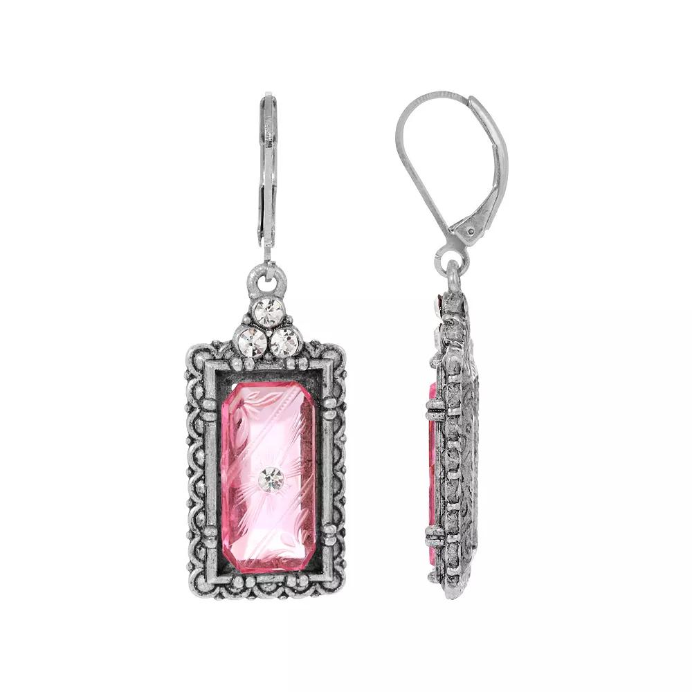 Brilliant and bold, these statement earrings are sure to impress in any setting. Featuring antiqued pewter rectangular framework with transparent etched glass stones, accented with a clear crystals. These earrings are made with lever back settings. | 1928 Jewelry Pewter/silver Tone Light Rose And Crystal Stone Earrings, Fuchsia, No Size